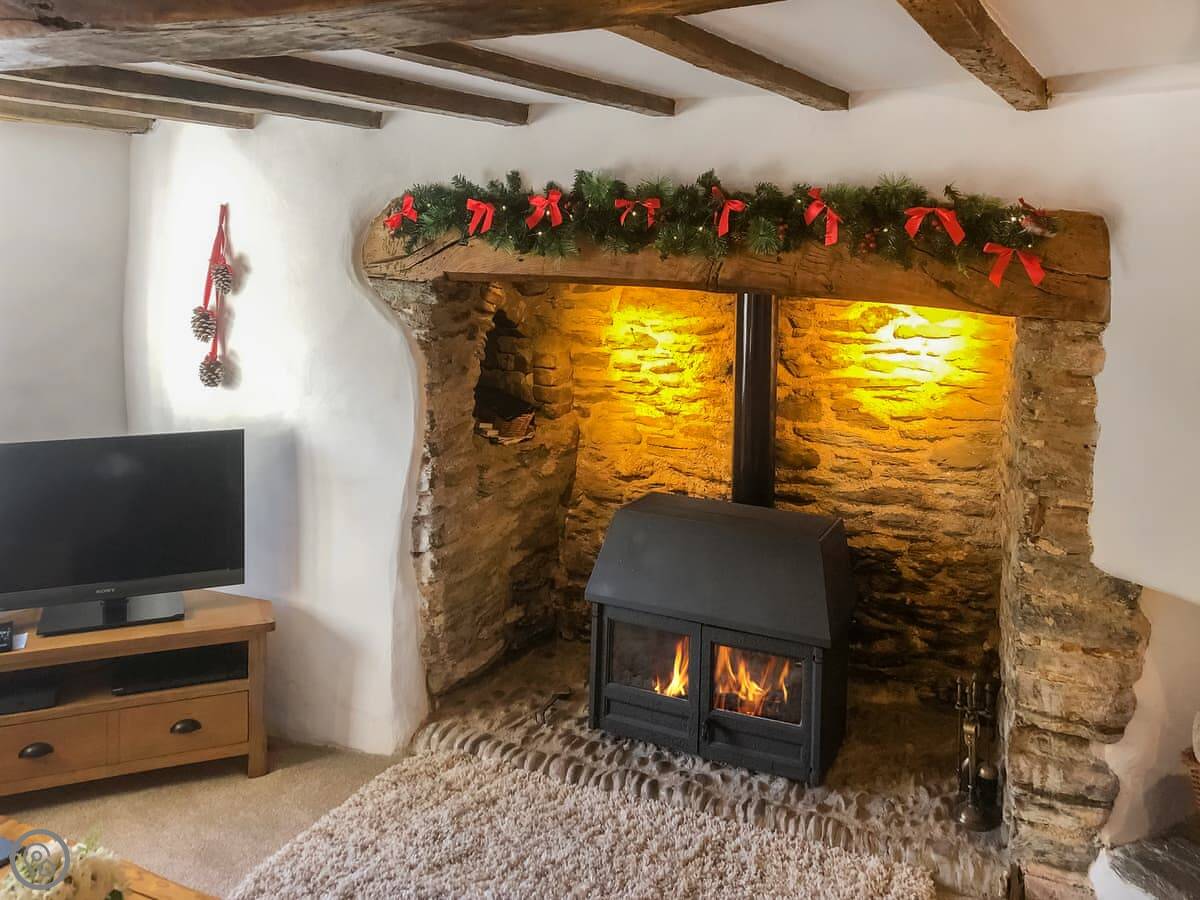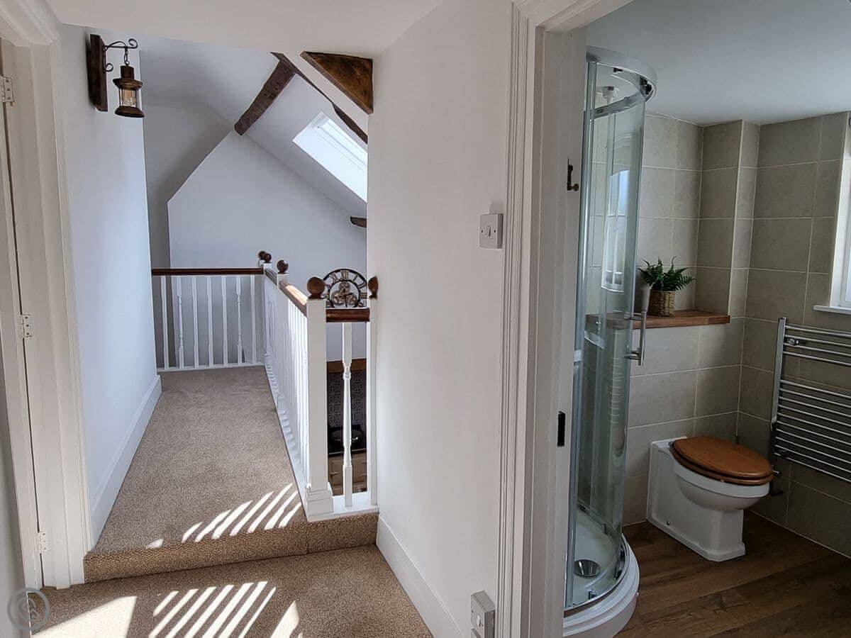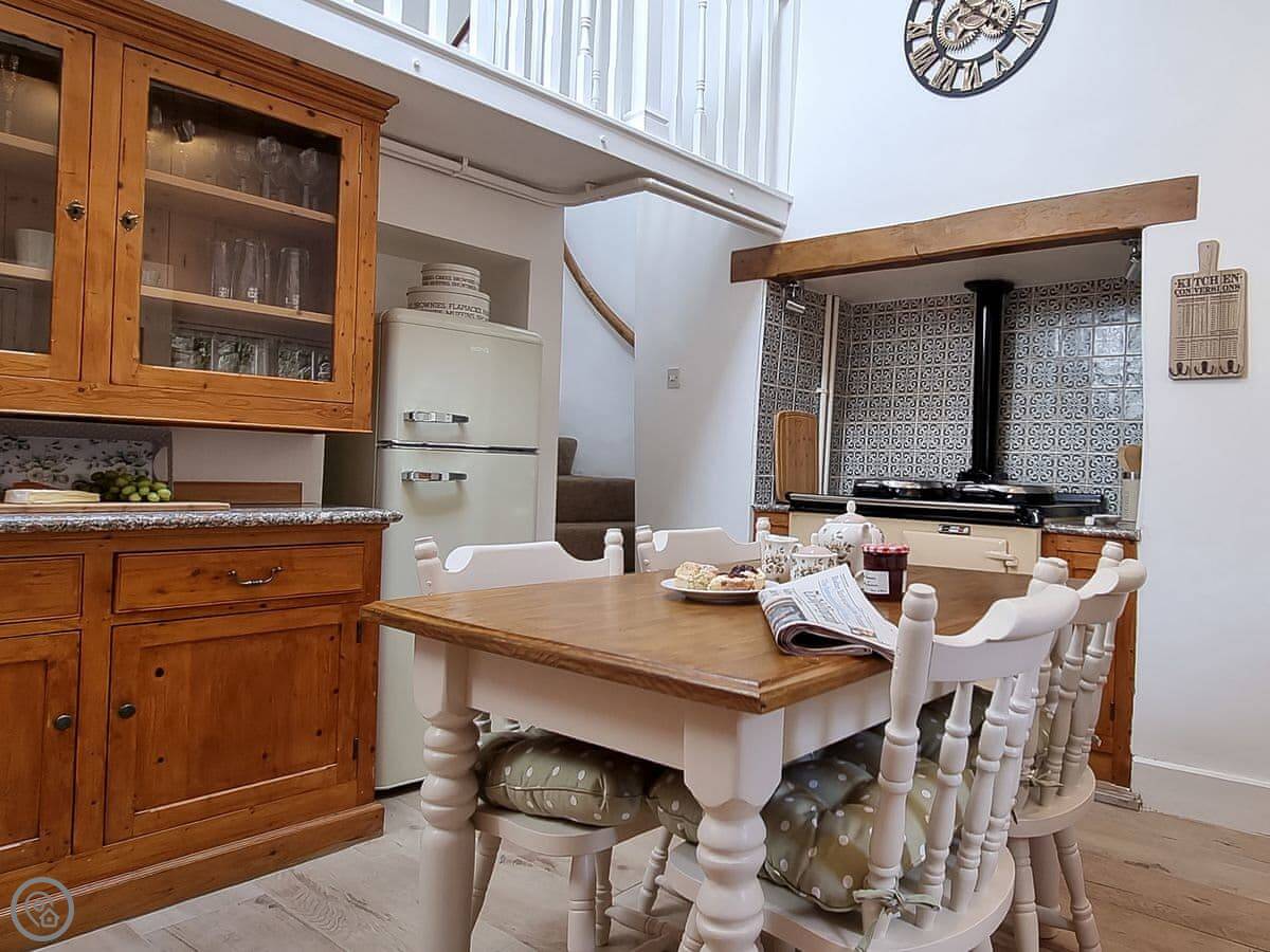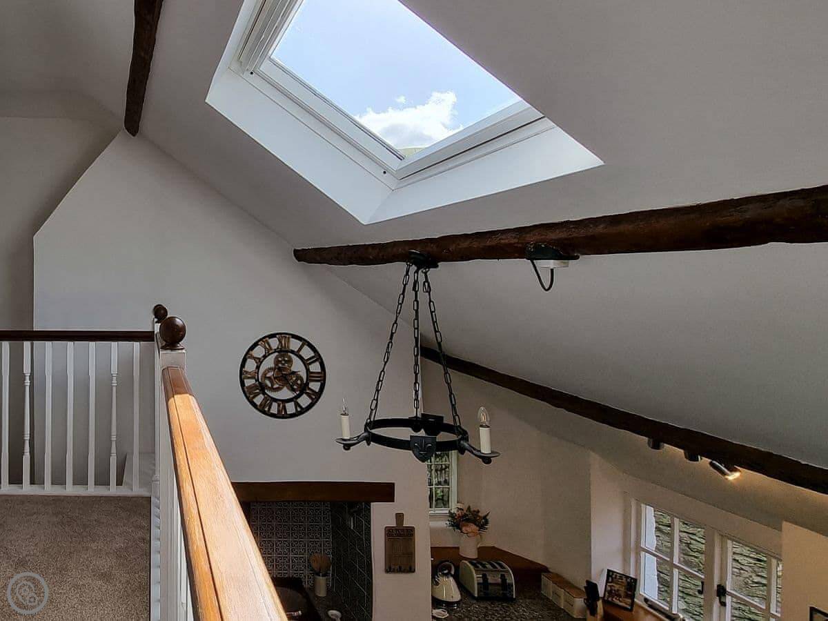 It's got a 5 Star rating, which means it's well-equipped and finished to a high standard. There's a wood burning stove in the main living room, which is a nice feature. The stairs from the kitchen up to the bedrooms are a bit narrow and curved, so you need to be careful. There's also a step down into each bedroom from the landing.