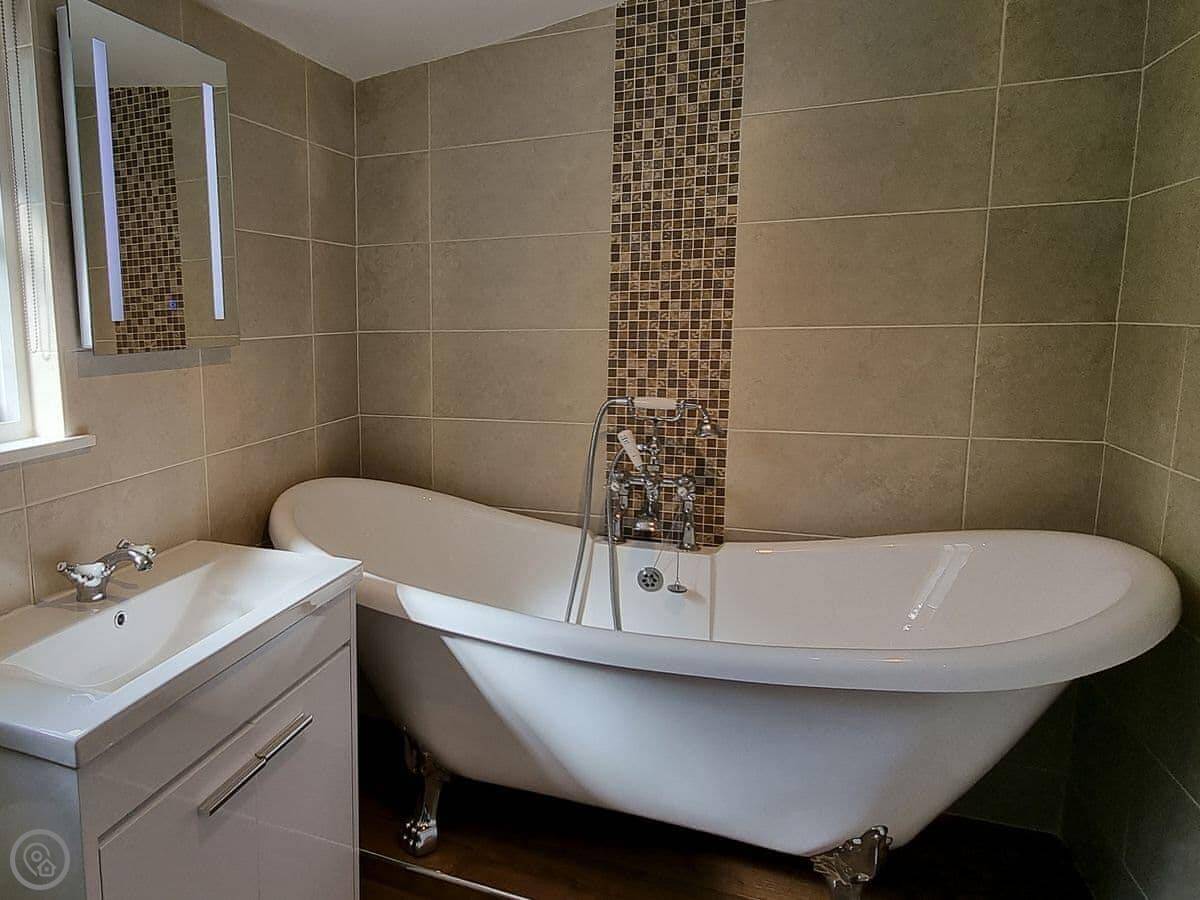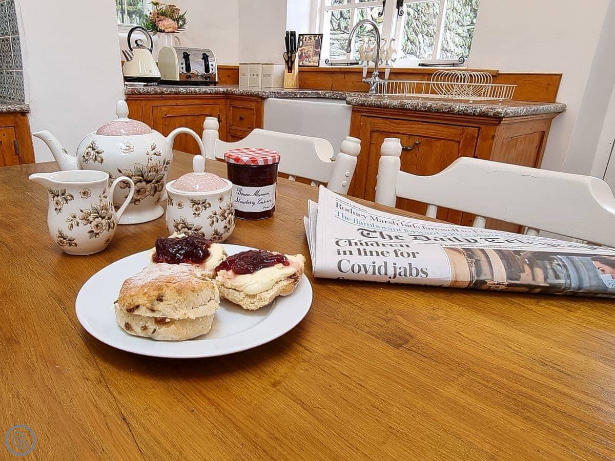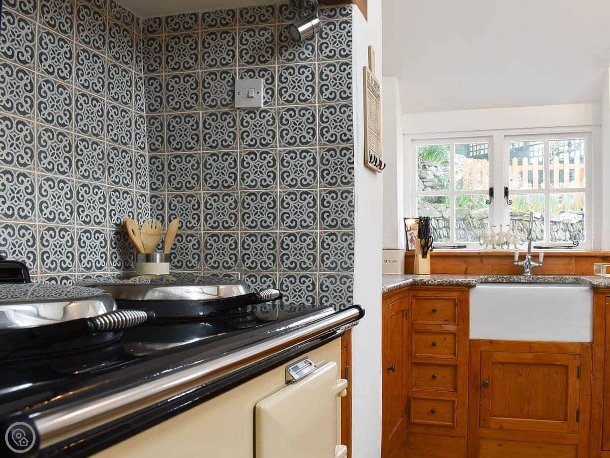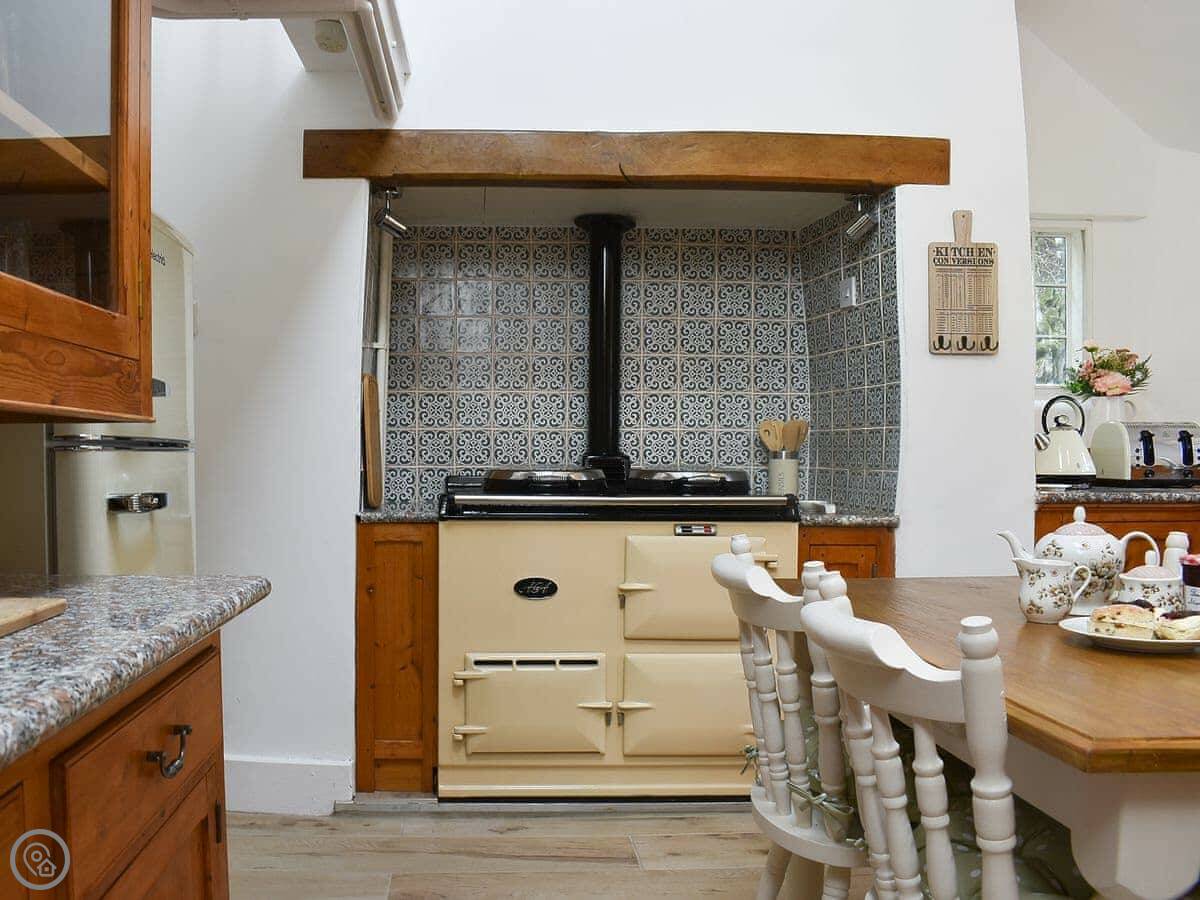 It's got a 5 Star rating, which means it's well-equipped and finished to a high standard. There's a wood burning stove in the main living room, which is a nice feature. The stairs from the kitchen up to the bedrooms are a bit narrow and curved, so you need to be careful. There's also a step down into each bedroom from the landing.