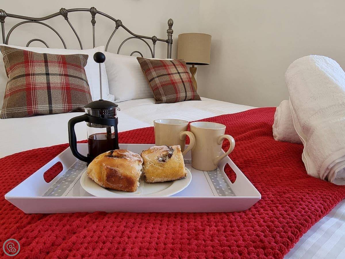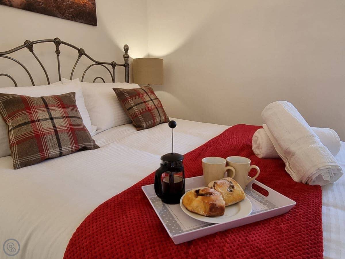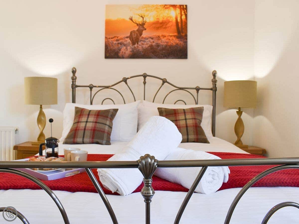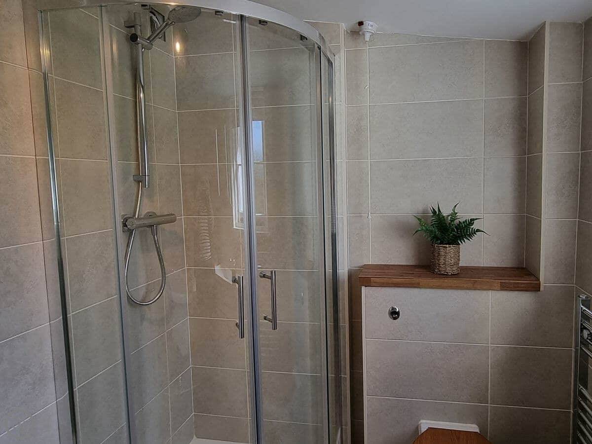 It's got a 5 Star rating, which means it's well-equipped and finished to a high standard. There's a wood burning stove in the main living room, which is a nice feature. The stairs from the kitchen up to the bedrooms are a bit narrow and curved, so you need to be careful. There's also a step down into each bedroom from the landing.