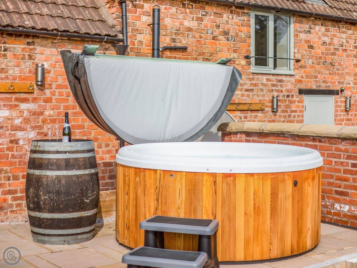 Outside, there's a private patio with a hot tub. You can park right there.