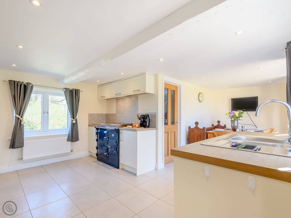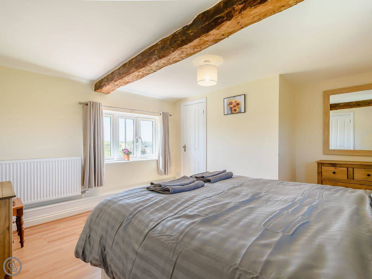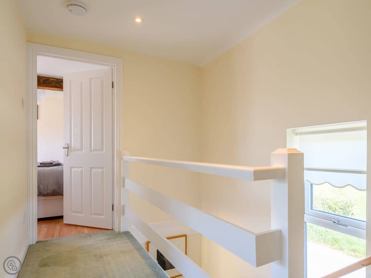 It's a converted barn, detached, and sits in its own garden. You get good views over the fields. It sleeps six. Three bedrooms, two doubles and a twin room, and there's a family bathroom downstairs. There's also a separate shower room. It has a 4 Star rating, so it's comfortable and well-equipped.