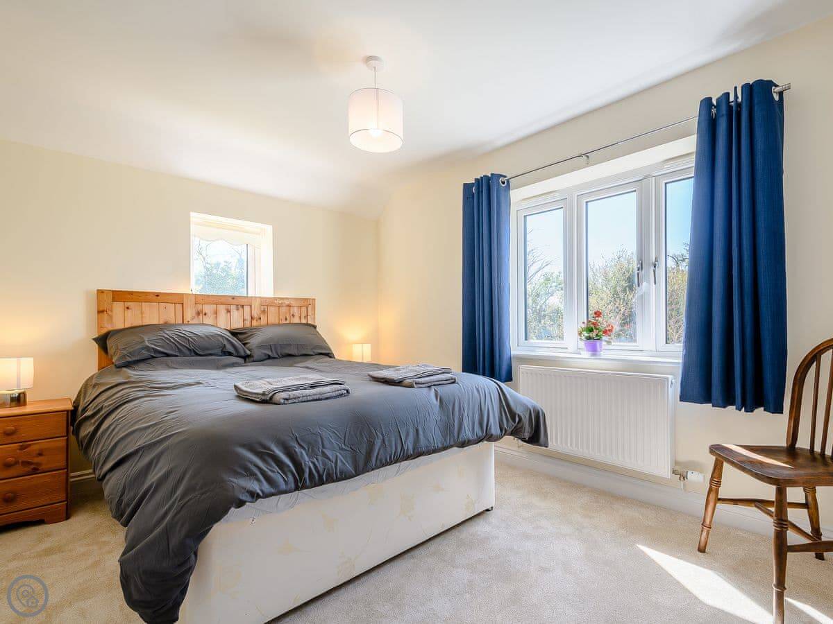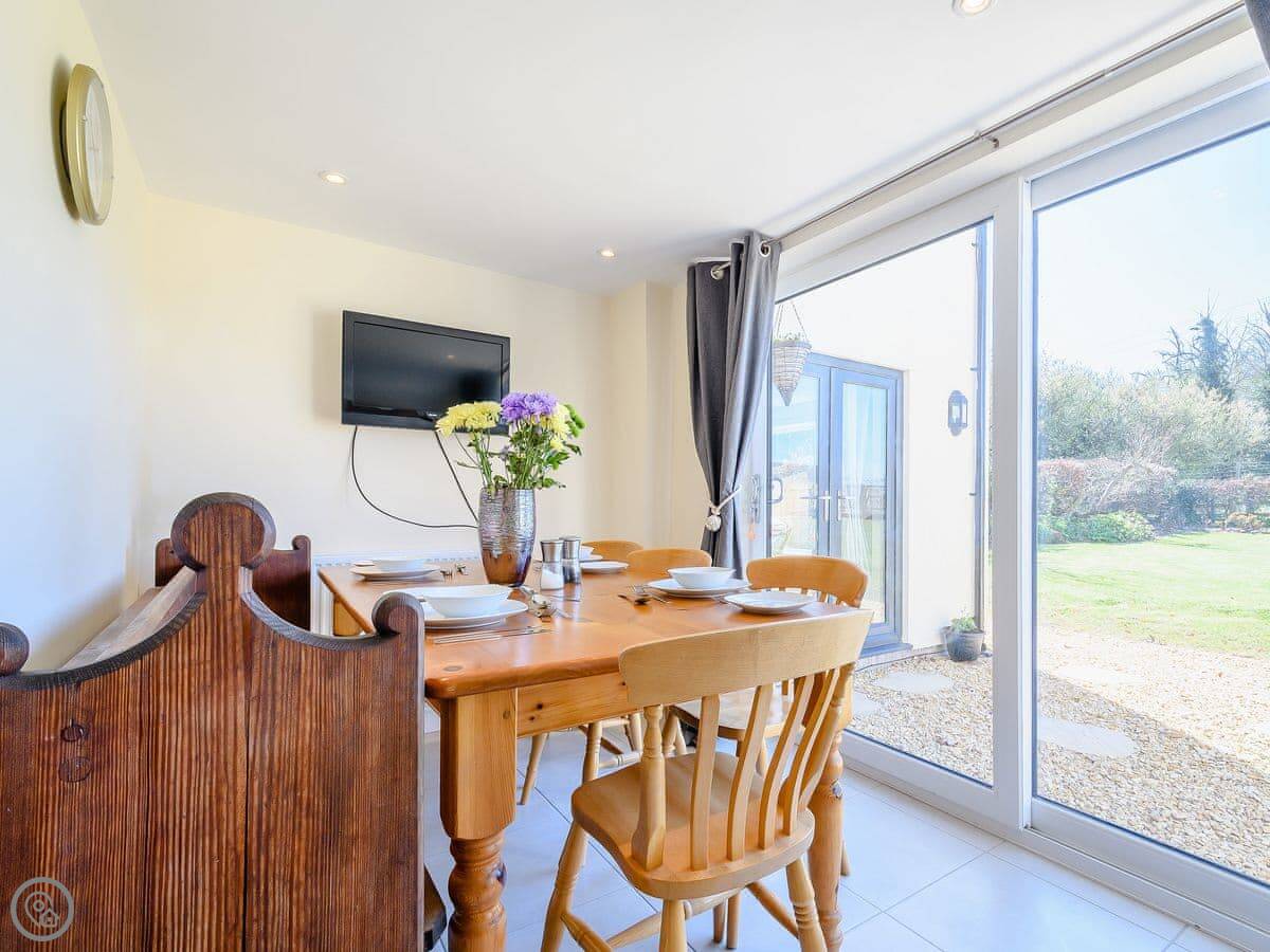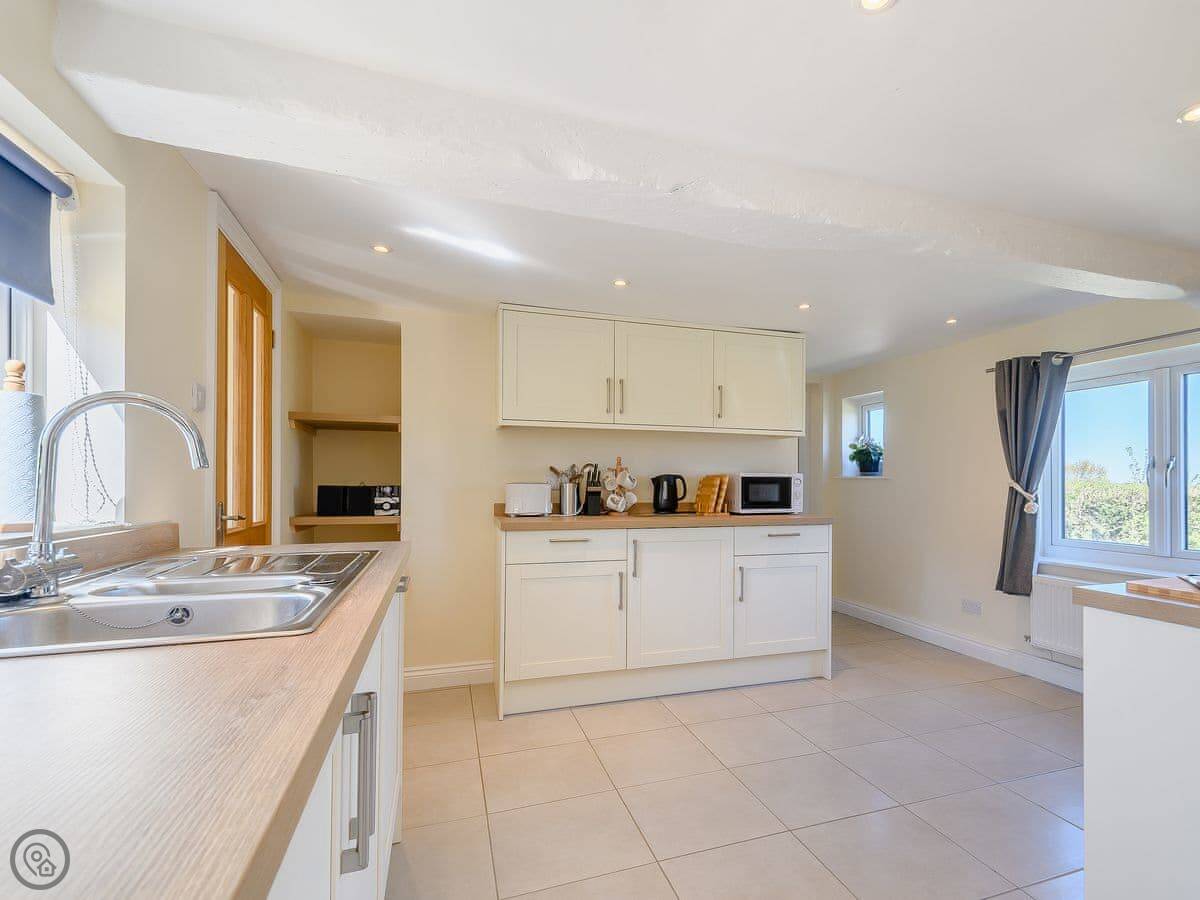 It's a converted barn, detached, and sits in its own garden. You get good views over the fields. It sleeps six. Three bedrooms, two doubles and a twin room, and there's a family bathroom downstairs. There's also a separate shower room. It has a 4 Star rating, so it's comfortable and well-equipped.