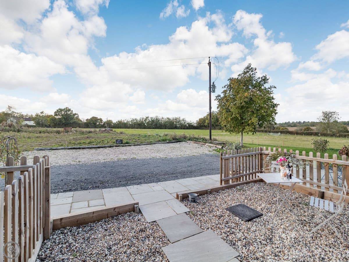 Outside, there’s a private patio with a table and chairs. It looks out over the fields. It’s not walled in, so the views are open. You access it via our gravel driveway. There’s on-site parking.