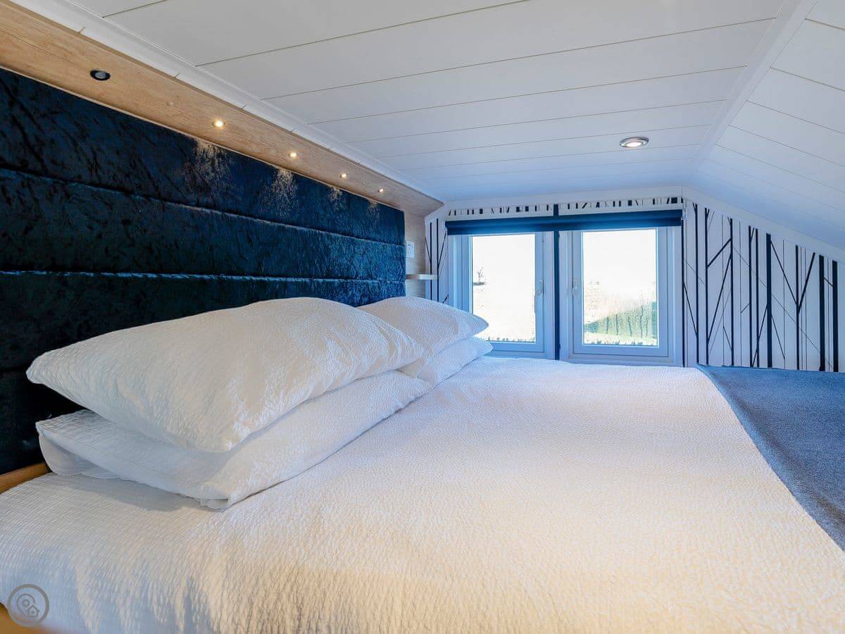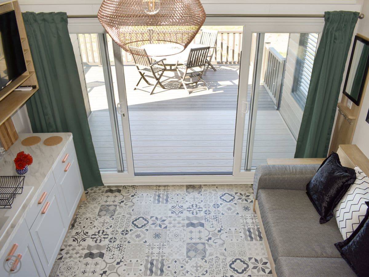 Inside the stylish open plan living area is a large L-shaped sofa bed, blue tooth speaker and 40” Smart TV to ensure you are comfortable and well entertained. There is a modern fitted kitchen that leads through to the cabin style dining area. Off to bed and there are a variety of sleeping options. Ideally sleeping up to four people, there is a galleried sleeping area with double or twin beds, accessed by open-tread stairs. The living area sofa bed makes into a double bed and the dining area has a pull-down bed. From the living area, the huge patio doors bring the outside in and boast spectacular views over the Weardale valley. The decked area has comfortable seating and what better place to sit at the end of the day with your glass of wine.