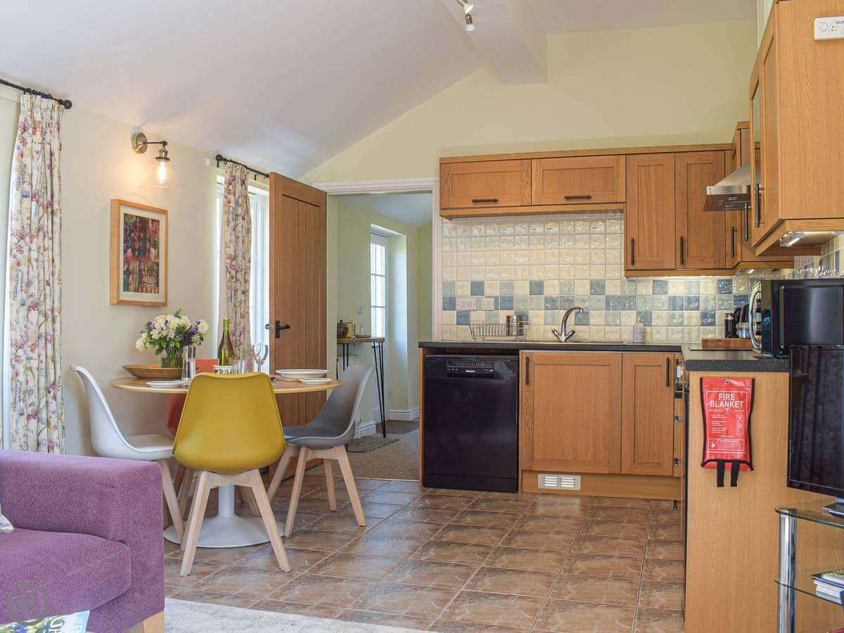 It's a 4 Star place, so it's comfortable and well finished. Everything's on one level, which is handy. The main room is open plan, with a sofa, a wood burner, and a kitchen area. The kitchen has a dishwasher, washing machine, and one of those Nespresso coffee machines. The bedroom has a kingsize bed and some built-in wardrobes.