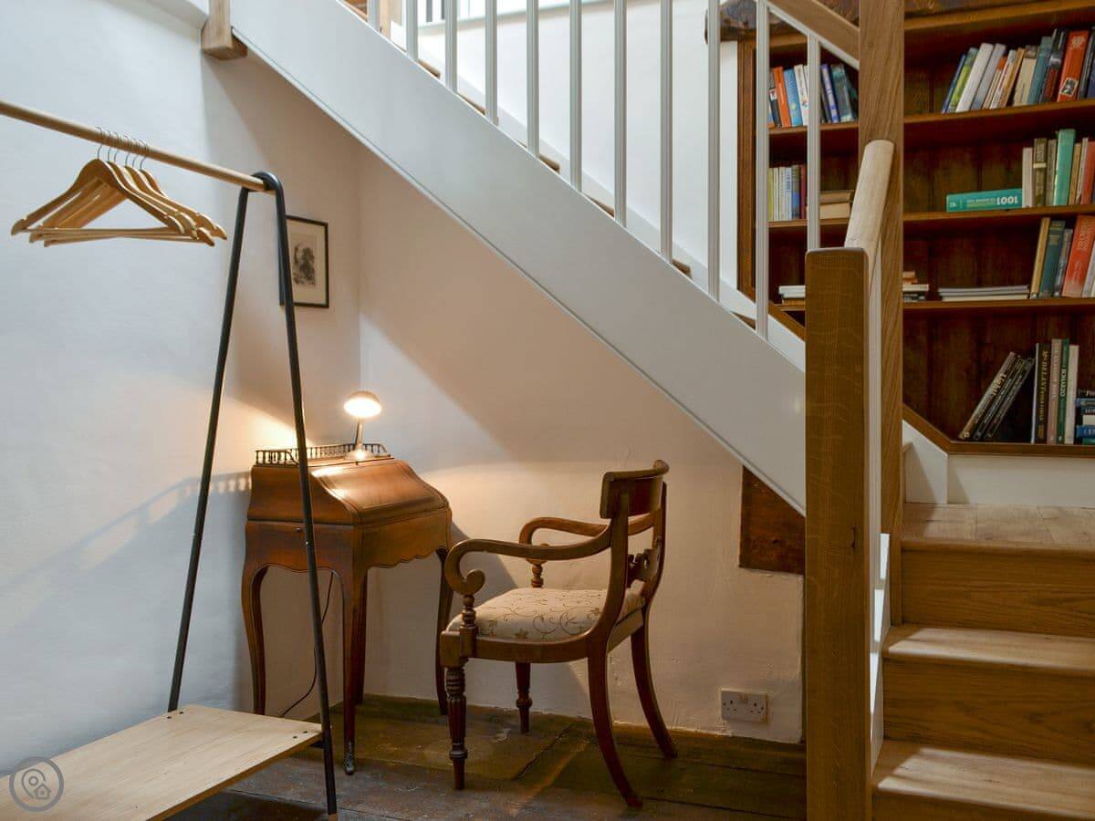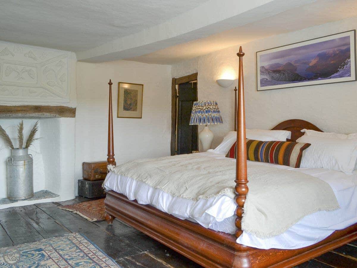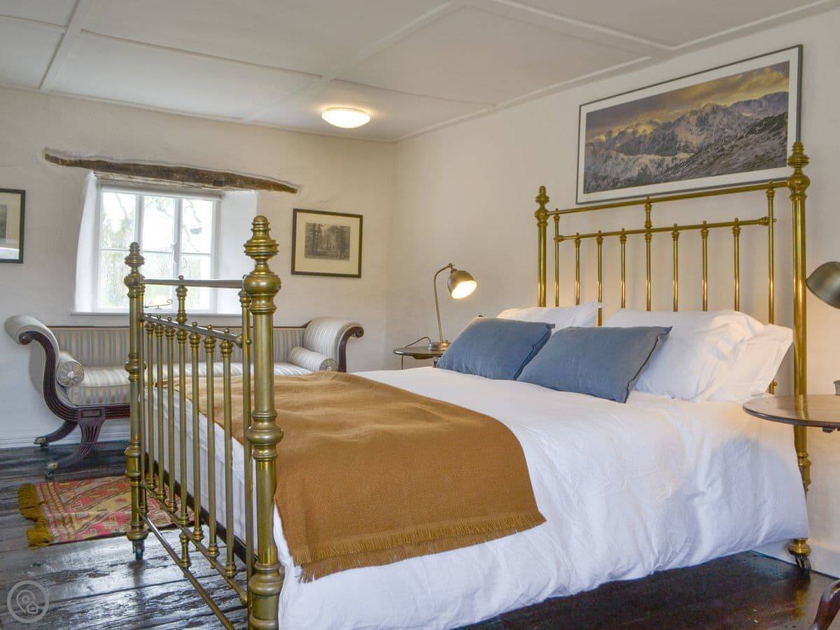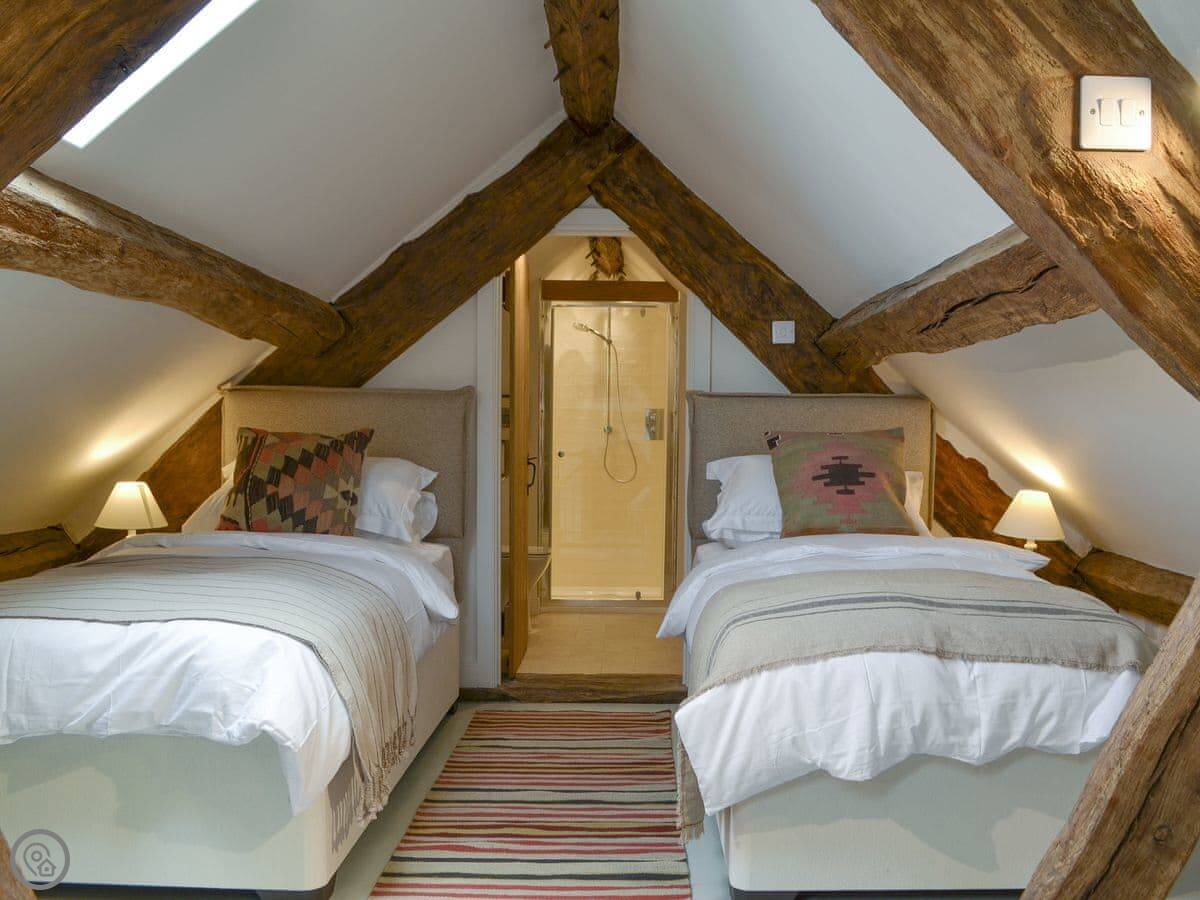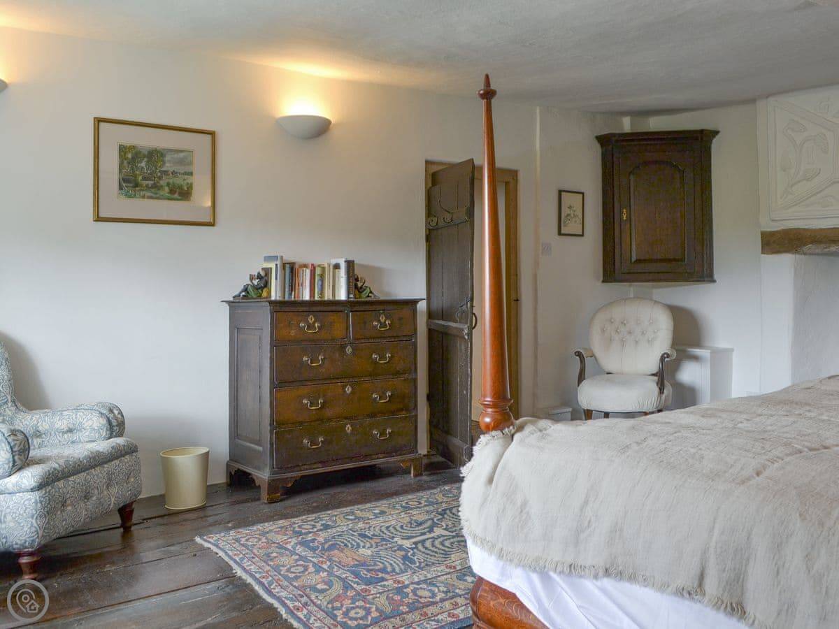 It sleeps eight people. There are four bedrooms and three bathrooms. Two of the bedrooms have their own bathrooms. The master bedroom has a four-poster bed, which is nice but just mind your head. The stairs are normal for an old house. It's a 5 Star property, which means it's been done to a high standard.