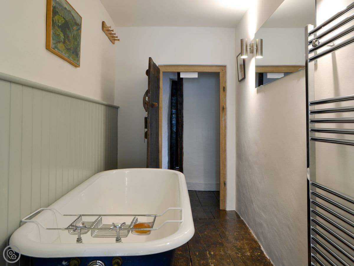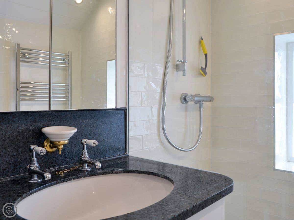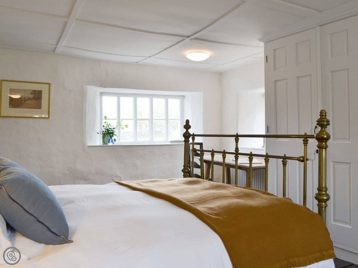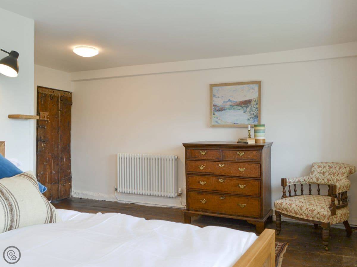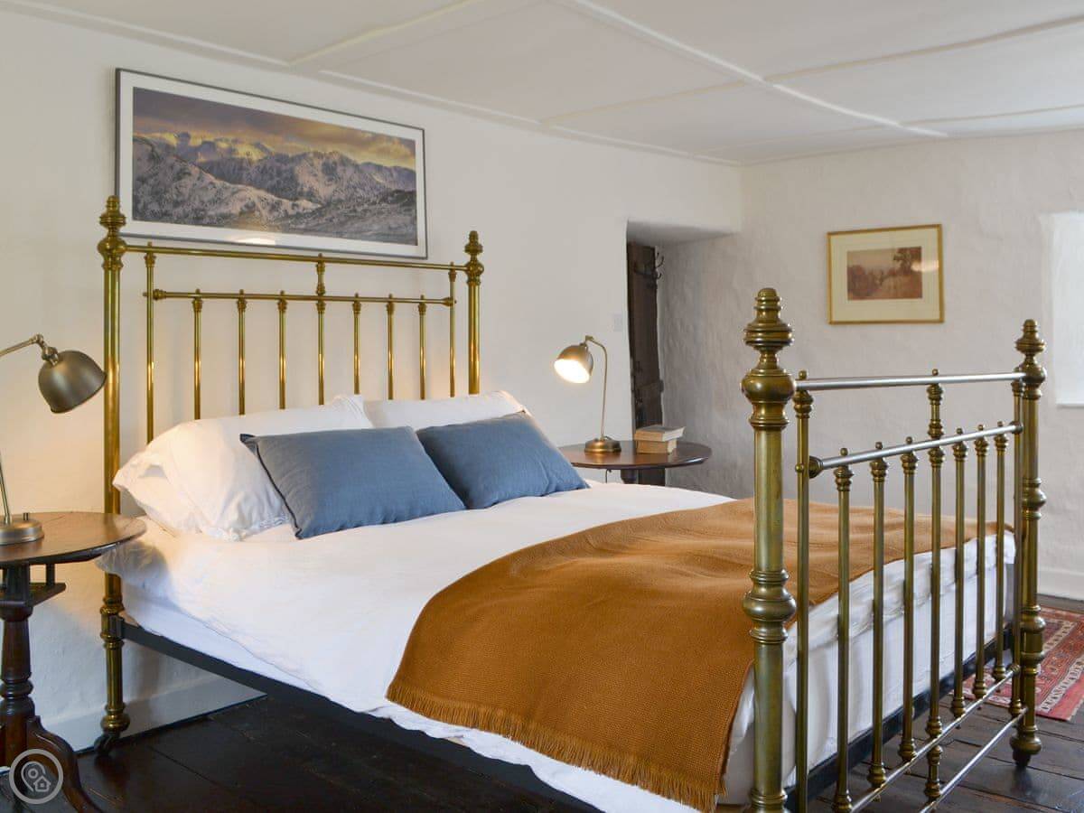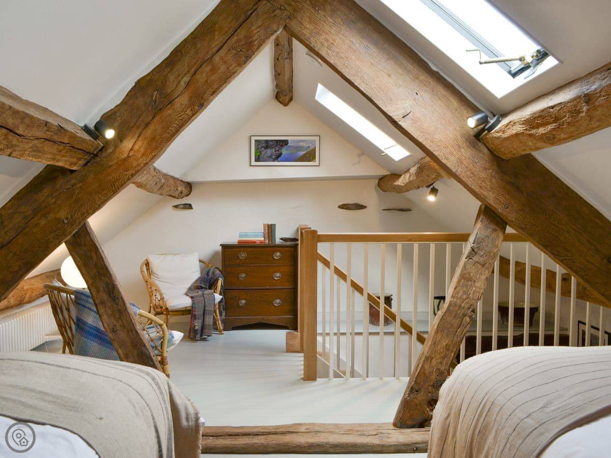 It sleeps eight people. There are four bedrooms and three bathrooms. Two of the bedrooms have their own bathrooms. The master bedroom has a four-poster bed, which is nice but just mind your head. The stairs are normal for an old house. It's a 5 Star property, which means it's been done to a high standard.