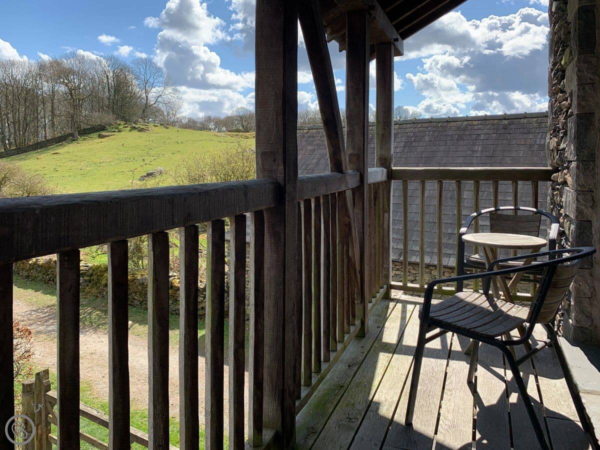 Outside, there's a small balcony with a table and chairs. It looks out over the gardens towards the Kentmere Valley.