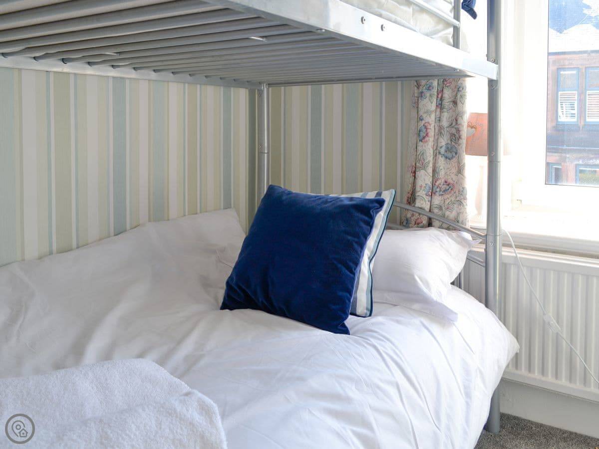 It sleeps six, in four bedrooms. There's one bathroom. It's been updated so everything works, but it still feels like an old house. The rooms are all very big, with high ceilings. The front rooms have bay windows.