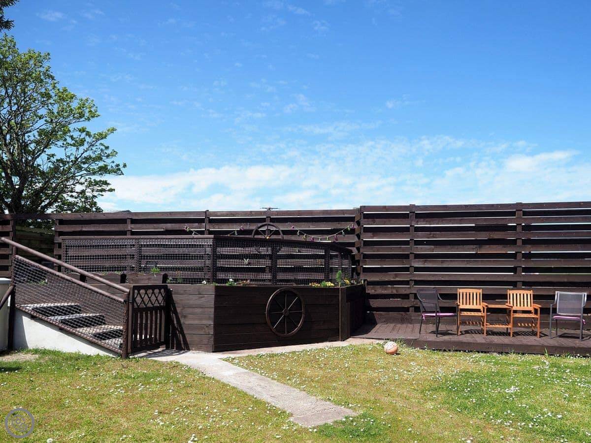 The living room is on the first floor to get the best of the view. There's a big window. The kitchen is on the ground floor, it's a good size for everyone to sit around. Outside, there's a garden with a lawn and a decked bit with seating.