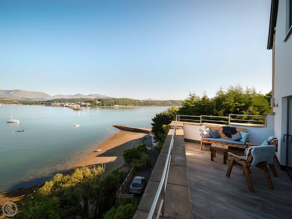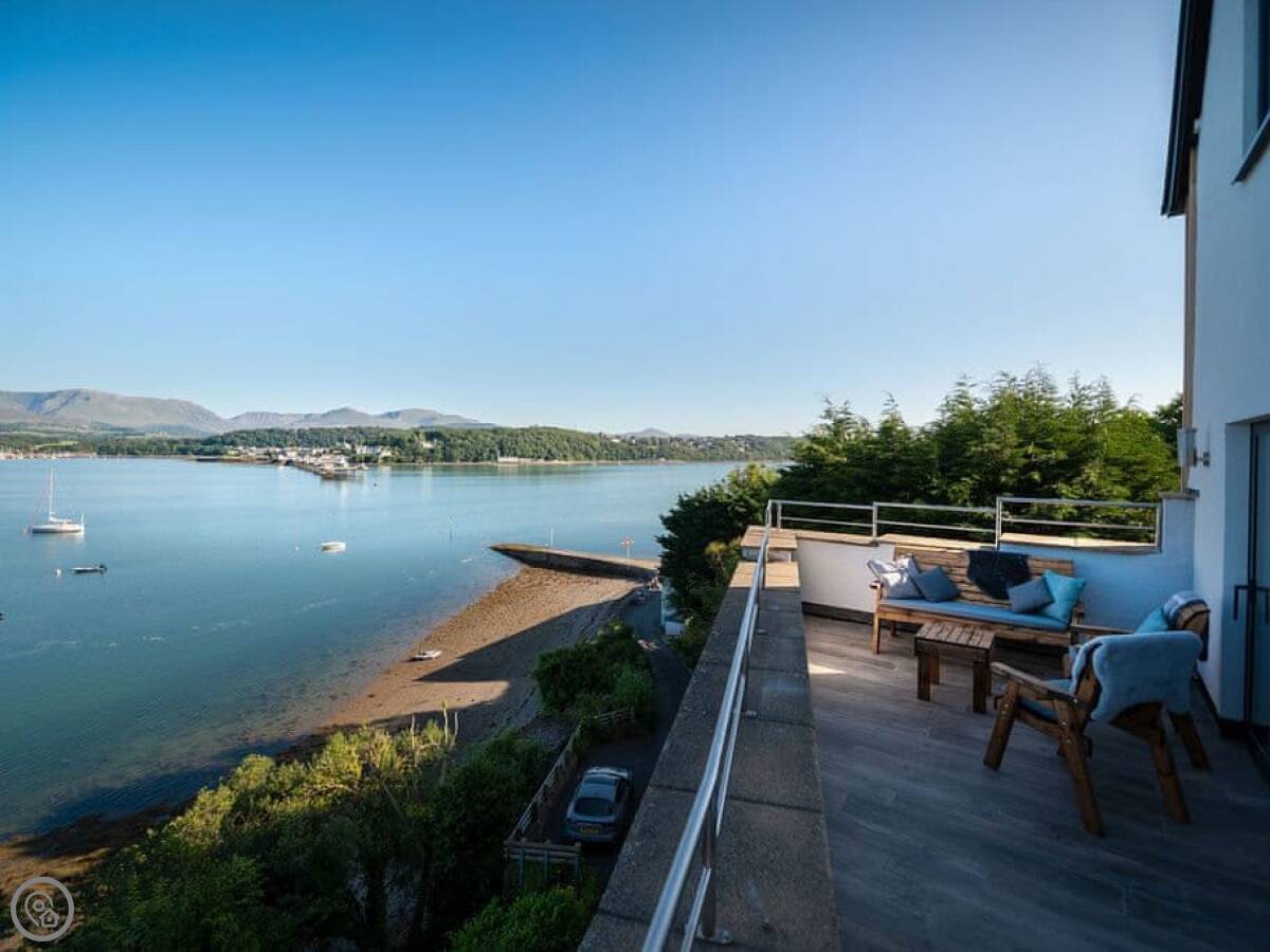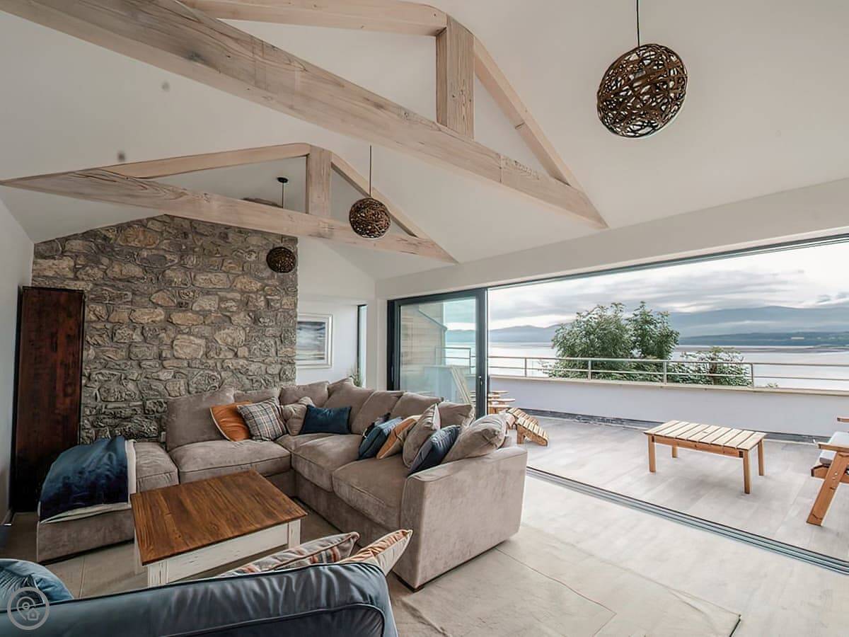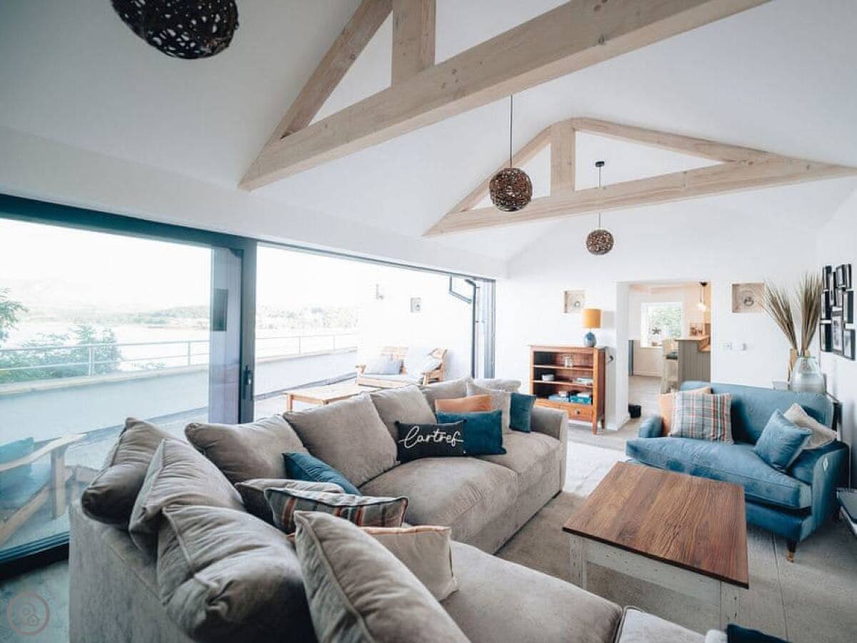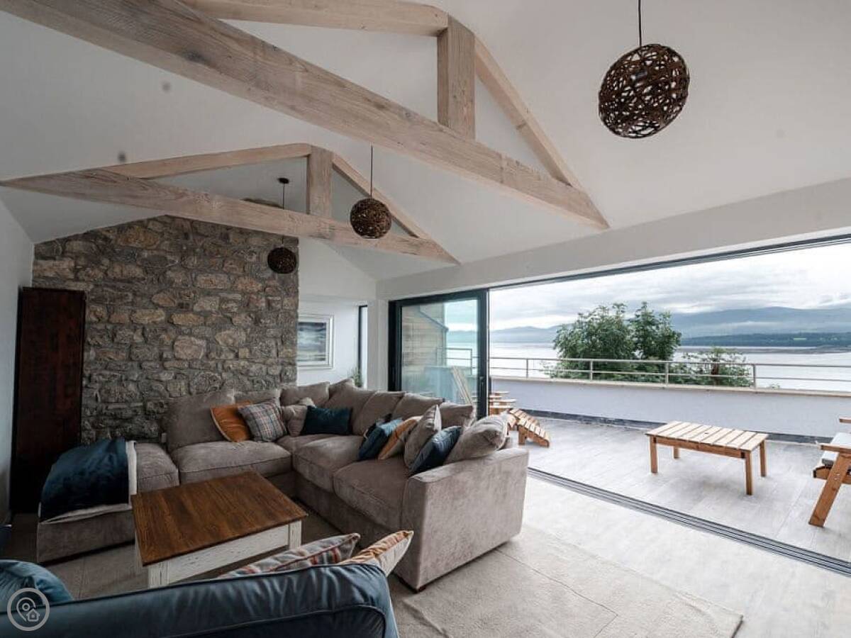 It has a 5 Star rating. That's because it's been fully refurbished. It's a modern standard inside. The main living area is open-plan. The ceiling is high with a vaulted beam. You get a good view from there. You can see the Menai Strait and the mountains.