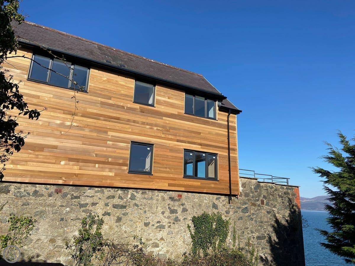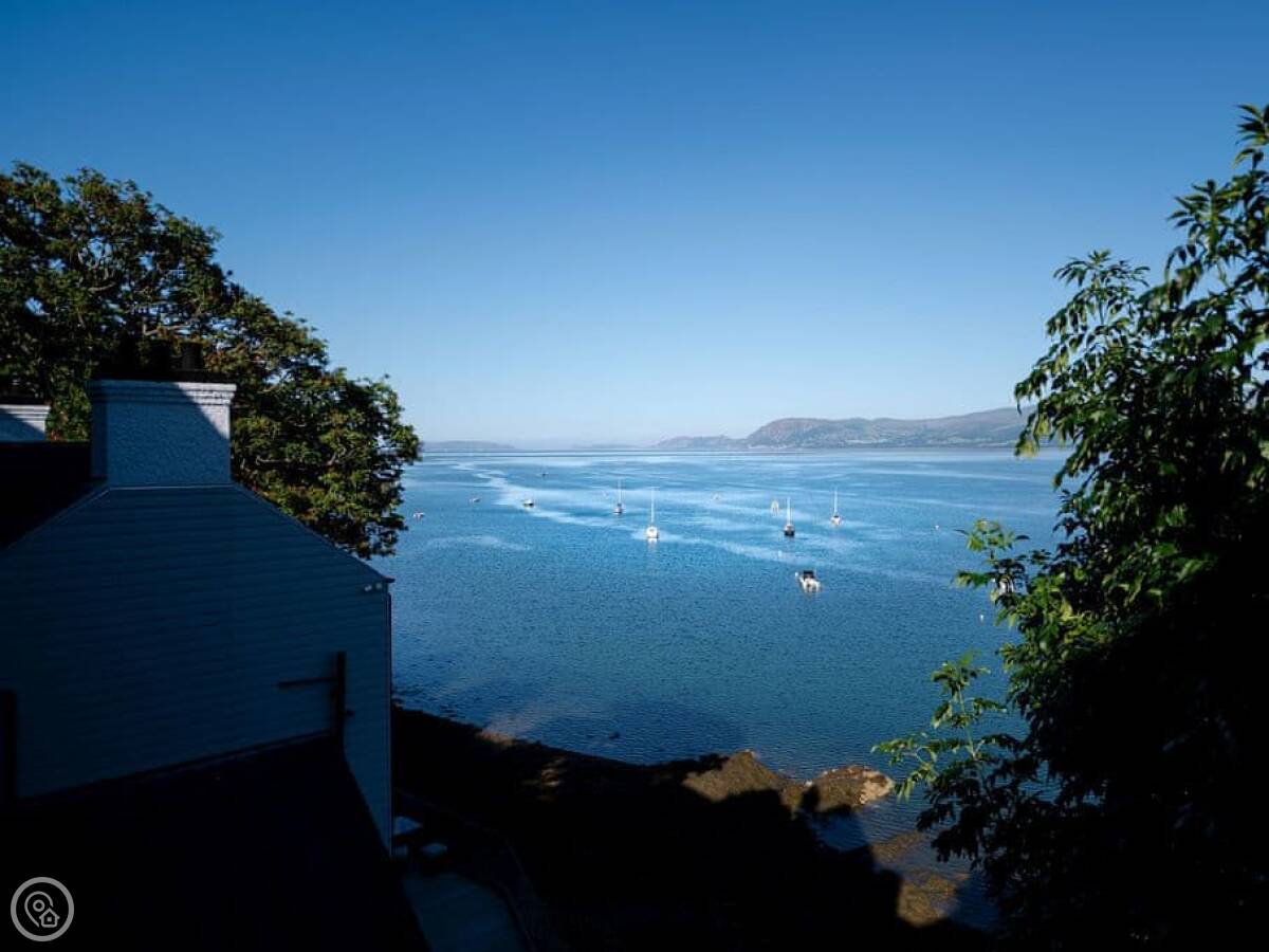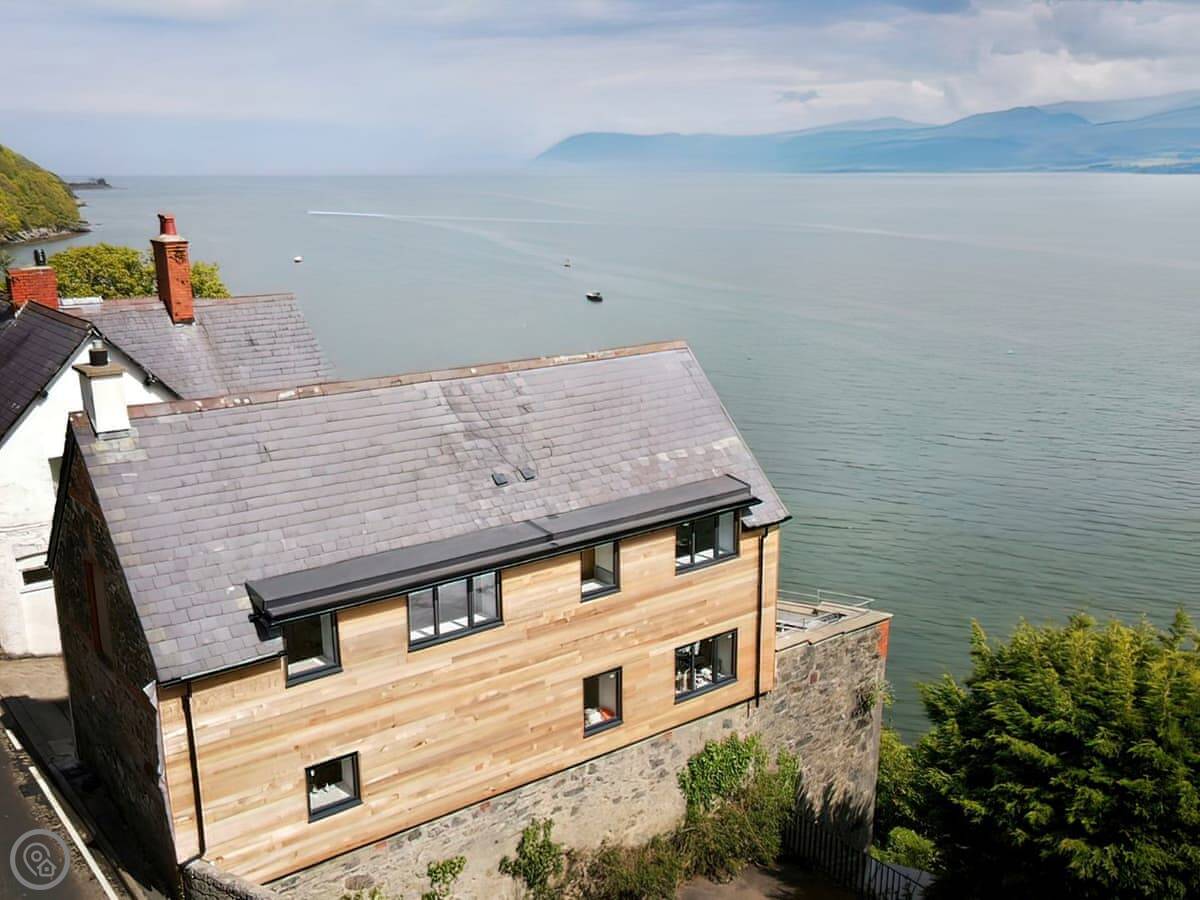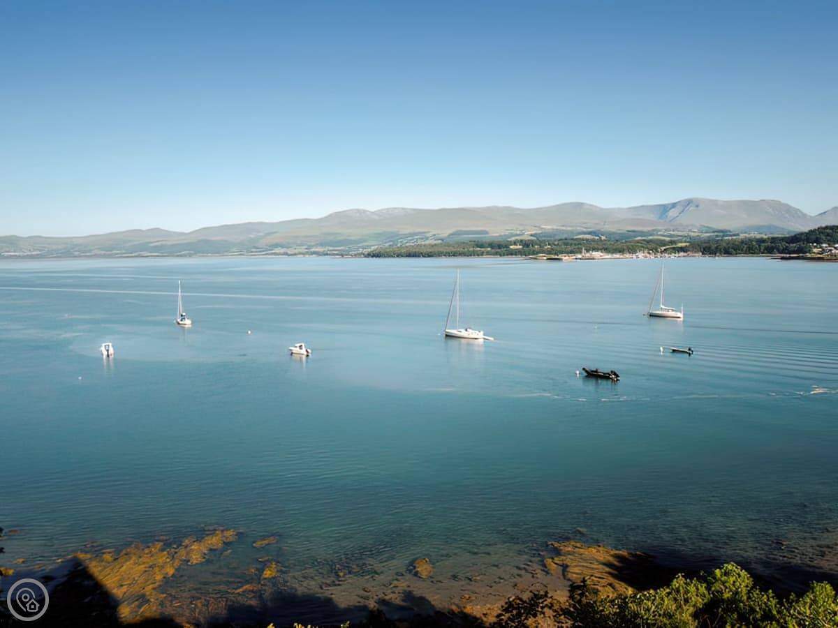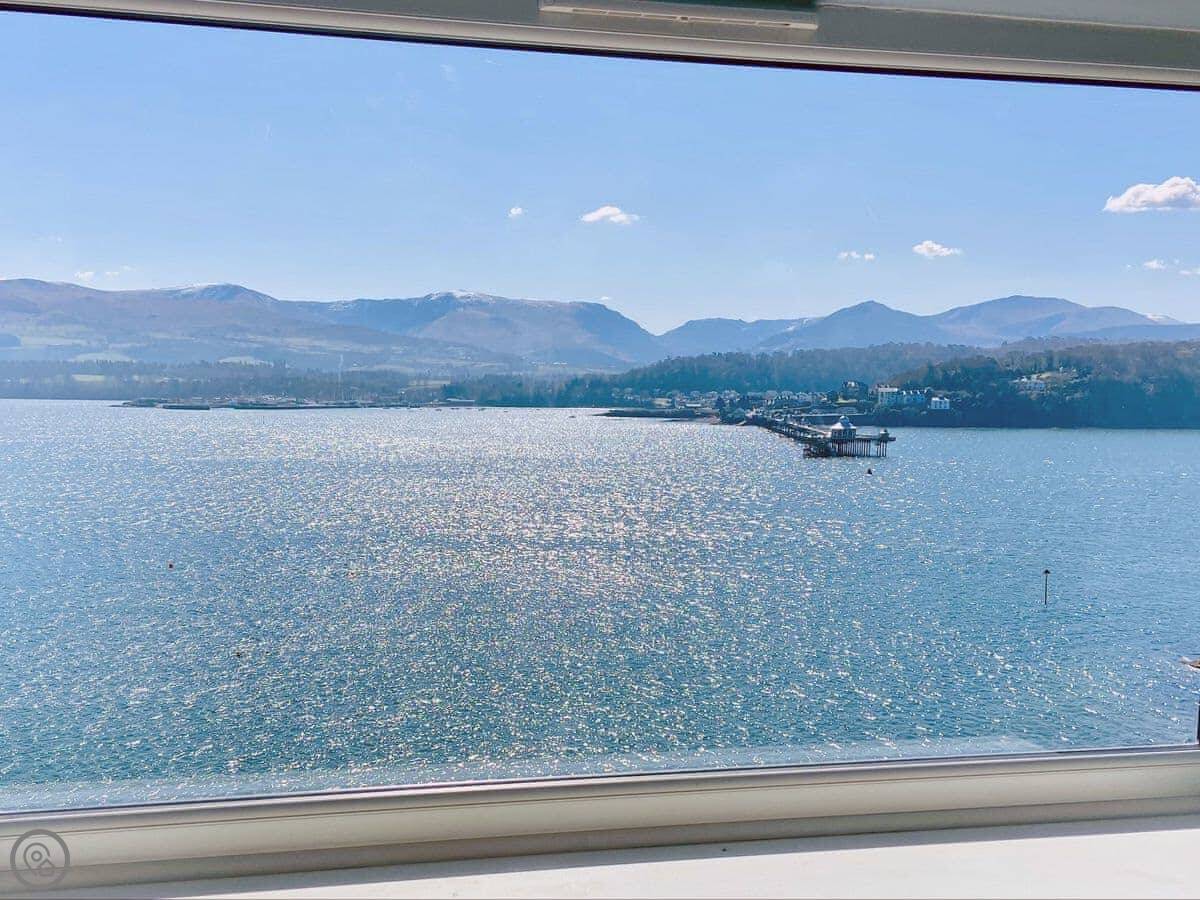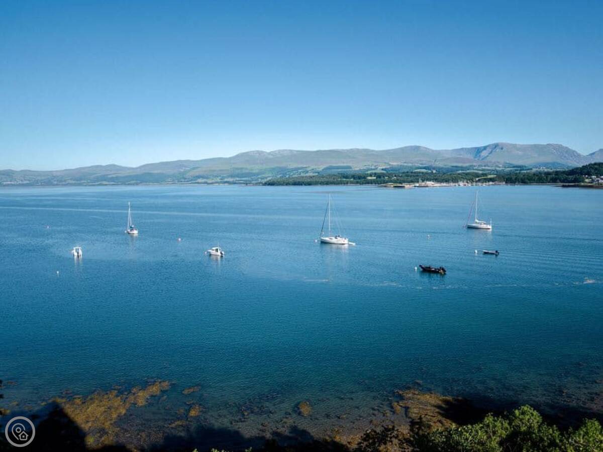 It has a 5 Star rating. That's because it's been fully refurbished. It's a modern standard inside. The main living area is open-plan. The ceiling is high with a vaulted beam. You get a good view from there. You can see the Menai Strait and the mountains.