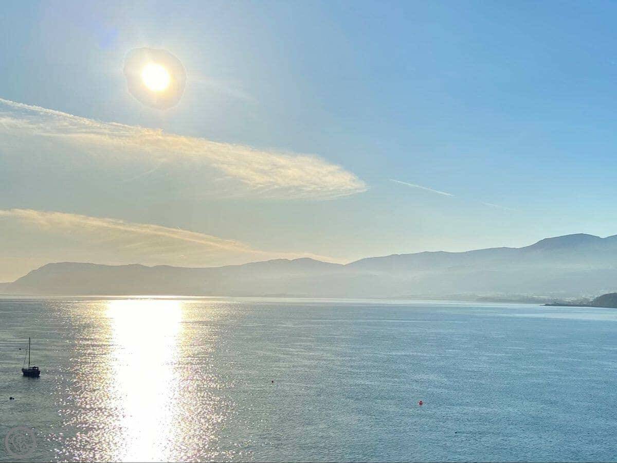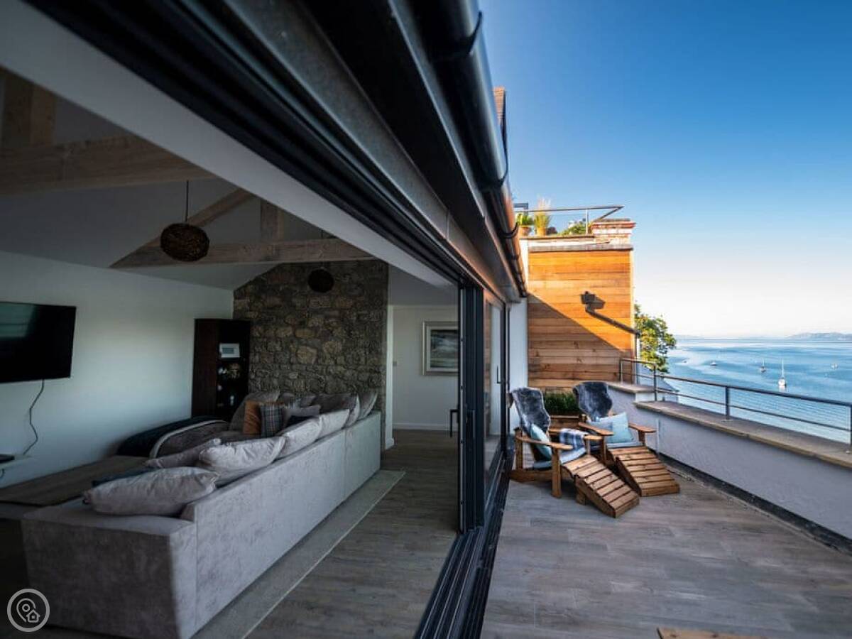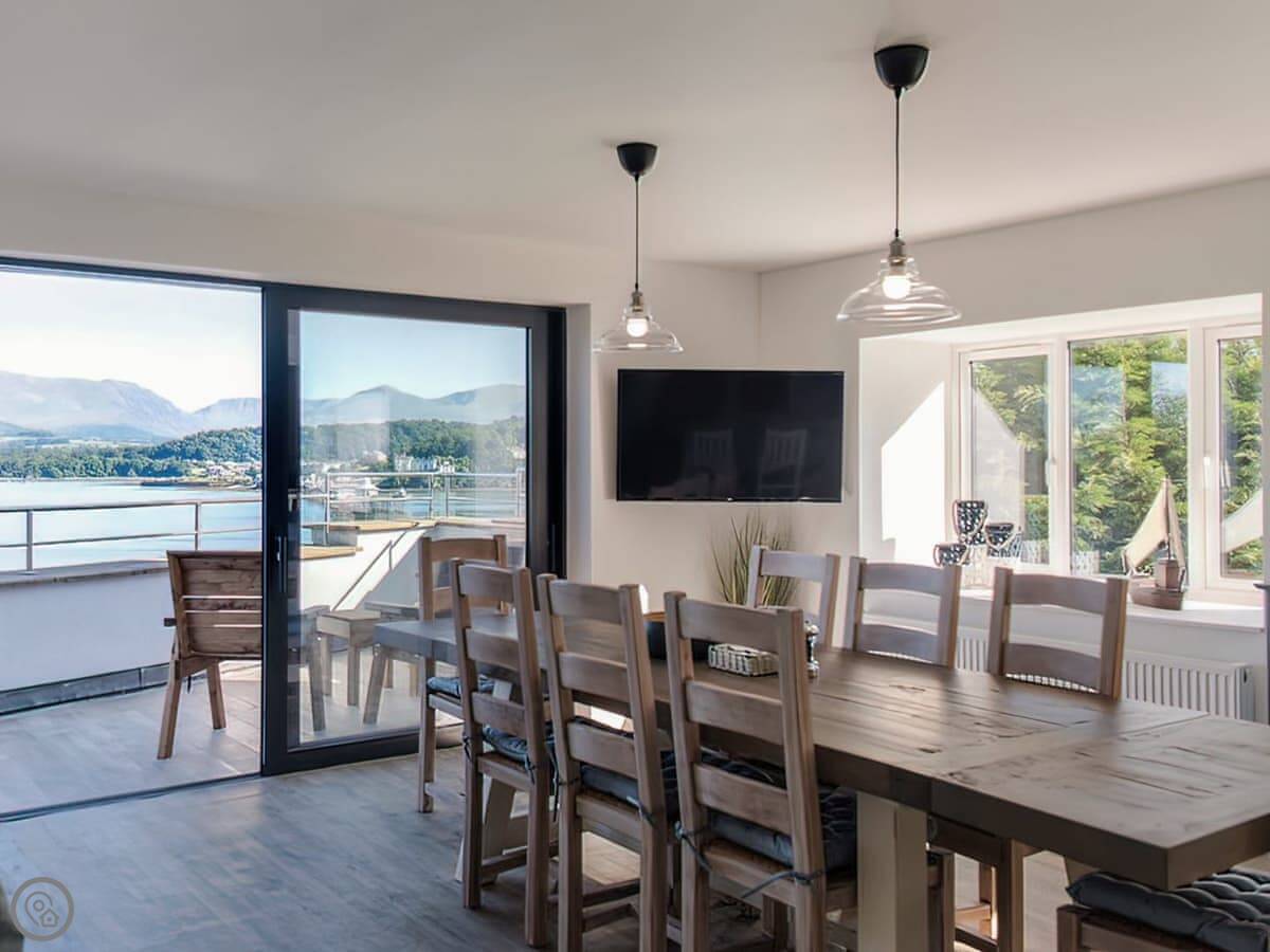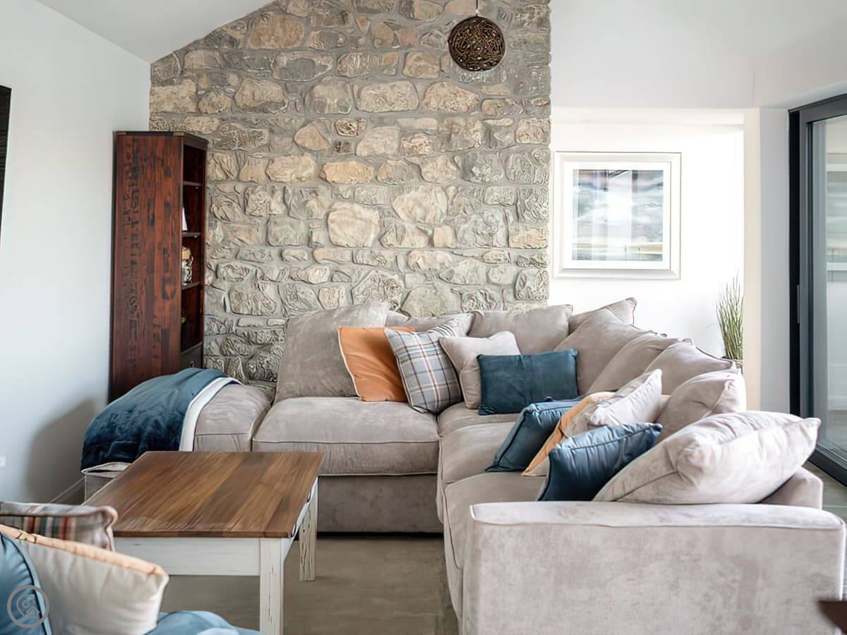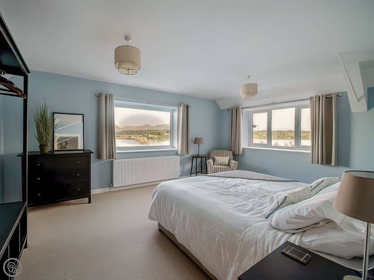 It has a 5 Star rating. That's because it's been fully refurbished. It's a modern standard inside. The main living area is open-plan. The ceiling is high with a vaulted beam. You get a good view from there. You can see the Menai Strait and the mountains.