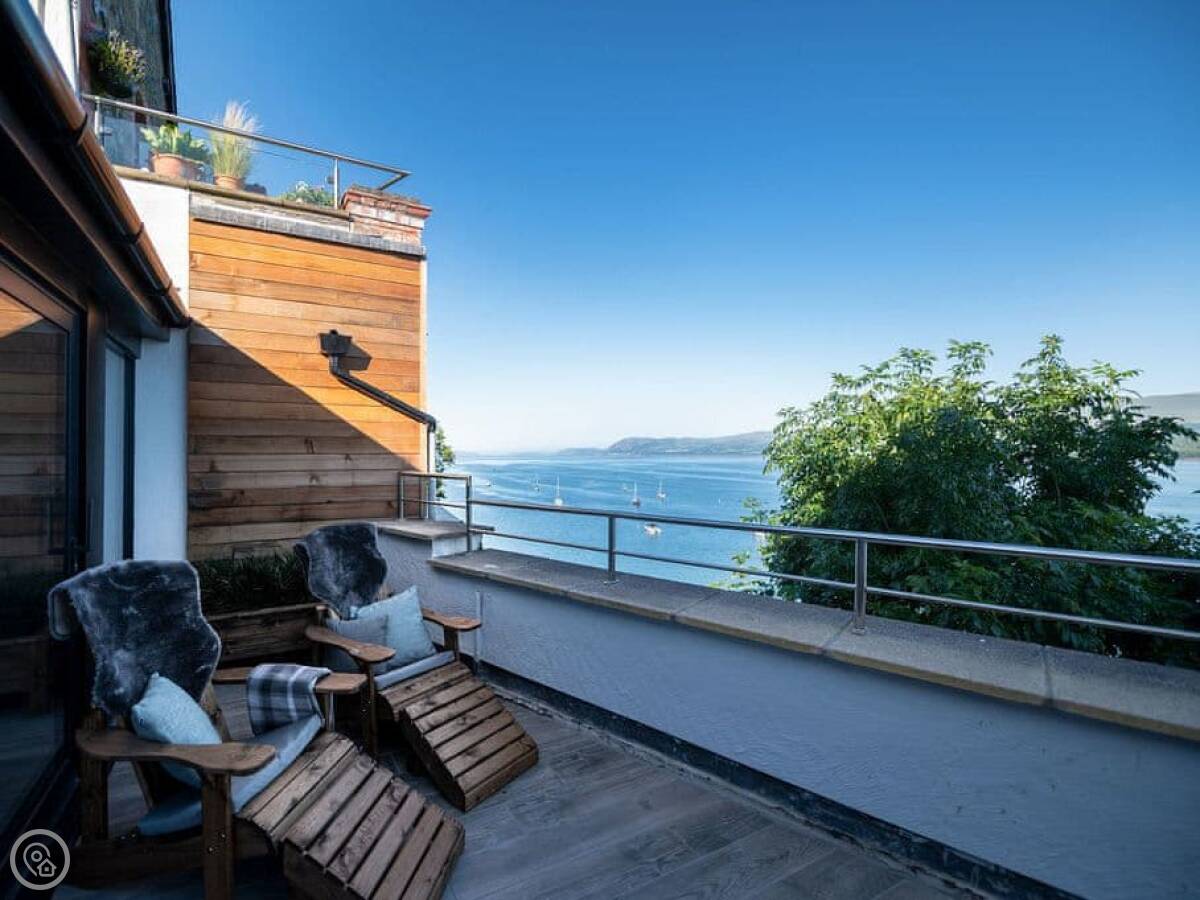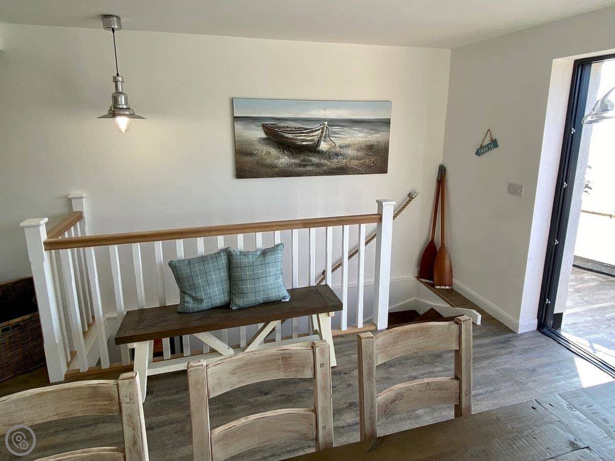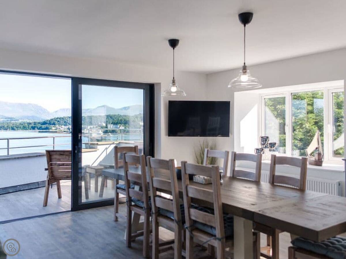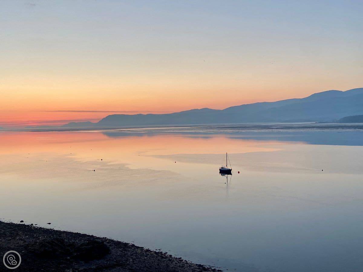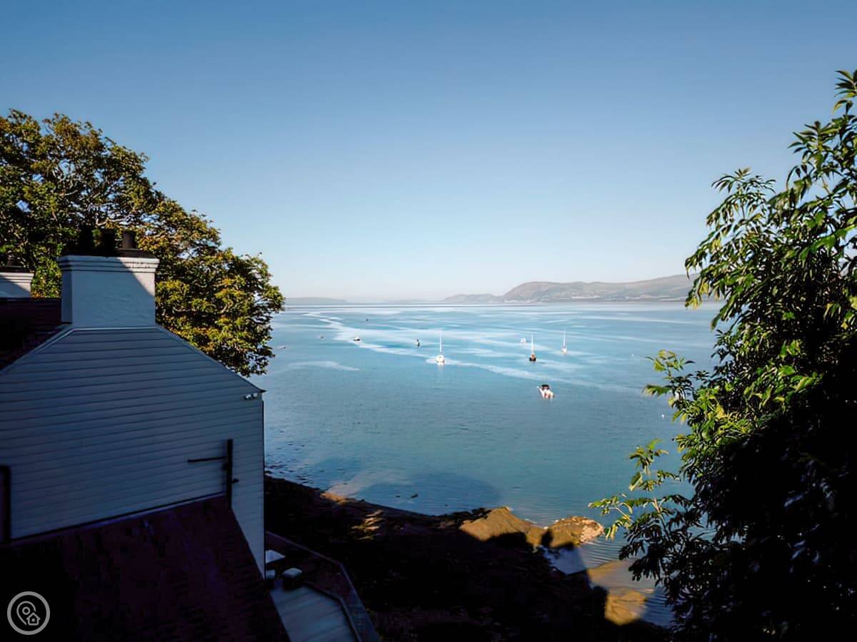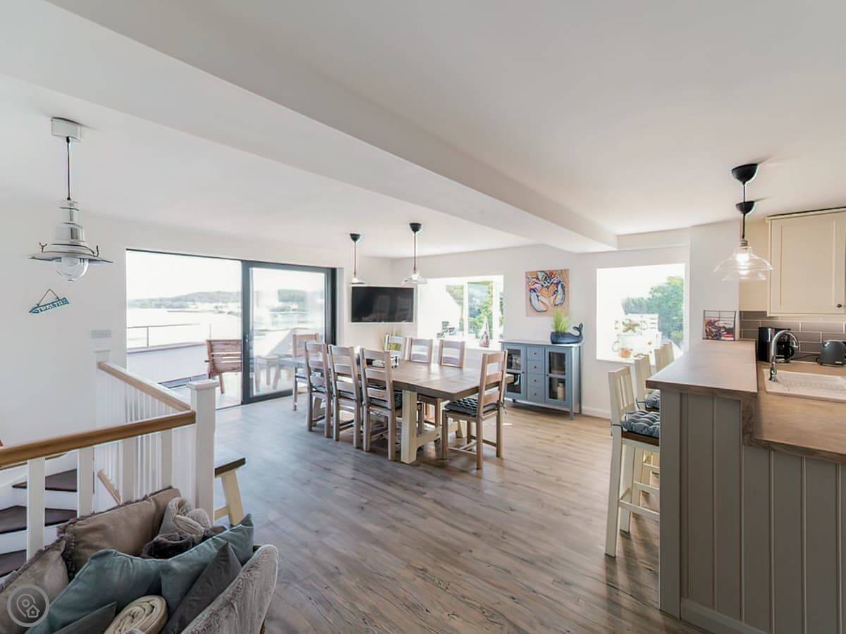 It has a 5 Star rating. That's because it's been fully refurbished. It's a modern standard inside. The main living area is open-plan. The ceiling is high with a vaulted beam. You get a good view from there. You can see the Menai Strait and the mountains.