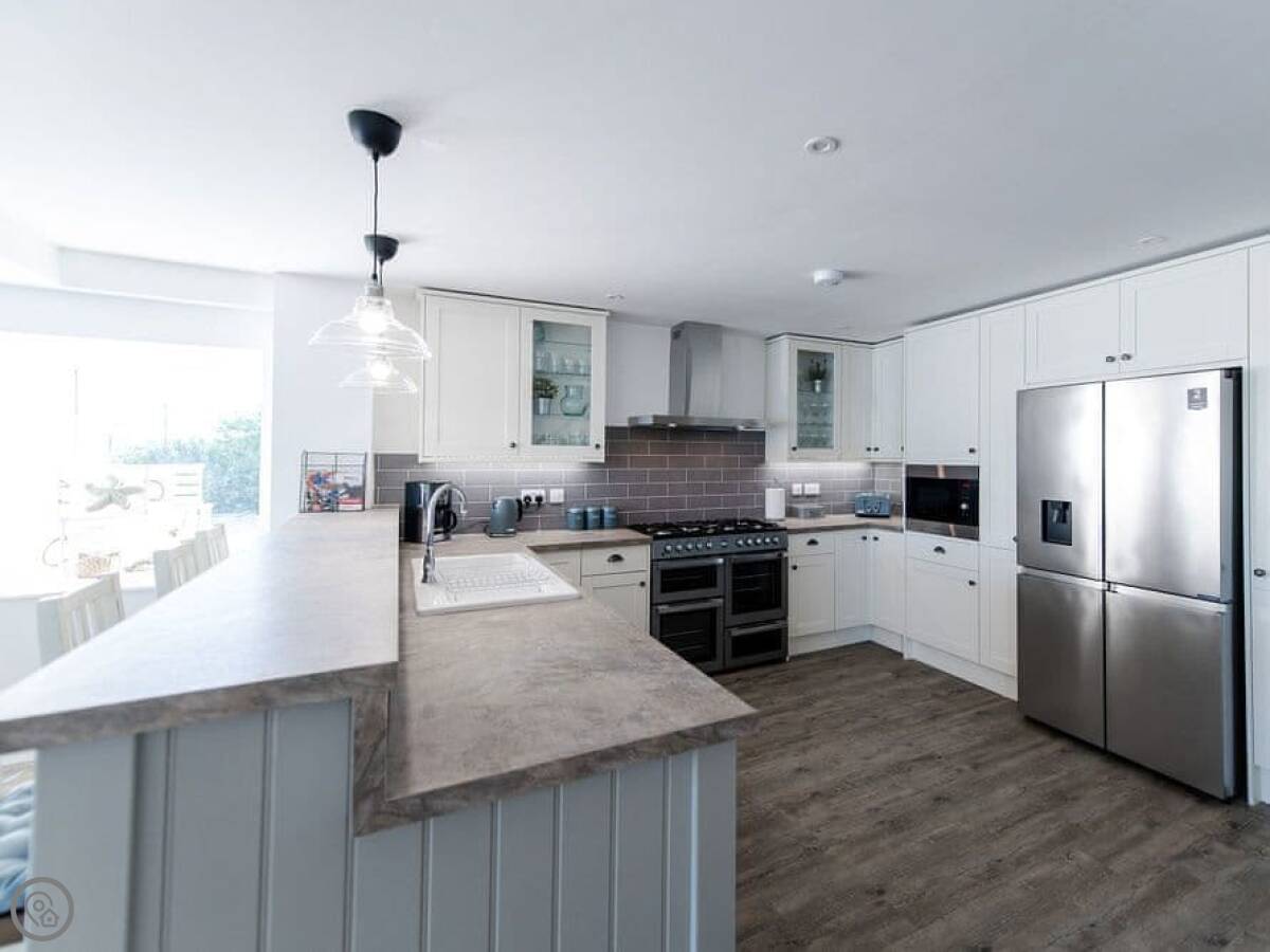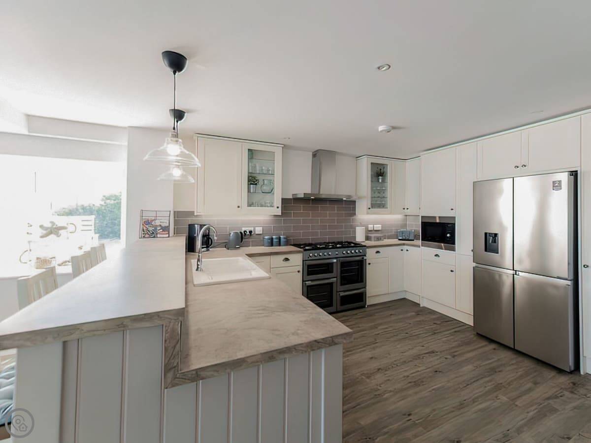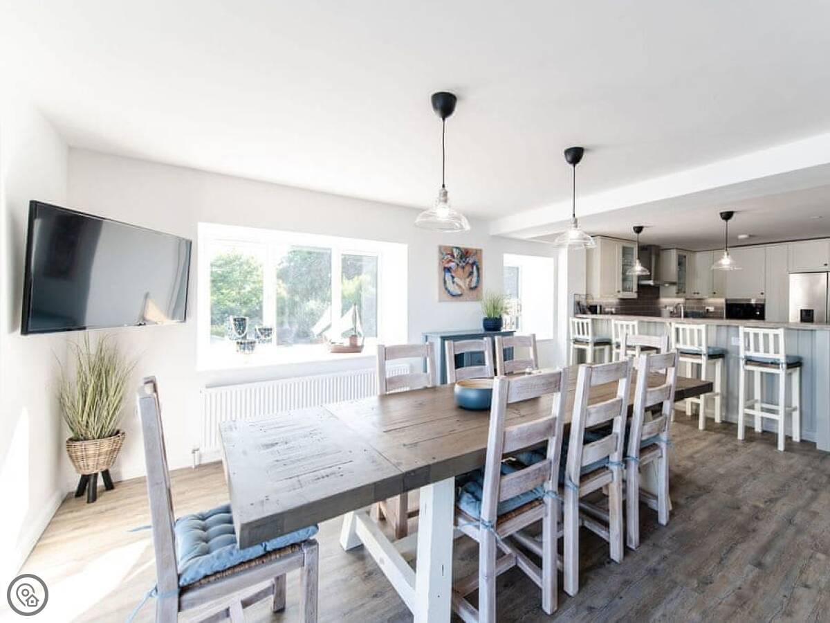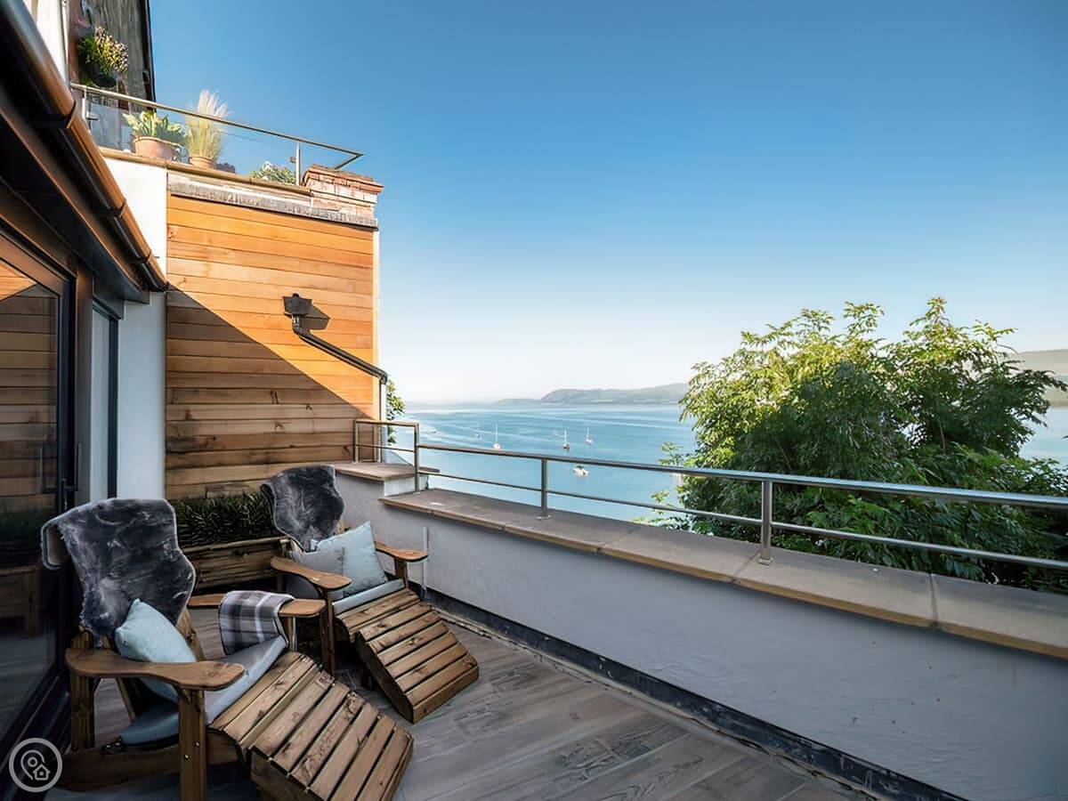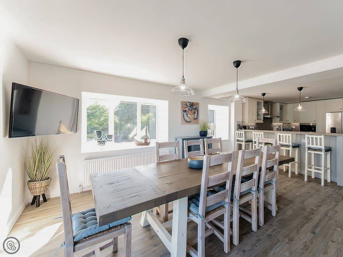 It has a 5 Star rating. That's because it's been fully refurbished. It's a modern standard inside. The main living area is open-plan. The ceiling is high with a vaulted beam. You get a good view from there. You can see the Menai Strait and the mountains.