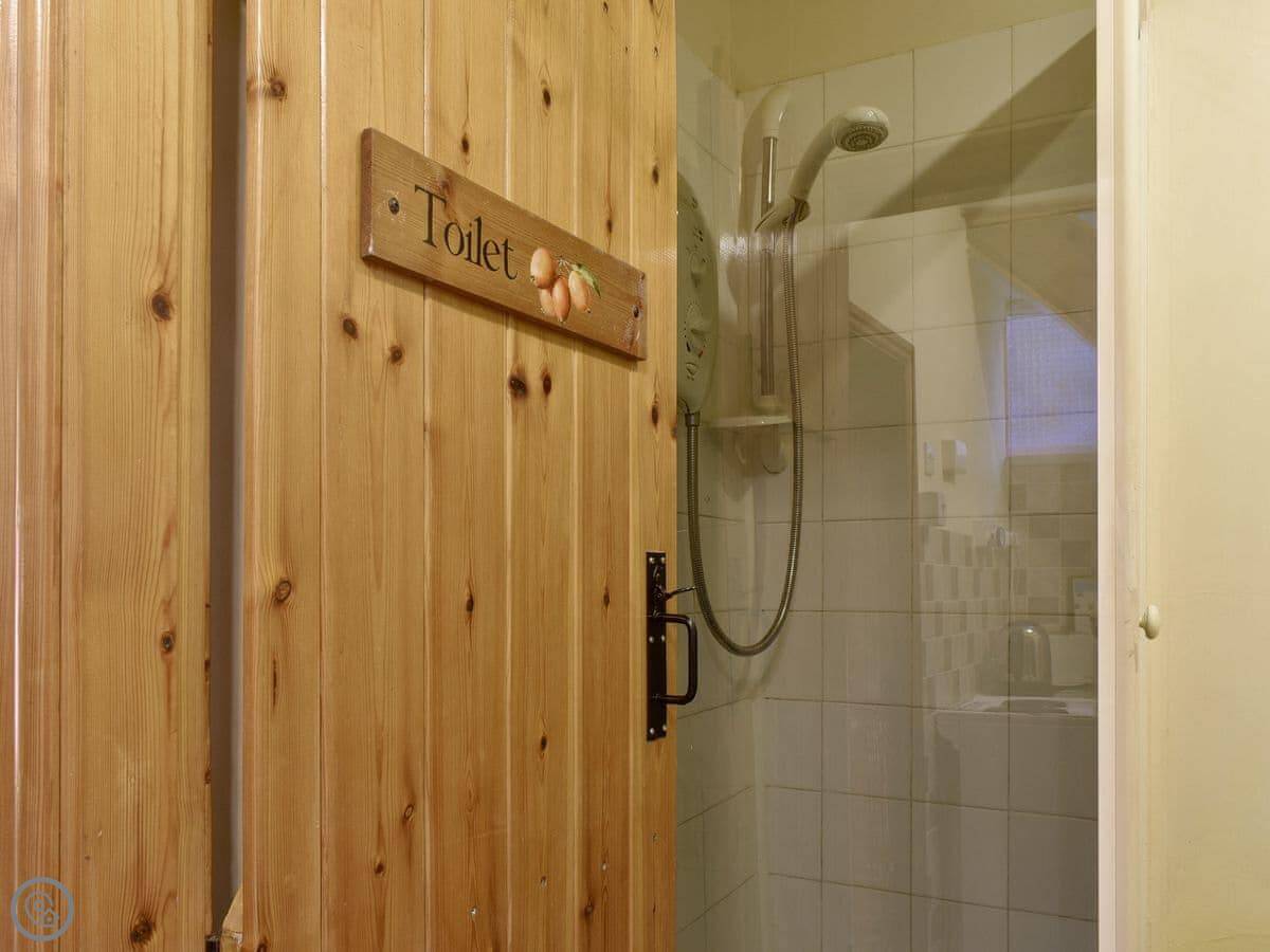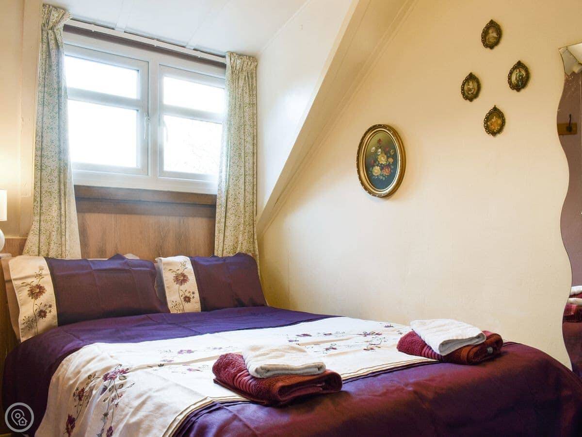 Inside, it's all on one level at the back. There's a living area with a sofa and table, then a step up to the kitchen. The shower room is off the kitchen. It's a compact shower, not a bath. The stairs to the bedroom are spiral and they're steep. You need to be careful on them. The bedroom has a vaulted ceiling and a double bed.