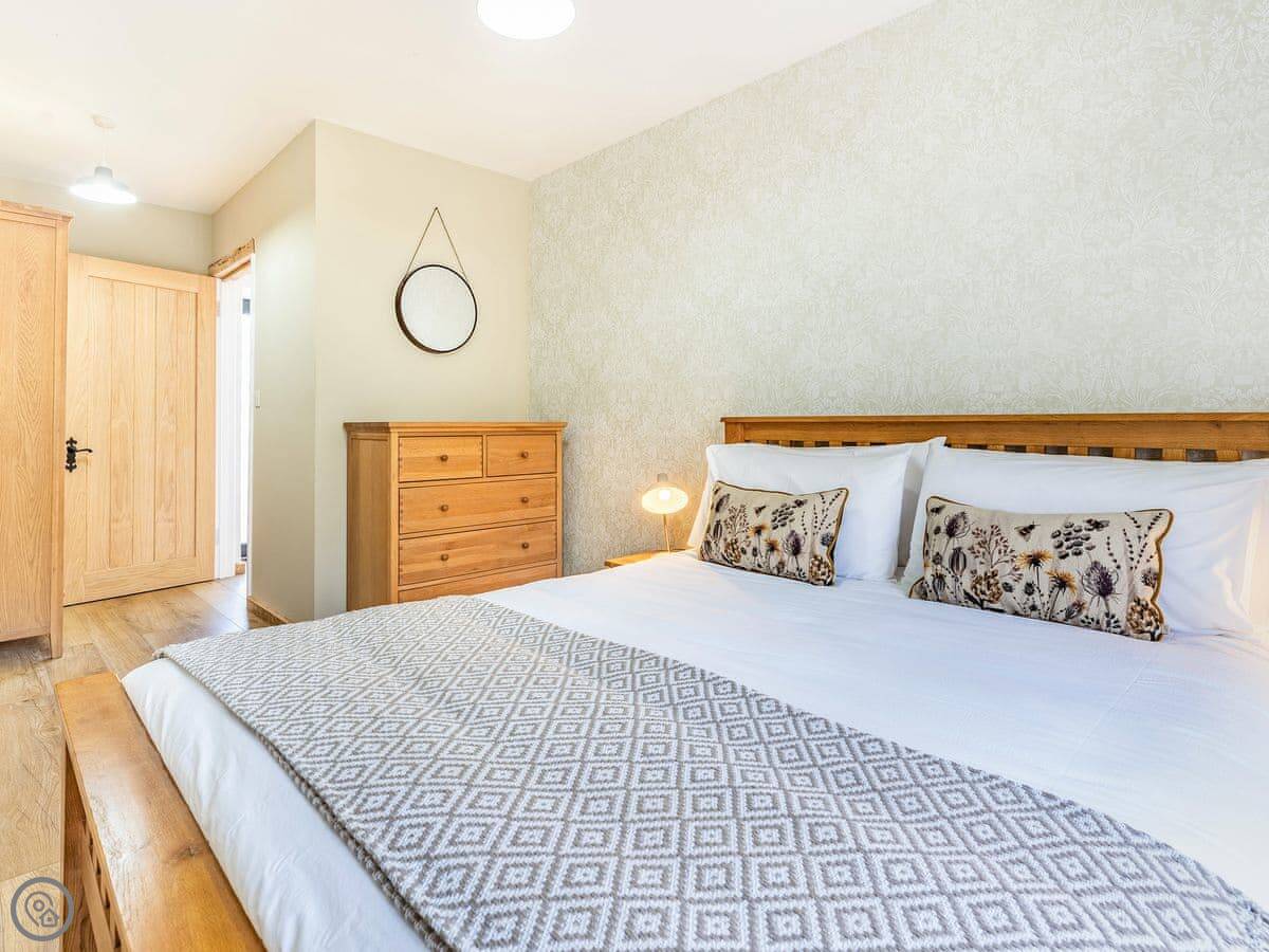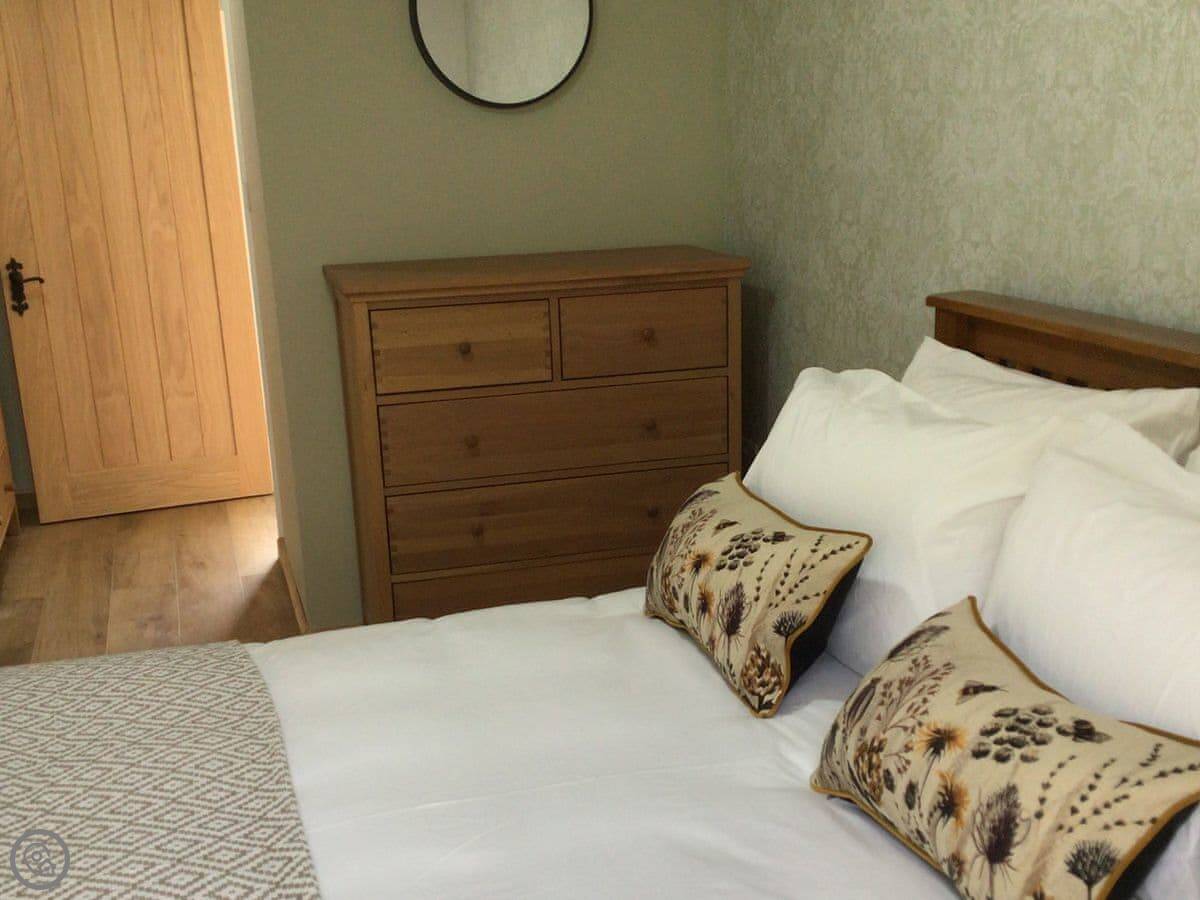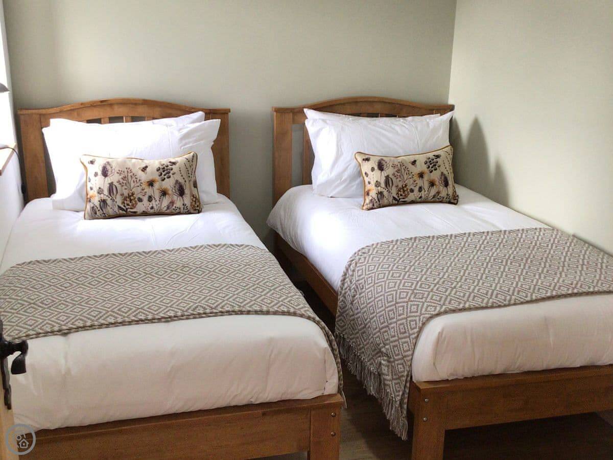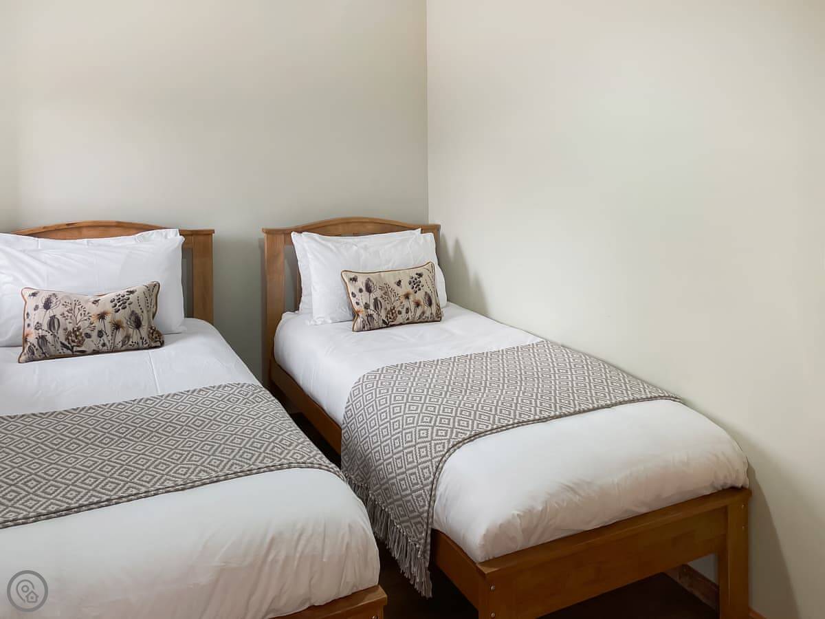On the ground floor you’ll find an open plan living room dining and kitchen space where you can cook up those home-cooked recipes and then gather the family for an evening in front of the Smart TV or exit out of the French doors into the enclosed rear garden which stretches across the back of the property. The master bedroom has a king size bed and floor to ceiling window taking full advantage of the rural view to the front aspect, the second bedroom is a twin room with two single 3ft beds.