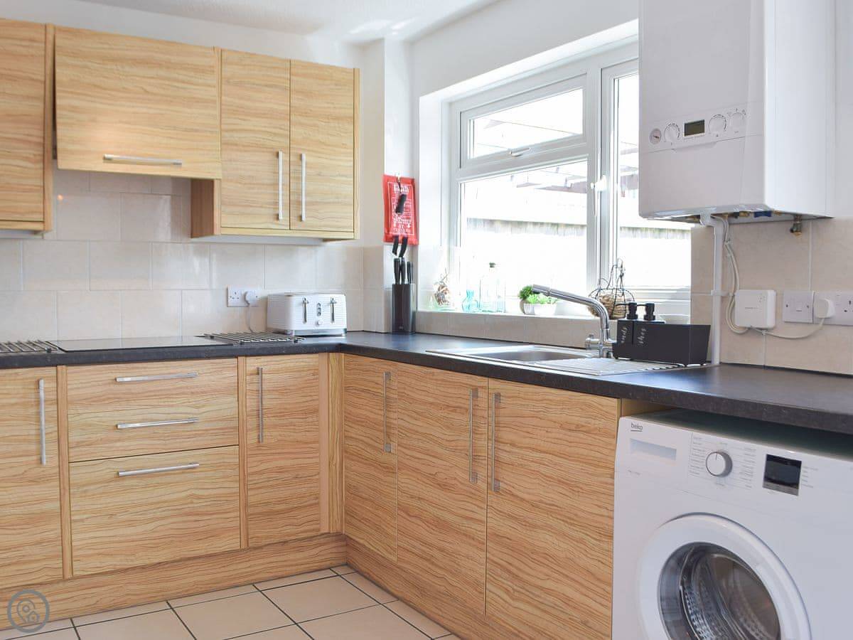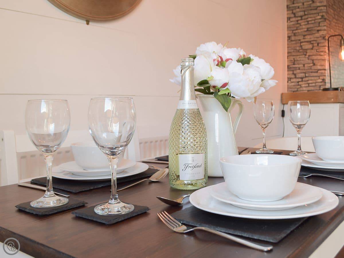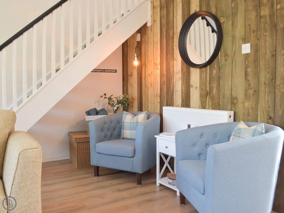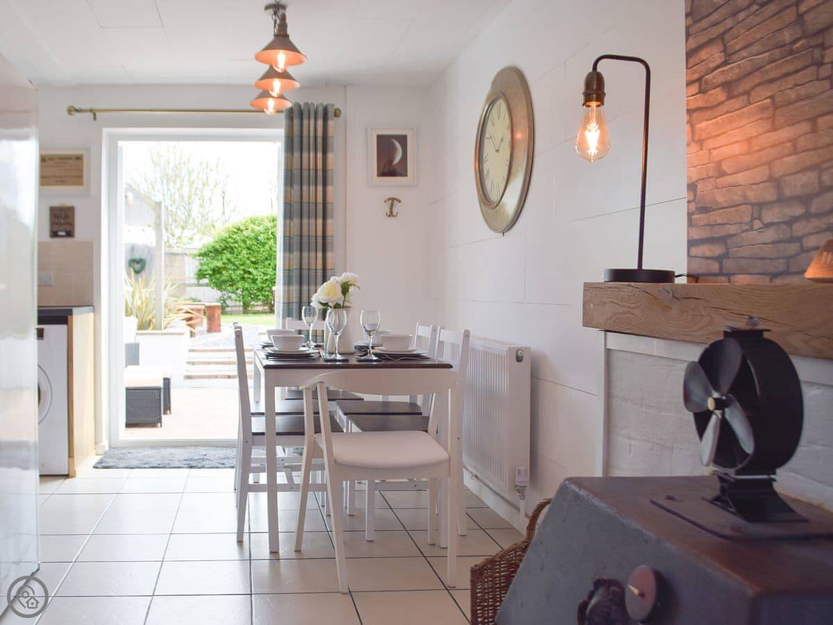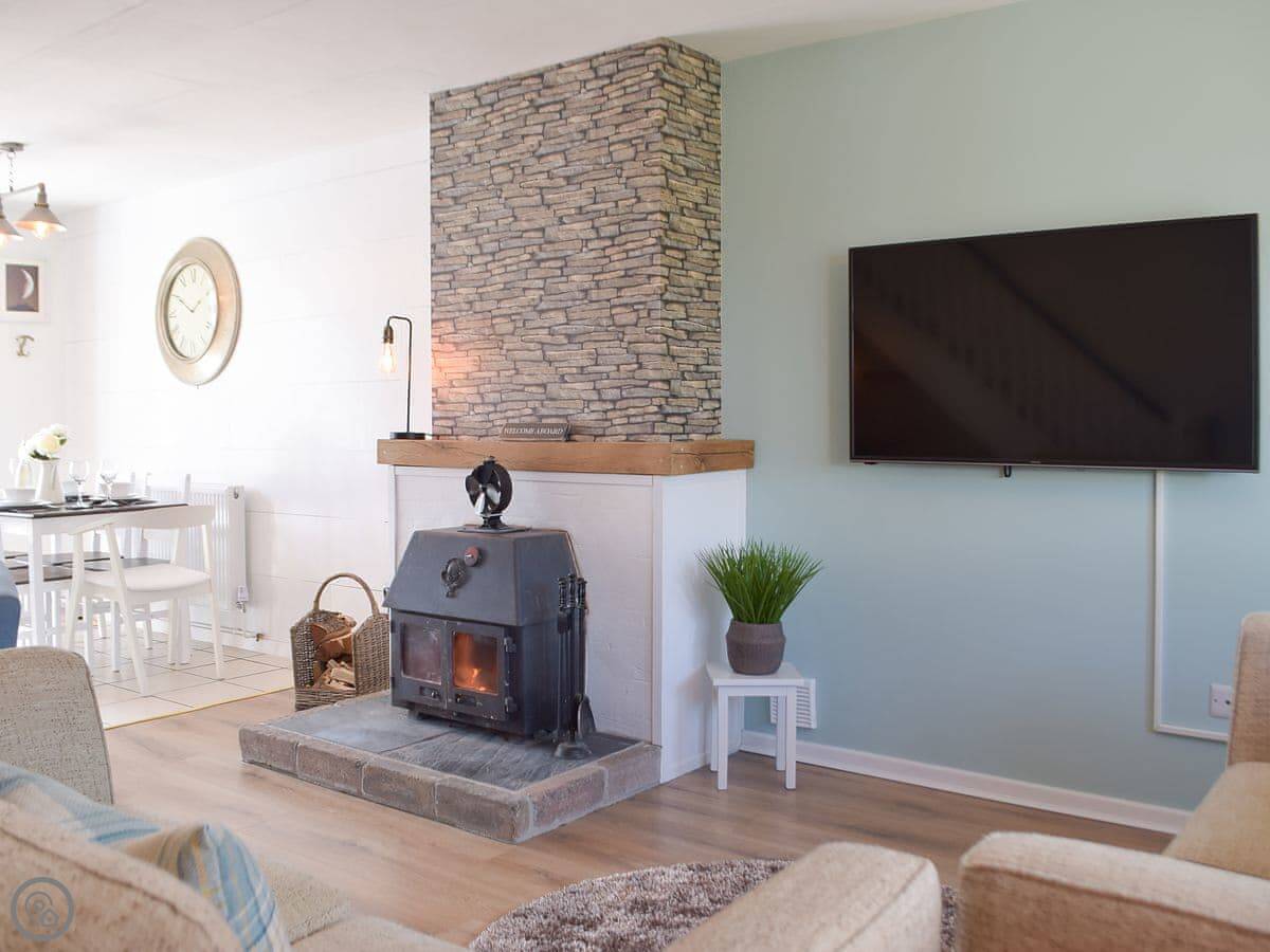 Inside, it's open plan. Kitchen, dining, living room all together. There's a wood burner. As the name suggests, it's decorated with a bit of a nautical theme. There's a washing machine, WiFi, and parking right outside.
