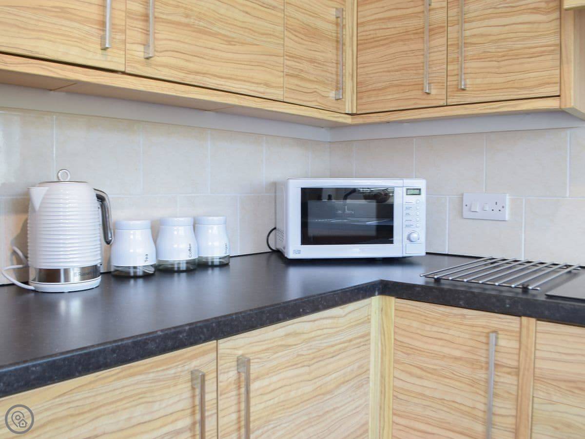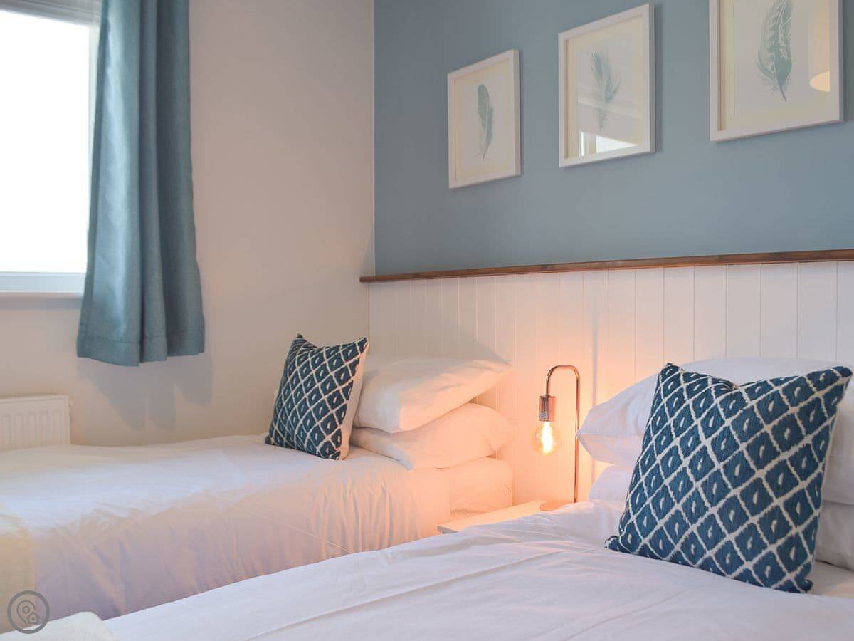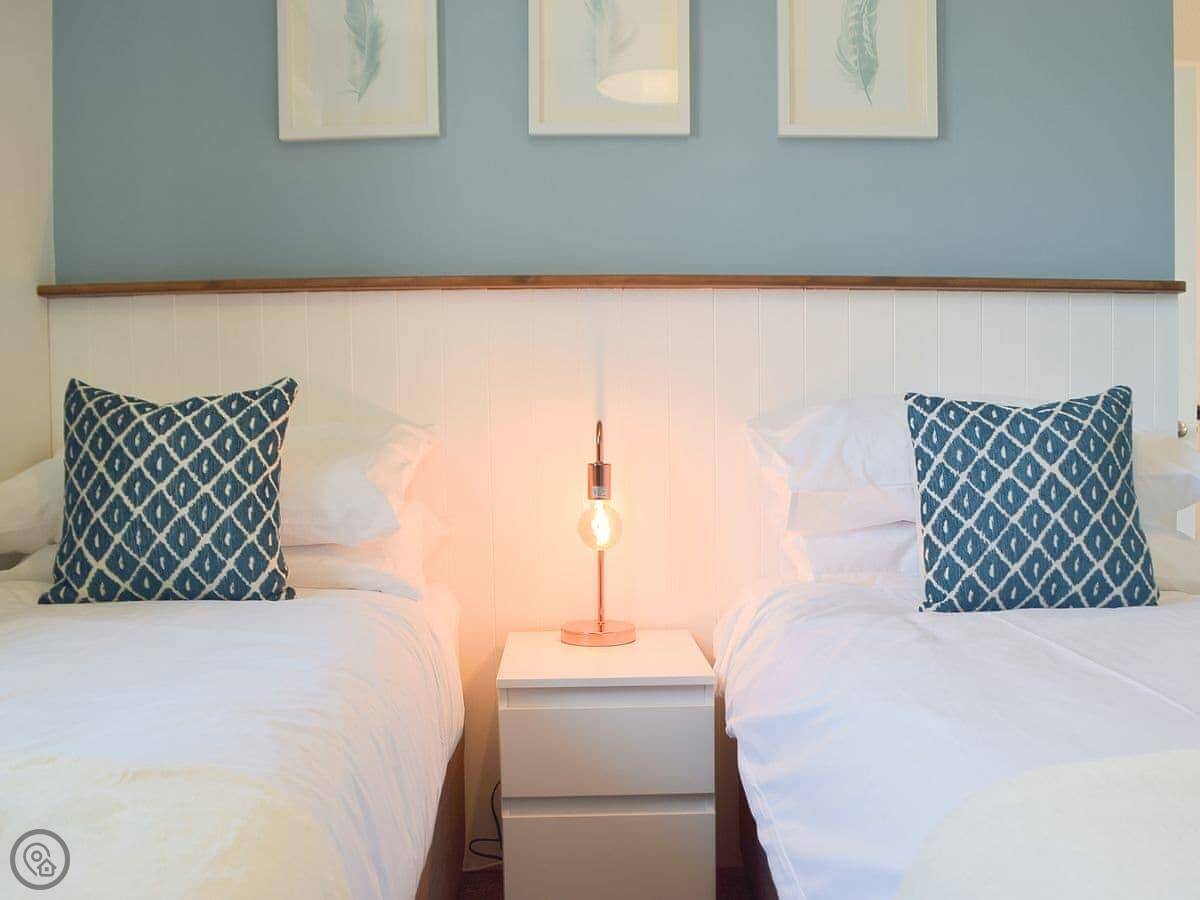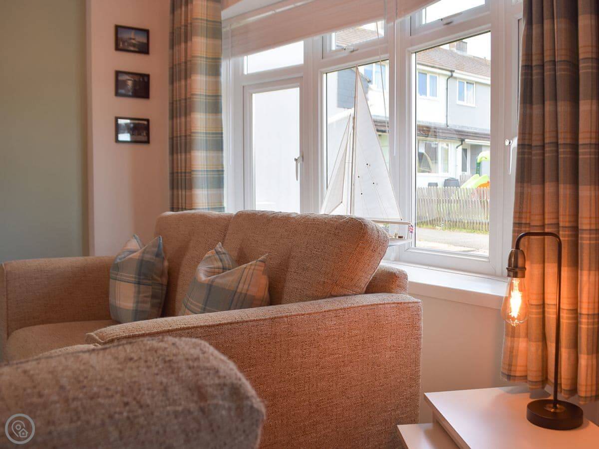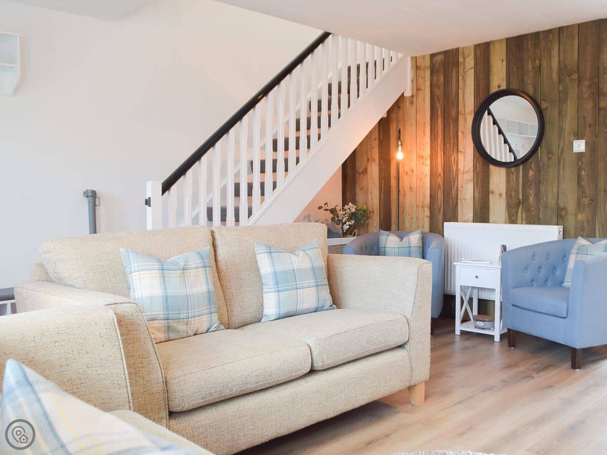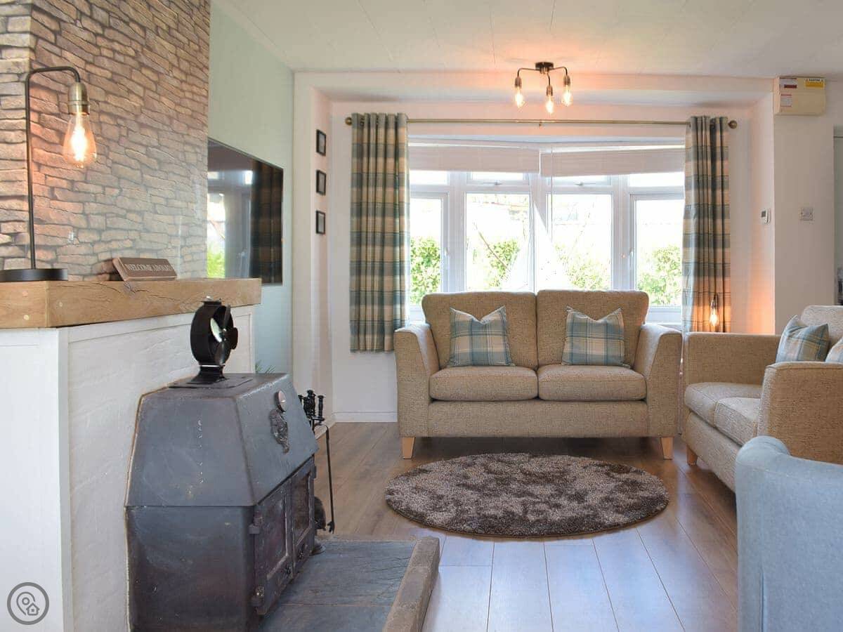 Inside, it's open plan. Kitchen, dining, living room all together. There's a wood burner. As the name suggests, it's decorated with a bit of a nautical theme. There's a washing machine, WiFi, and parking right outside.