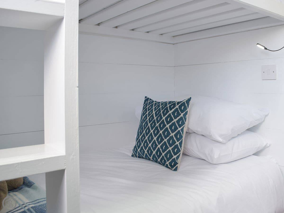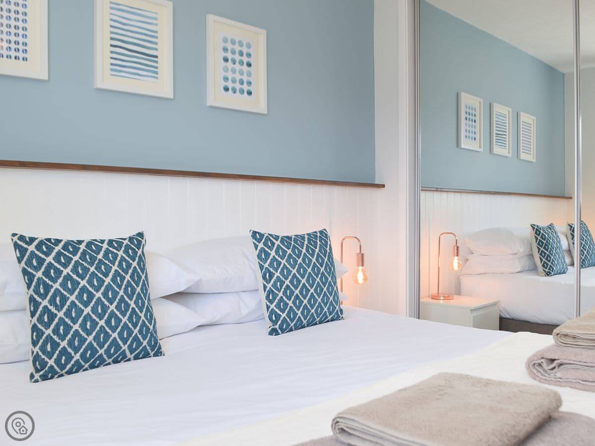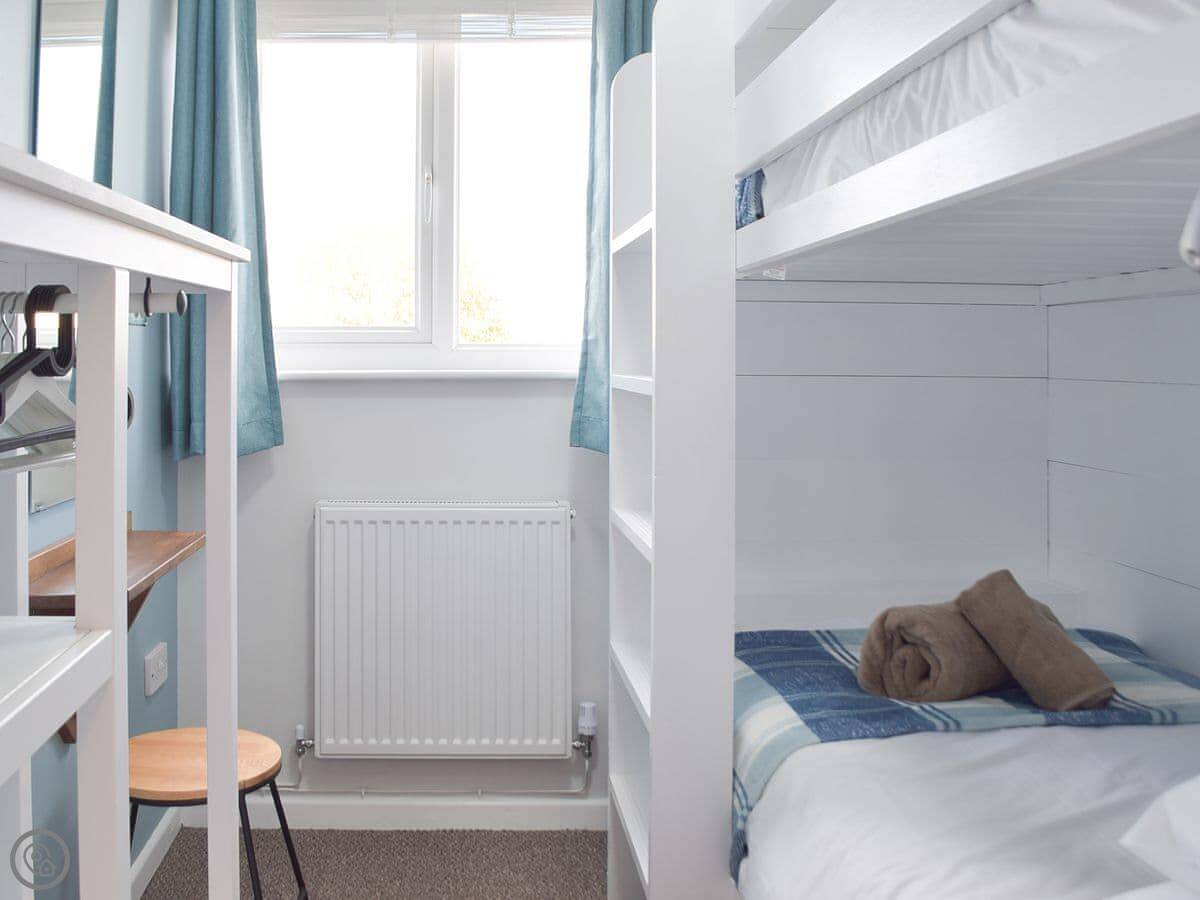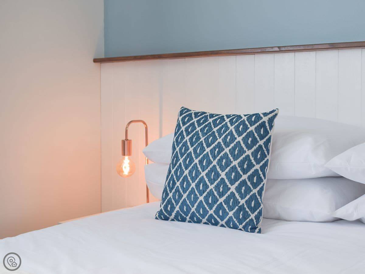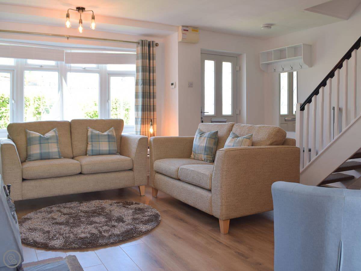Inside, it's open plan. Kitchen, dining, living room all together. There's a wood burner. As the name suggests, it's decorated with a bit of a nautical theme. There's a washing machine, WiFi, and parking right outside.