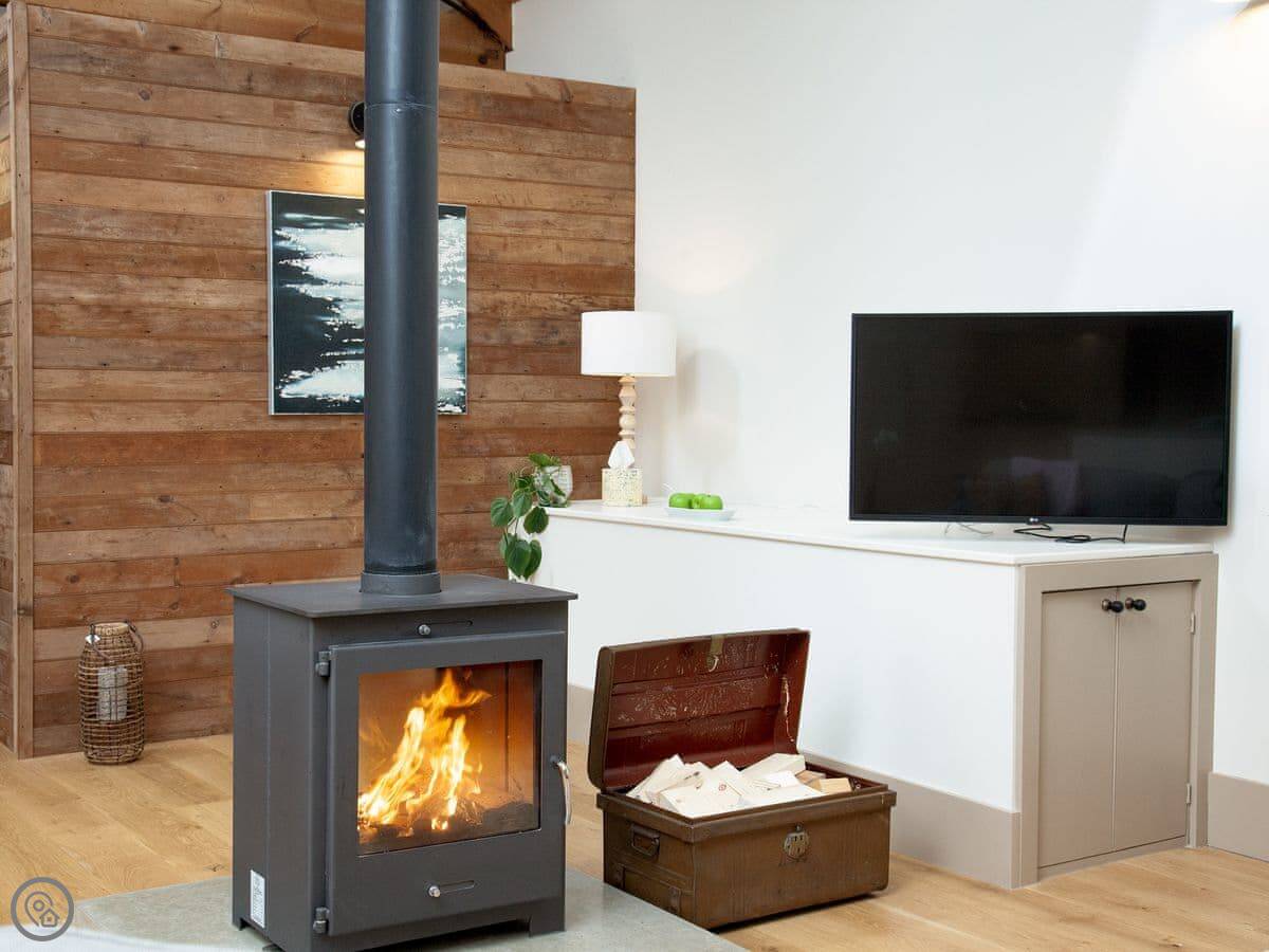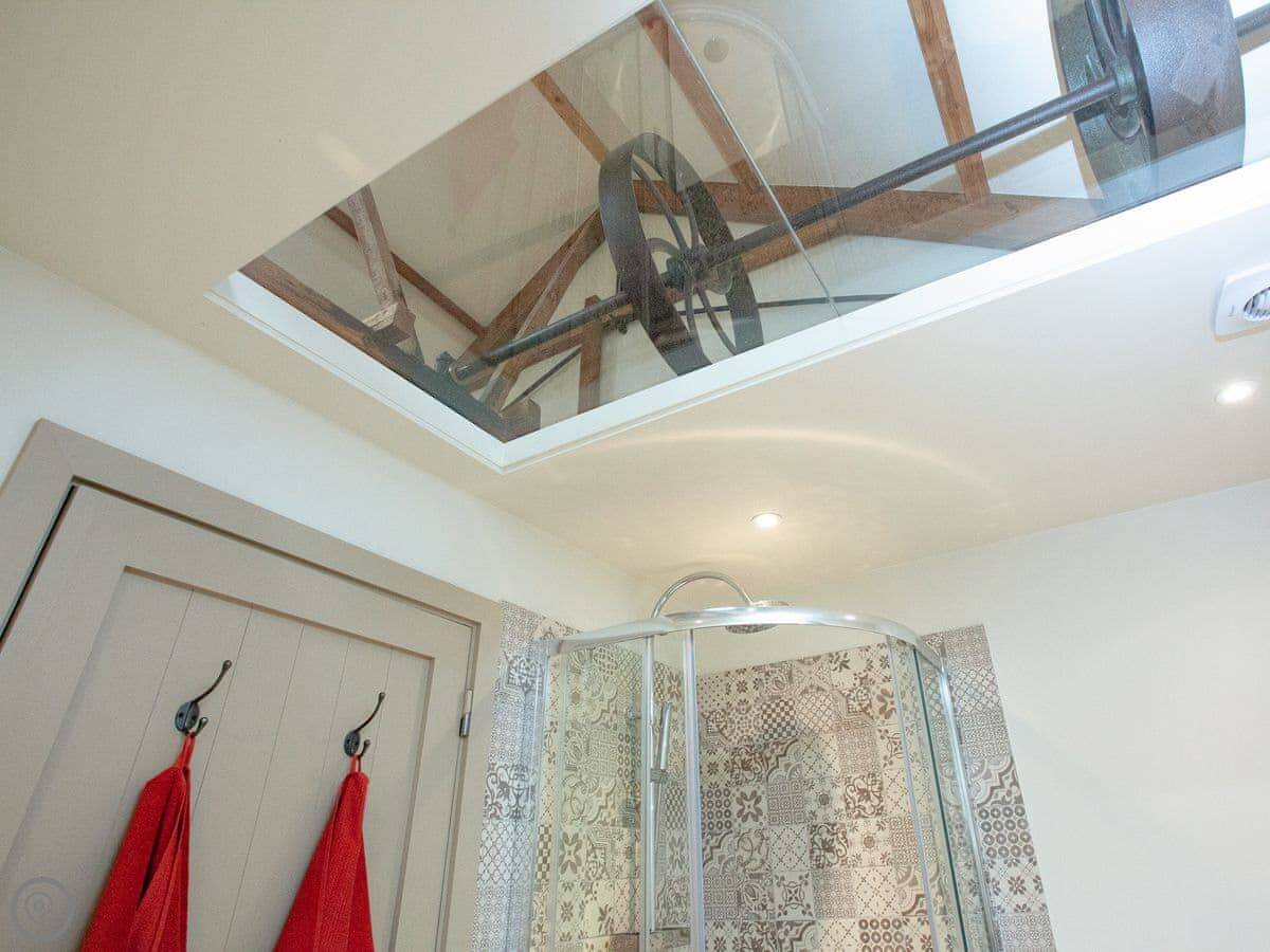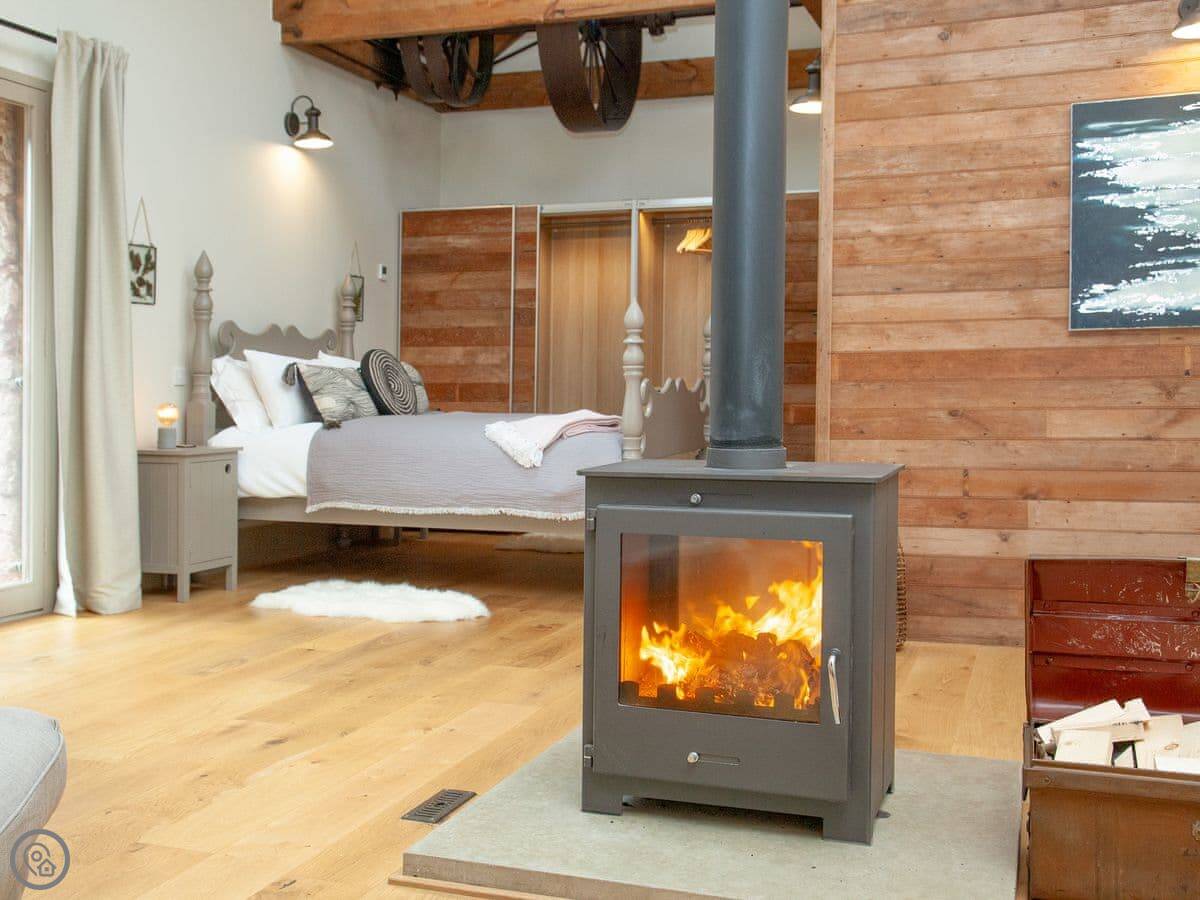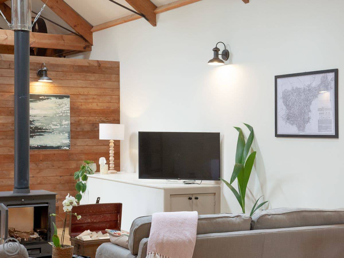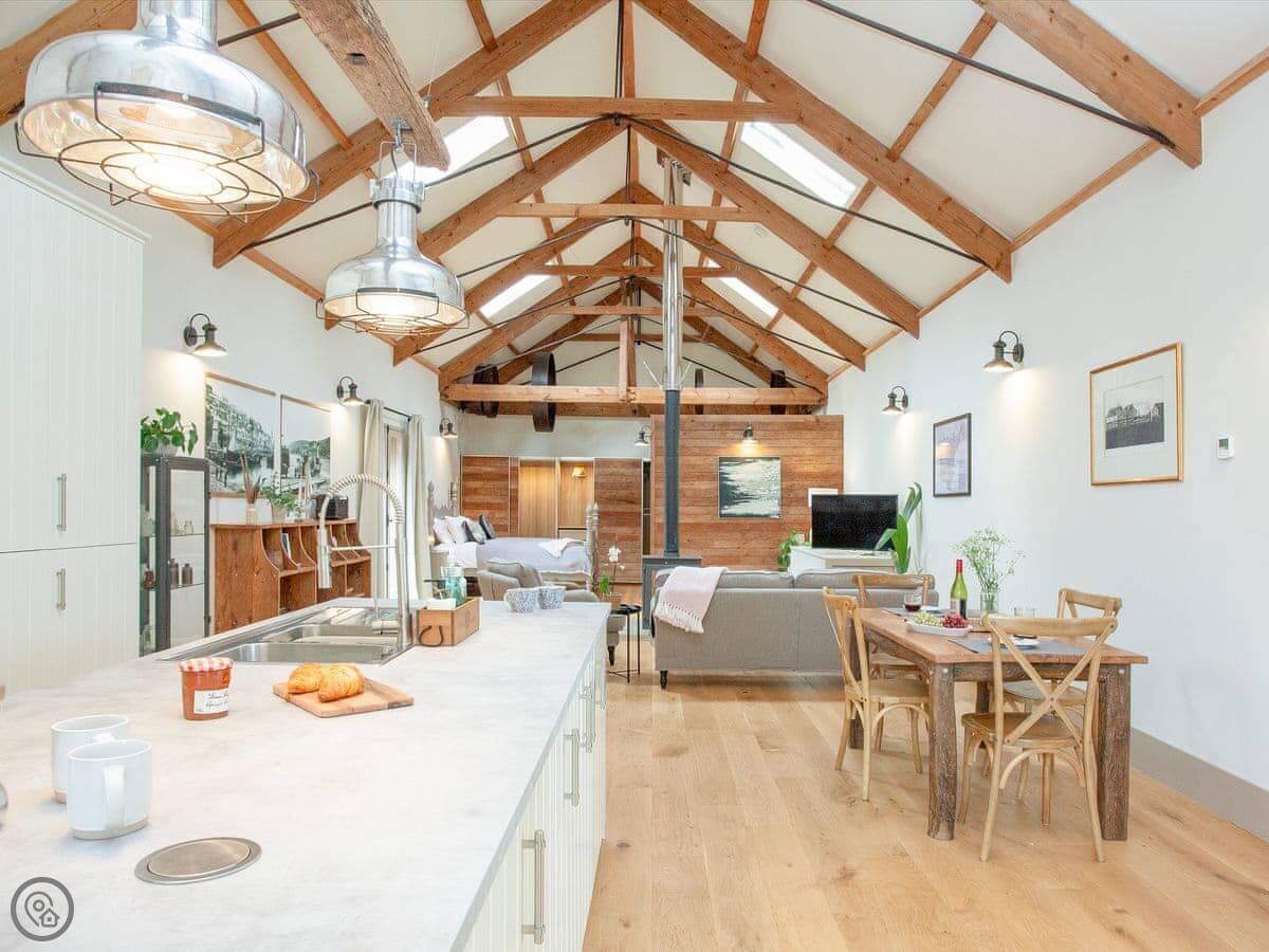 Through the entrance and into the property itself is the real wow factor, with vaulted ceilings and the entire property being open plan. The kitchen area is beautifully designed and decorated with large island and stunning overhead lighting. The dining area with table & chair seating is opposite, making for a great social atmosphere. Slightly further down the room is the lounge area with sofa seating and gorgeous double-sided free-standing log burner, a great feature for relaxing in front of the TV cuddled up after a long day exploring. The sleeping area is at the end of the property with a sliding wardrobe storage across the far wall, all made from reclaimed wood from the original barn itself! The door to the bathroom is accessed via the sleeping area and boasts free standing bath and separate shower enclosure. A wonderful feature of the bathroom is the glass panel in the ceiling looking at the old threshing machine wheels, restored from the original threshing barn.