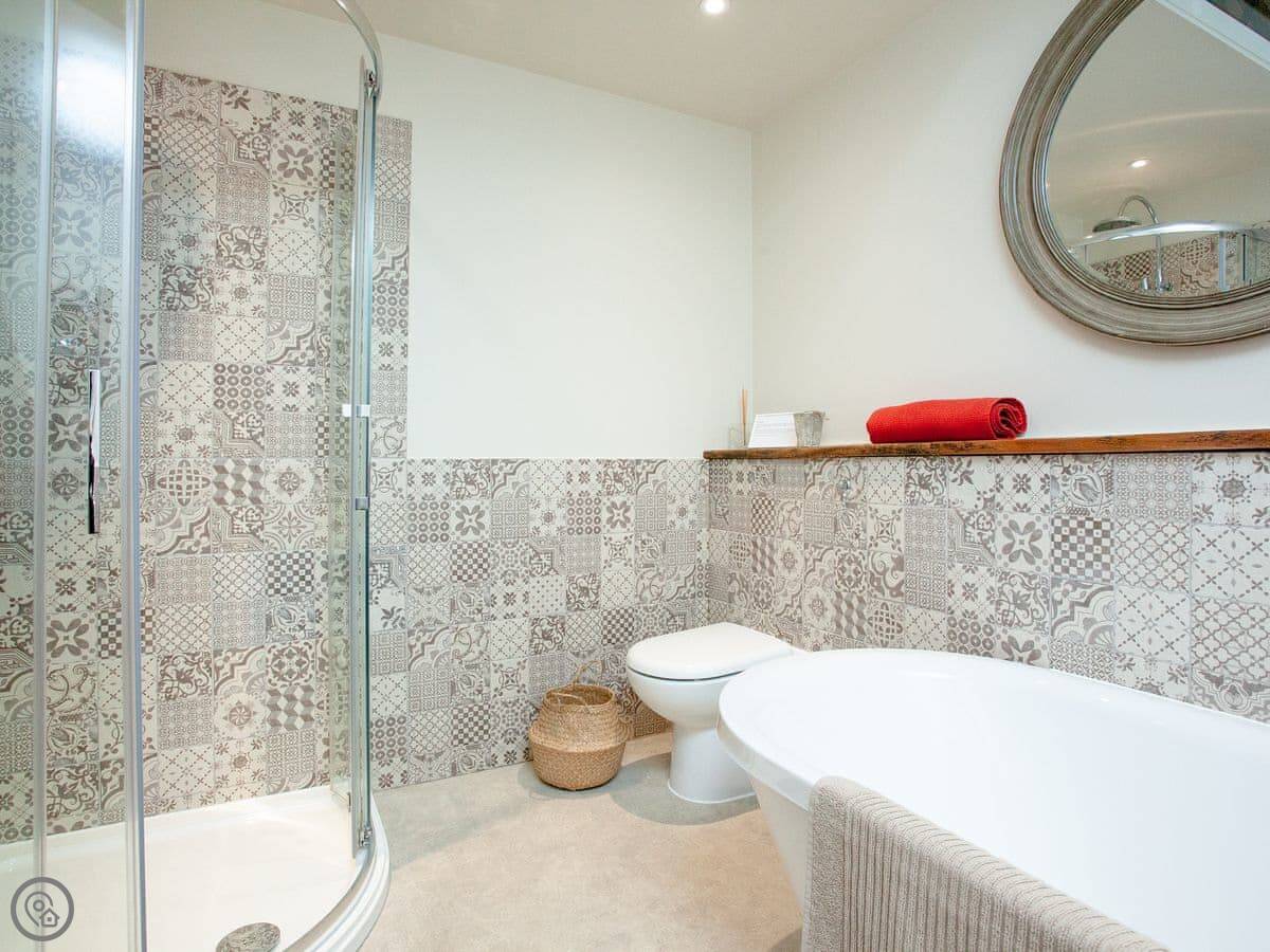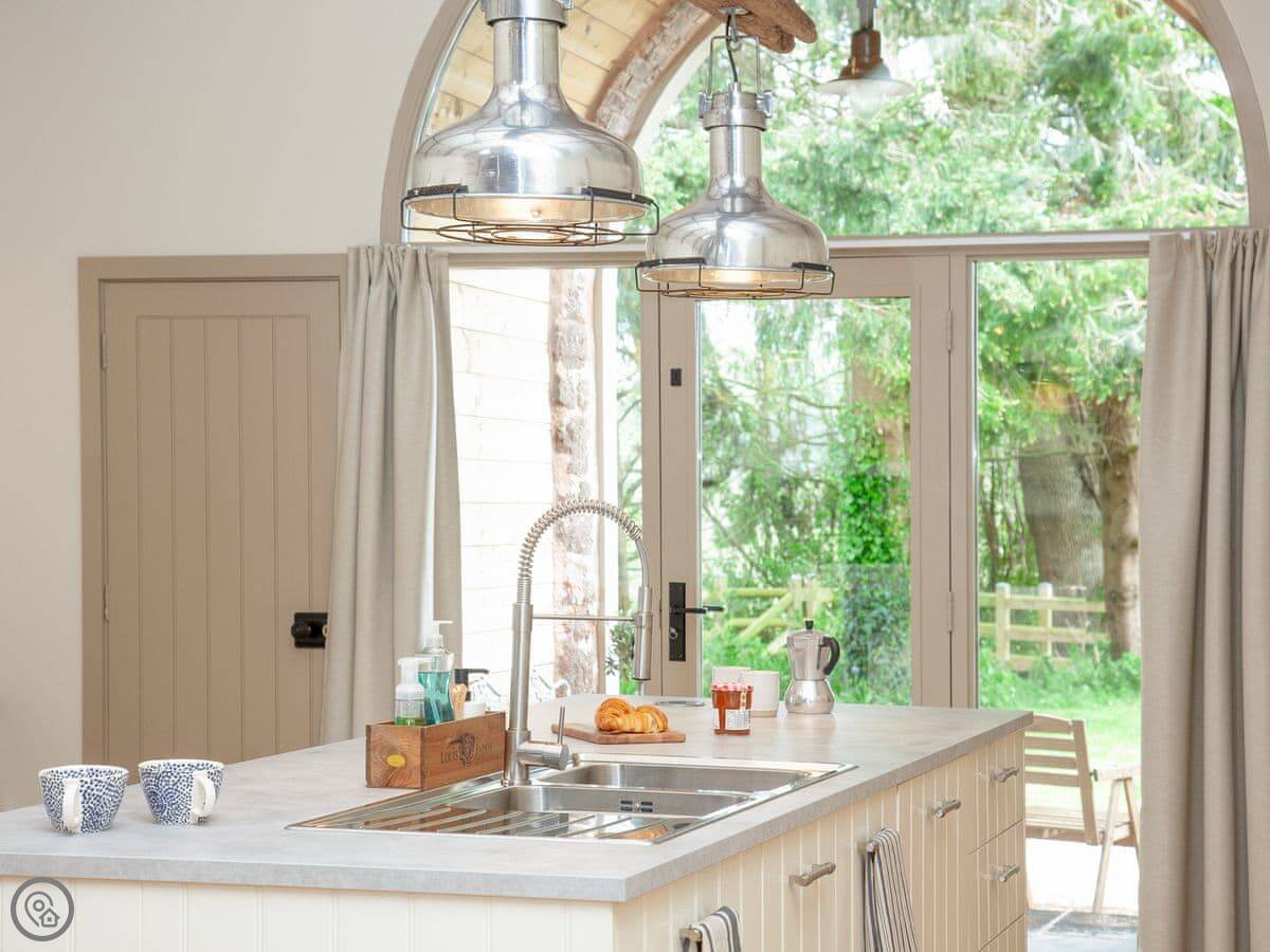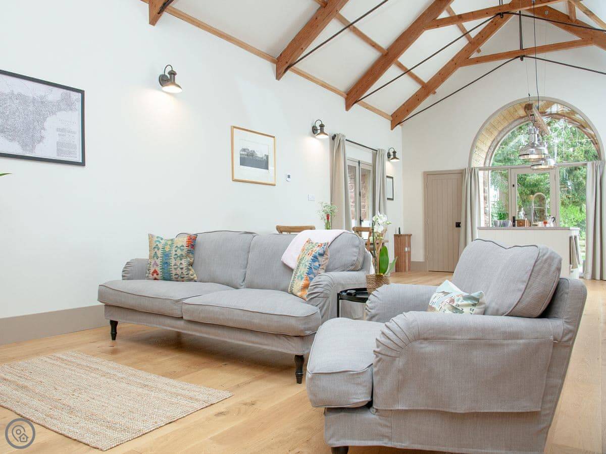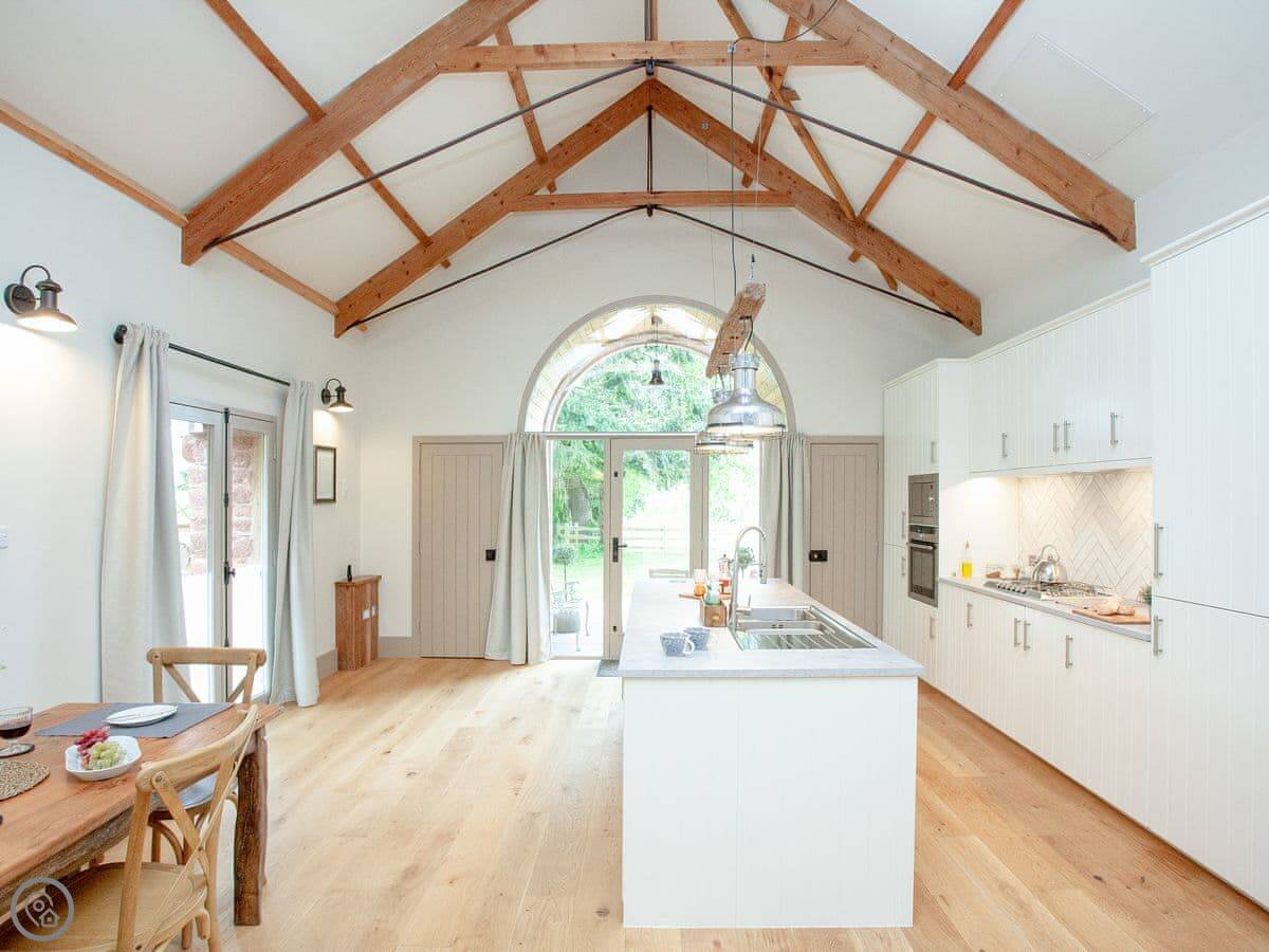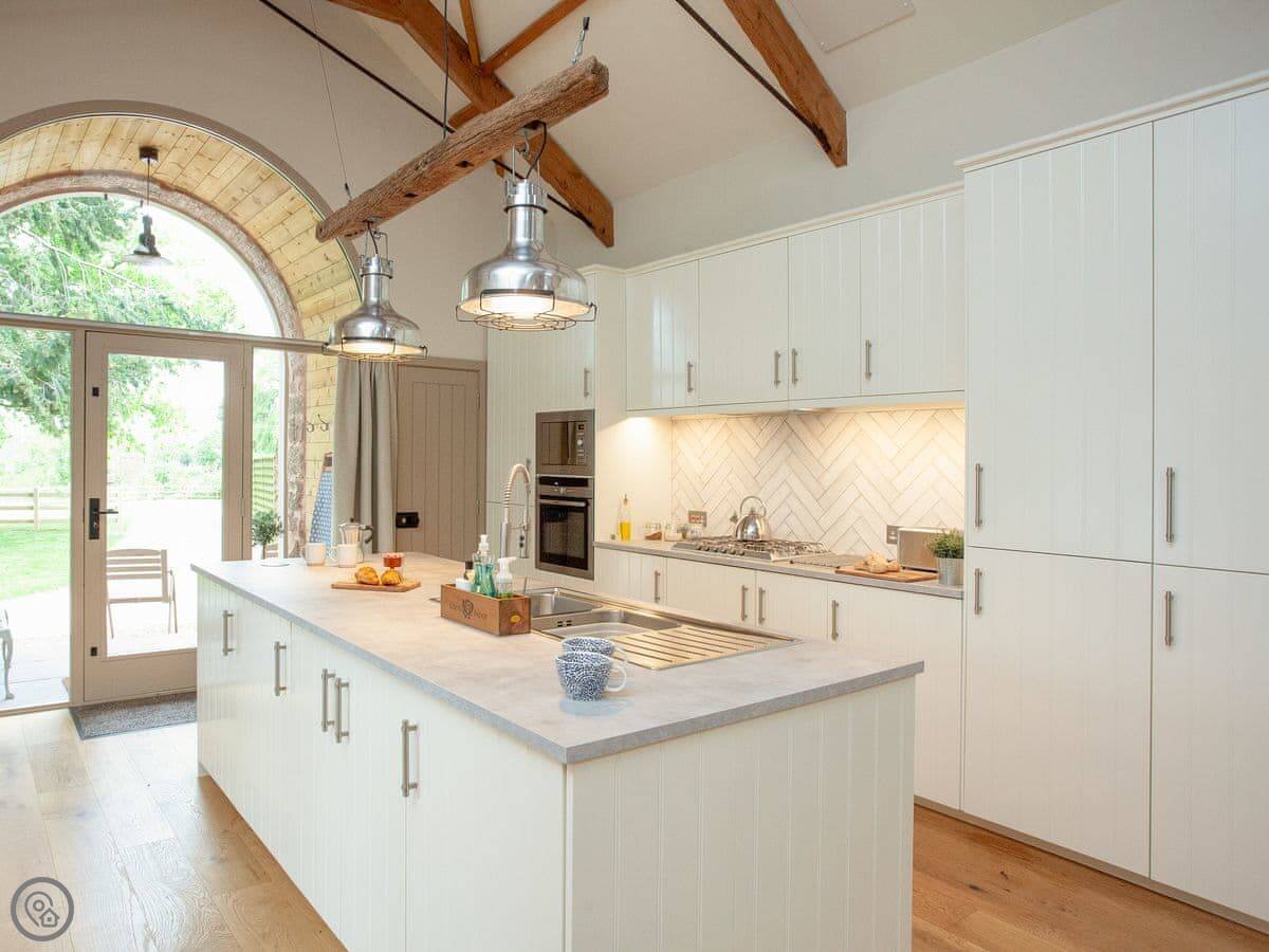 Through the entrance and into the property itself is the real wow factor, with vaulted ceilings and the entire property being open plan. The kitchen area is beautifully designed and decorated with large island and stunning overhead lighting. The dining area with table & chair seating is opposite, making for a great social atmosphere. Slightly further down the room is the lounge area with sofa seating and gorgeous double-sided free-standing log burner, a great feature for relaxing in front of the TV cuddled up after a long day exploring. The sleeping area is at the end of the property with a sliding wardrobe storage across the far wall, all made from reclaimed wood from the original barn itself! The door to the bathroom is accessed via the sleeping area and boasts free standing bath and separate shower enclosure. A wonderful feature of the bathroom is the glass panel in the ceiling looking at the old threshing machine wheels, restored from the original threshing barn.