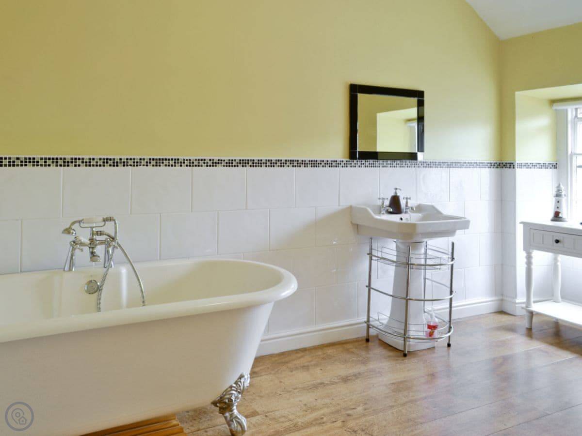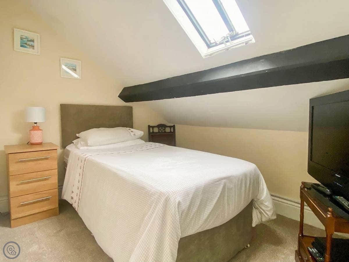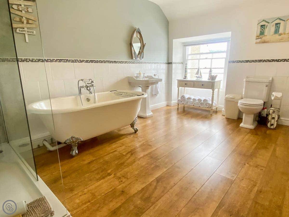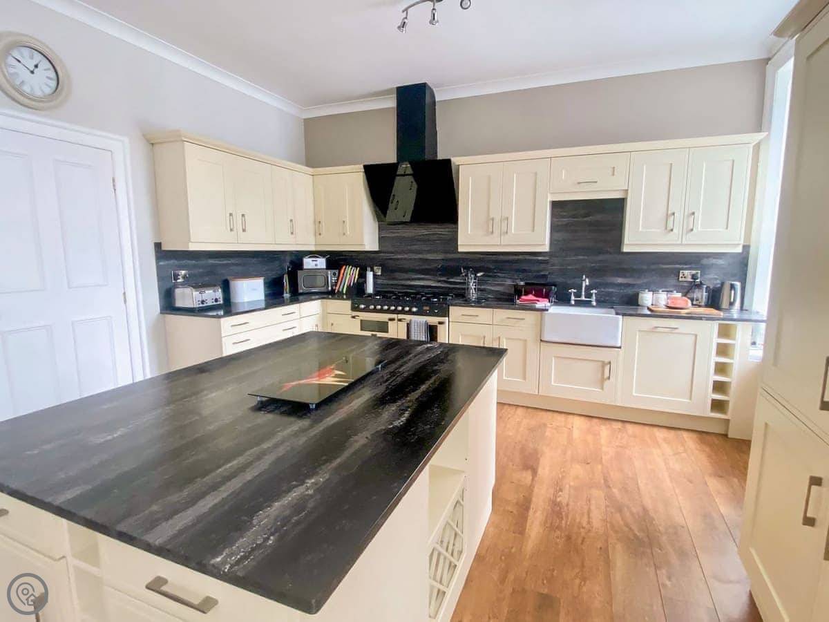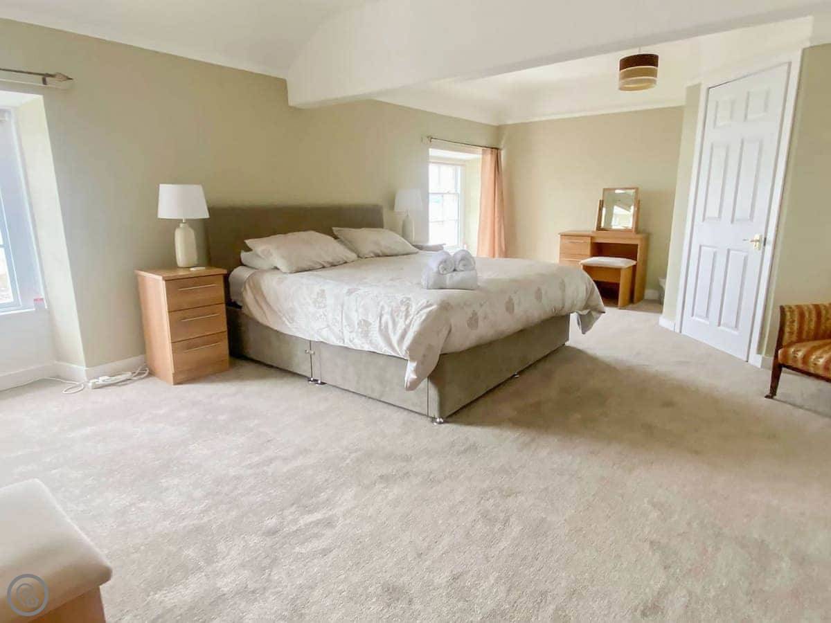 It sleeps nine people. Five bedrooms, two bathrooms. It's got a 4 Star rating. It's a listed building, so it's full of character but it's not a new build. The stairs are a point to note, they're steep in places and a bit narrow. Just be aware if you've got toddlers or anyone less steady on their feet.