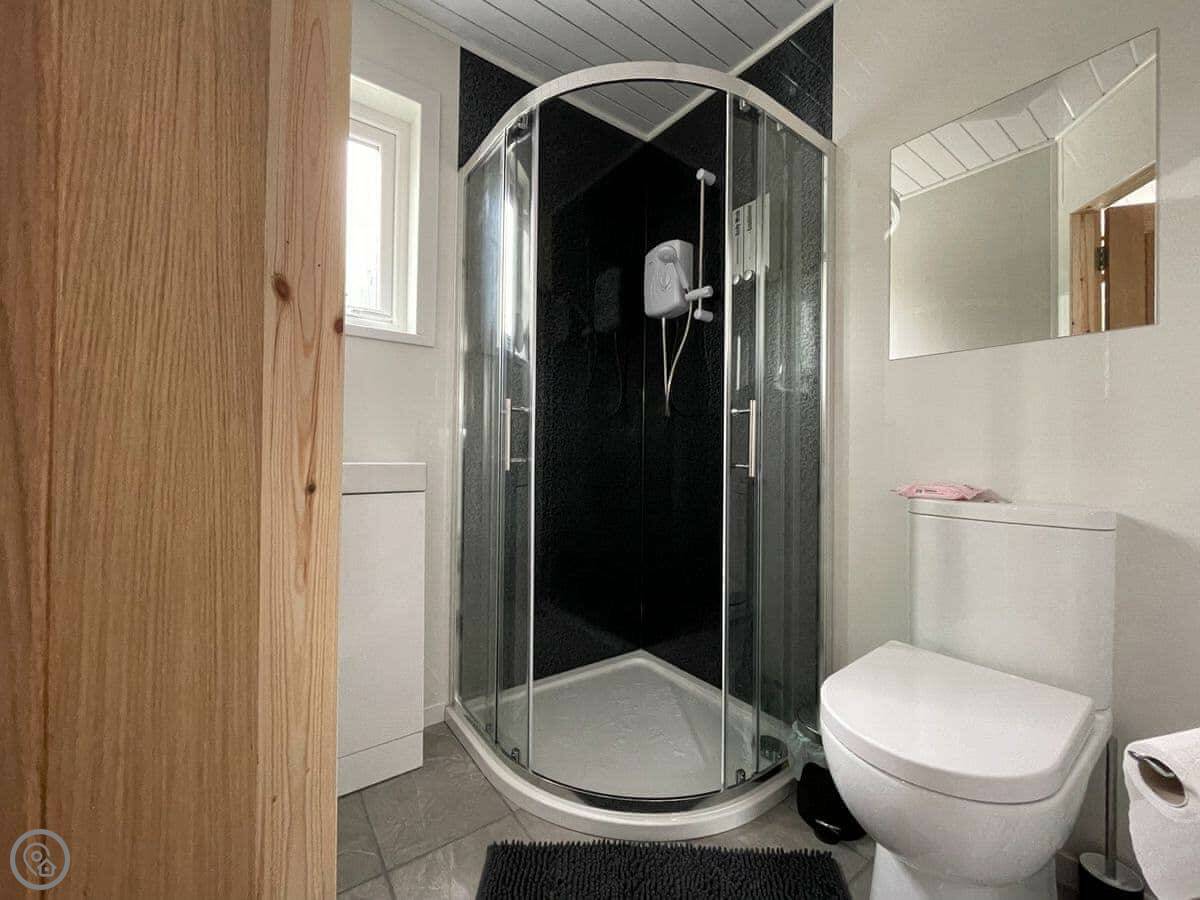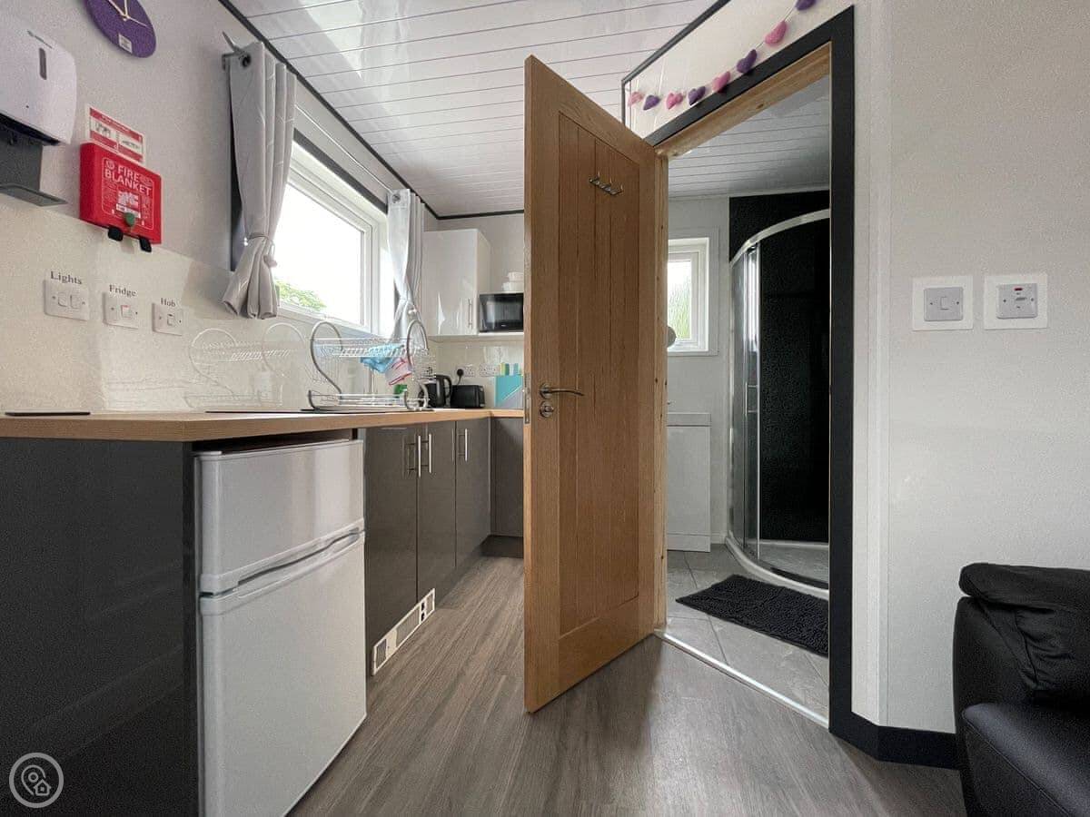You walk in and it's all one open space. The ceiling is quite high, so it feels bigger than you'd think from outside. There's a kitchenette along one wall, a table and chairs, and the bed. The shower room is a decent size. Everything you need is in there.