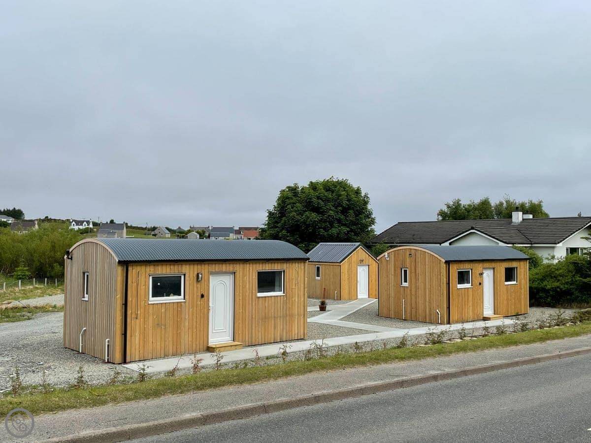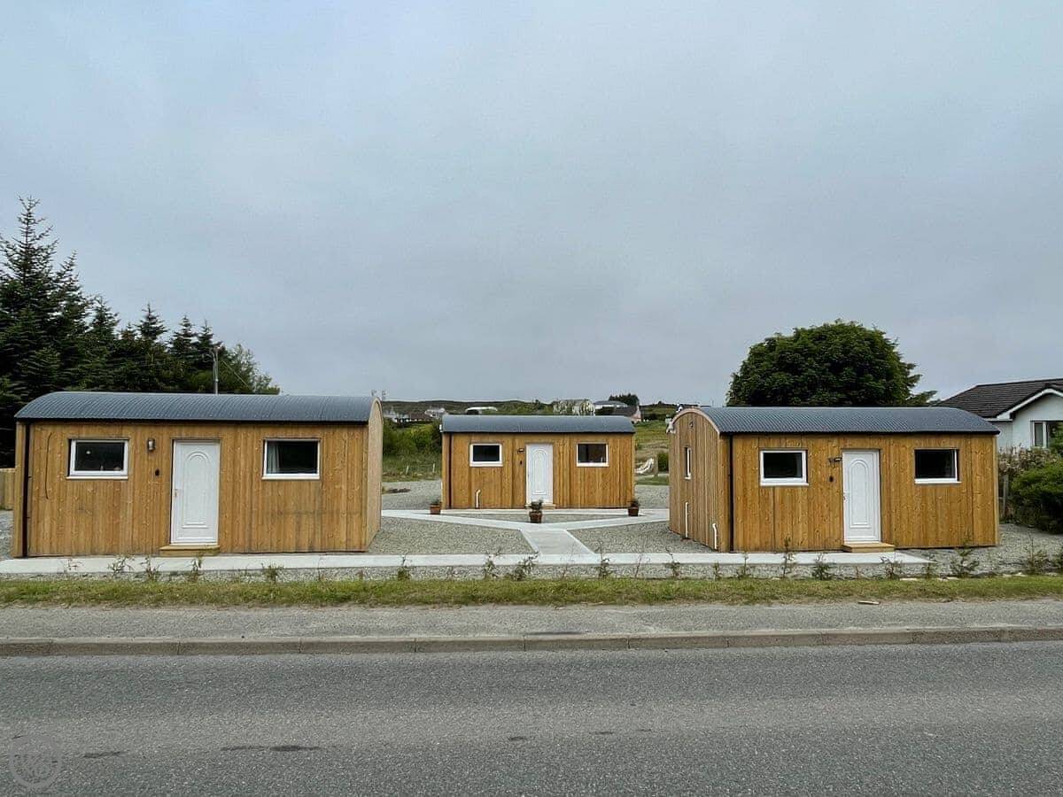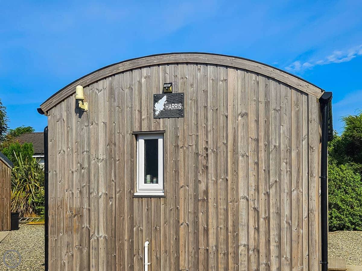 This is Harris, one of our holiday huts on the edge of Stornoway. It's a single-storey, detached building, basically a big wooden shed done up nicely. It sleeps two in one main room. There's a double bed and a sofa bed, so it's flexible. It's a 3 Star place, which means it's comfortable, clean, and practical, but not a hotel.