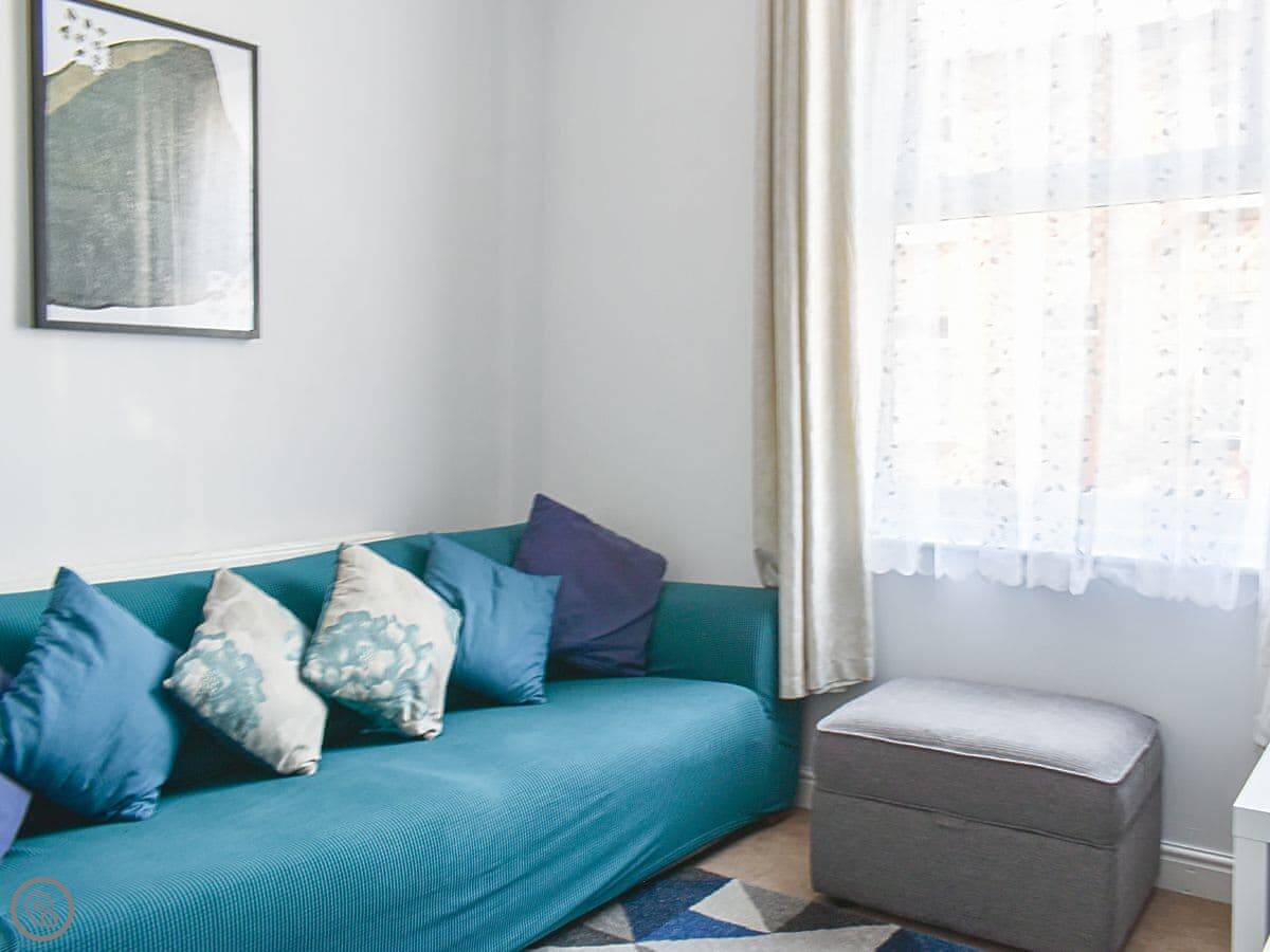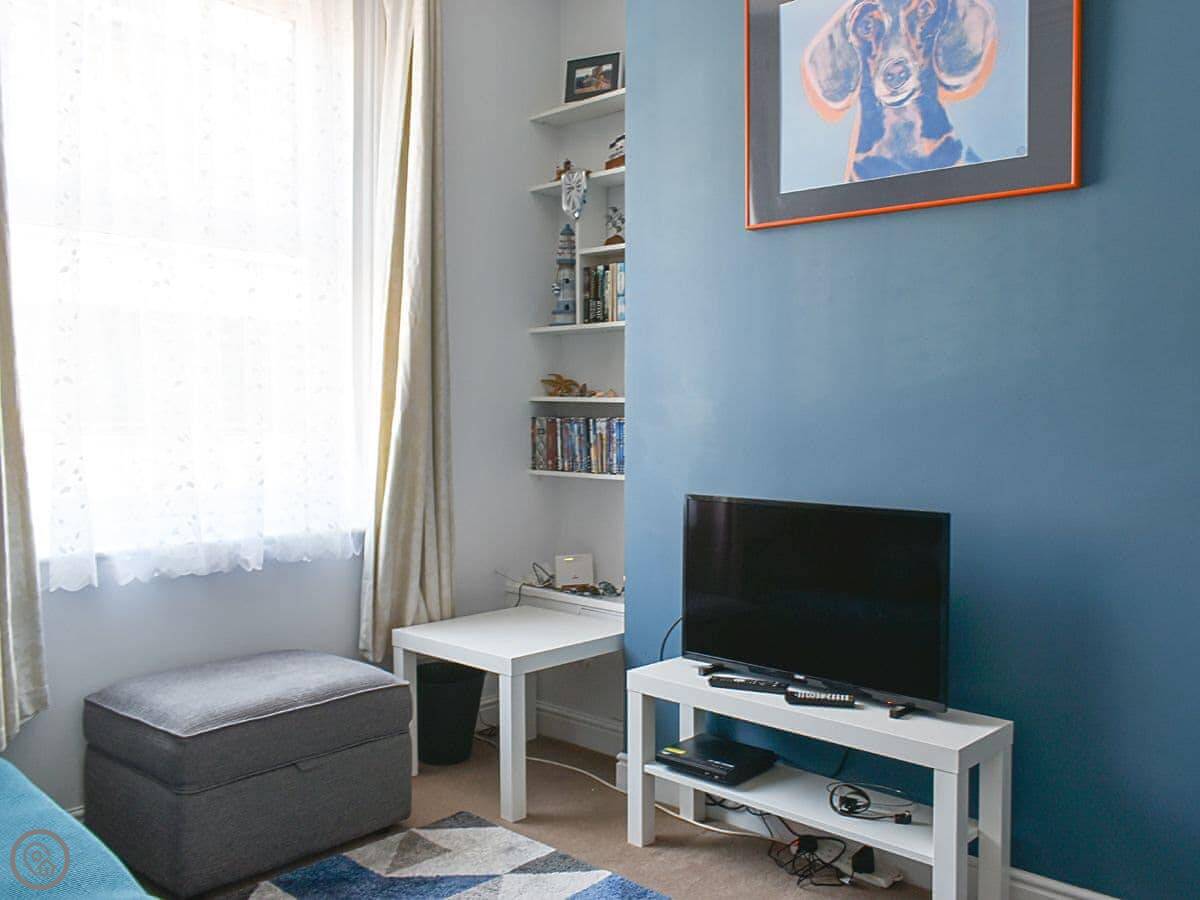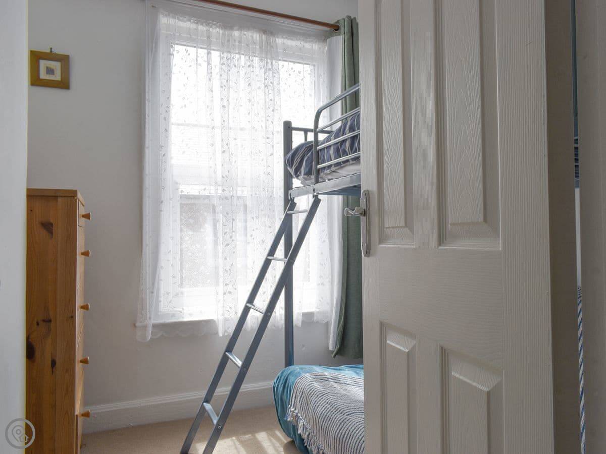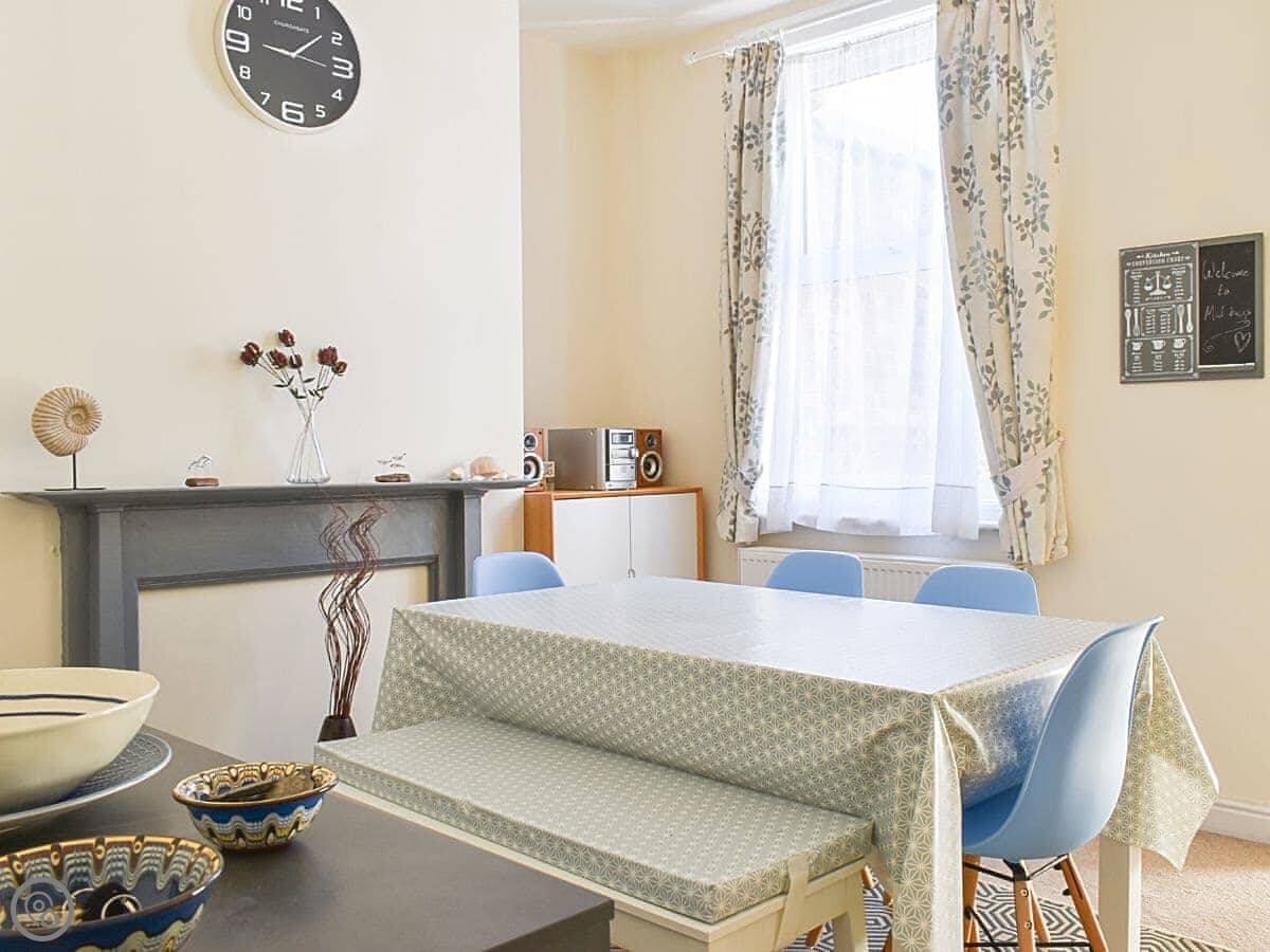 Midbays is in Scarborough, a few streets back from the North Bay. It's a three-storey terraced house, so it's tall and narrow. The back has a small enclosed patio with a table and chairs. There's a lockable shed out there, useful for bikes or beach gear.
