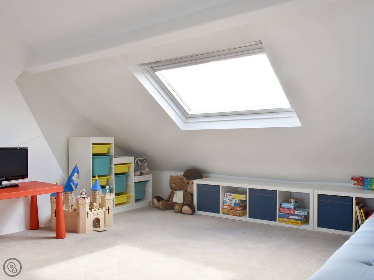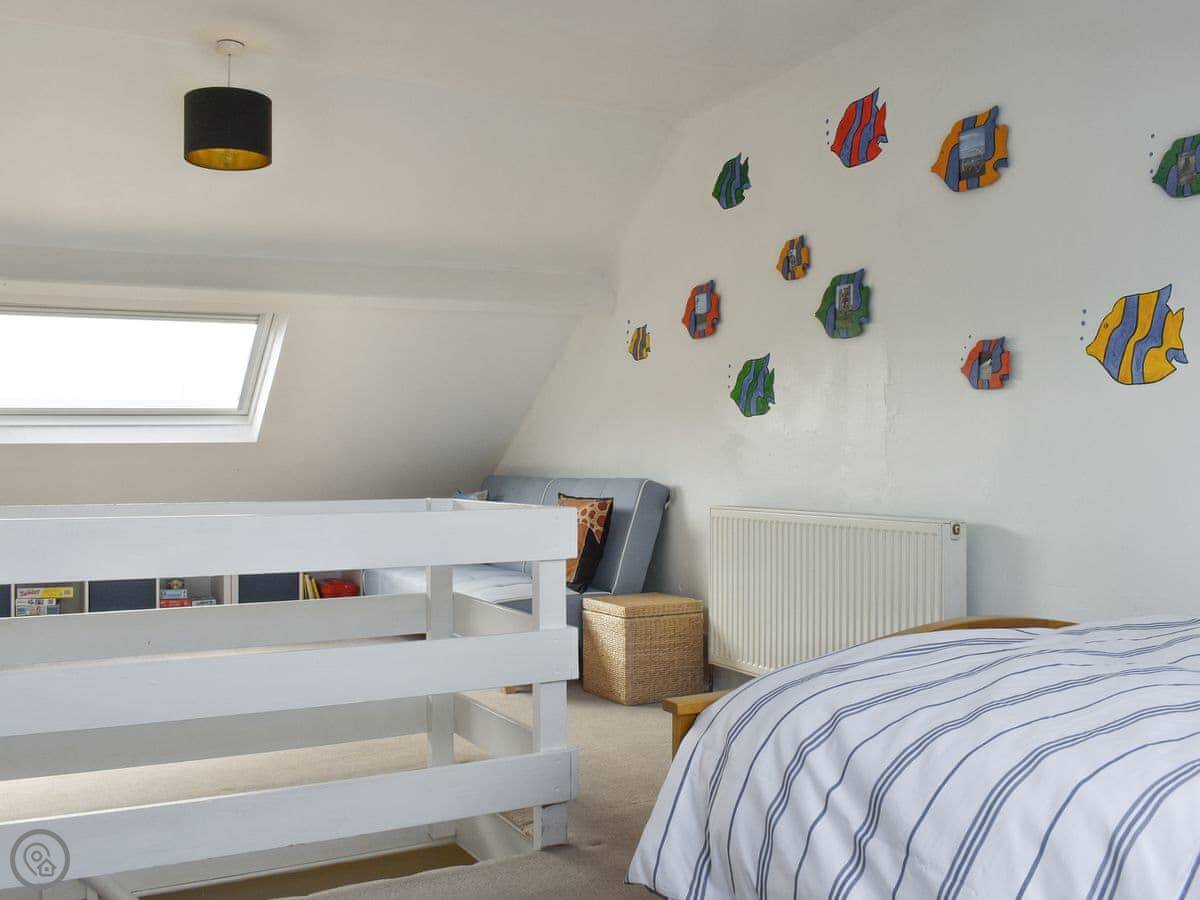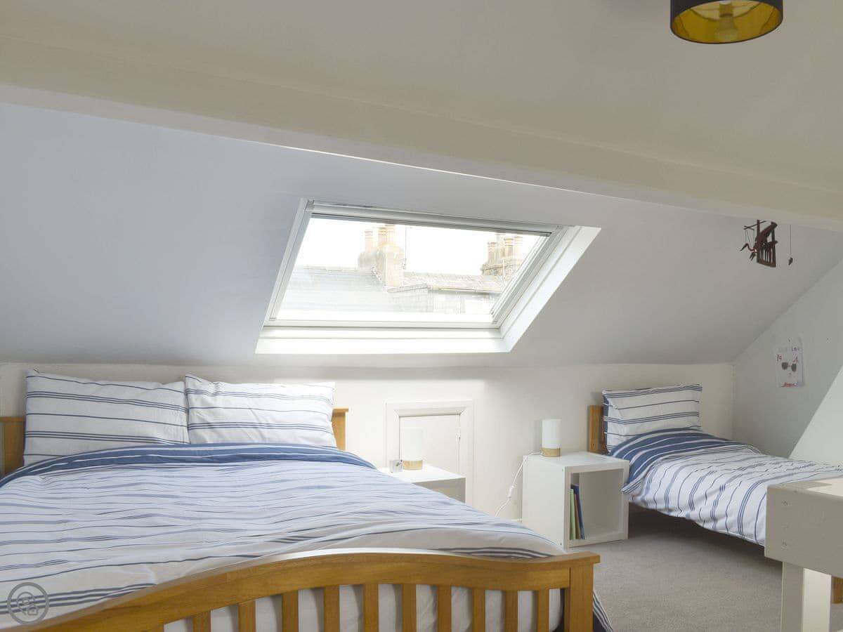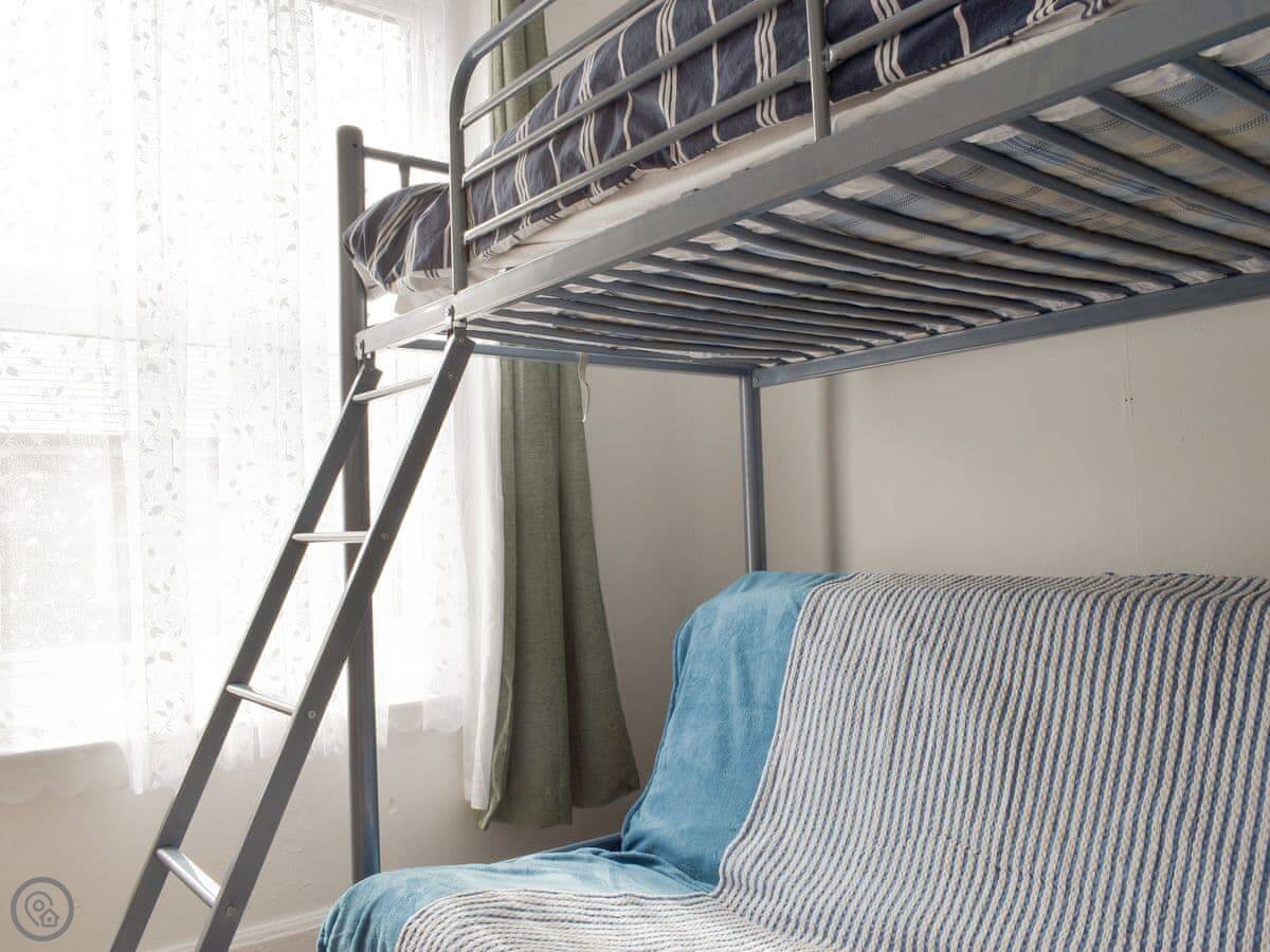 The layout is flexible. On the first floor, there's a double room and a bunk room with a single bed over a sofa bed. The top floor is under the eaves. It's a big room with a double bed, a small single bed, and a sofa.