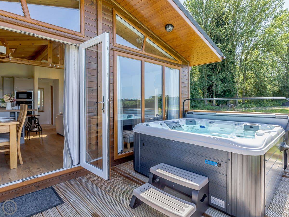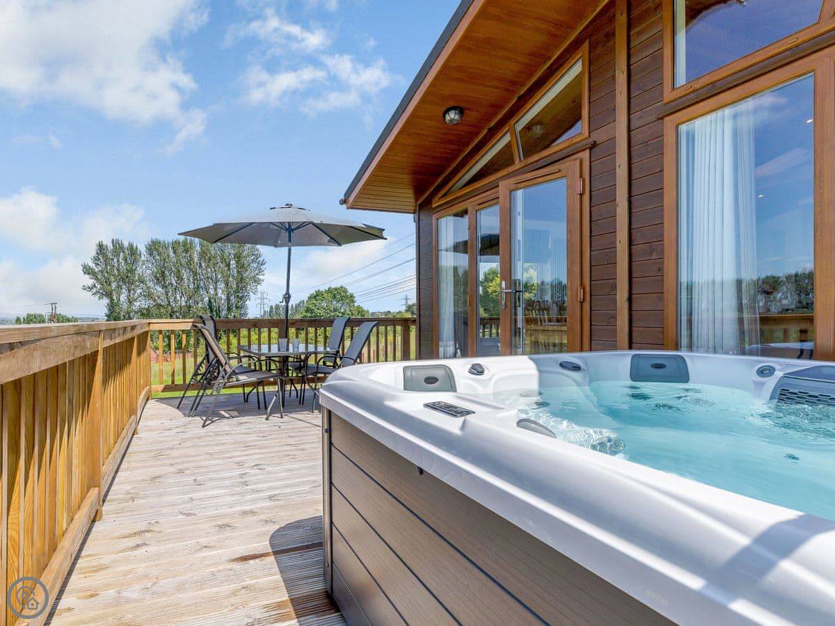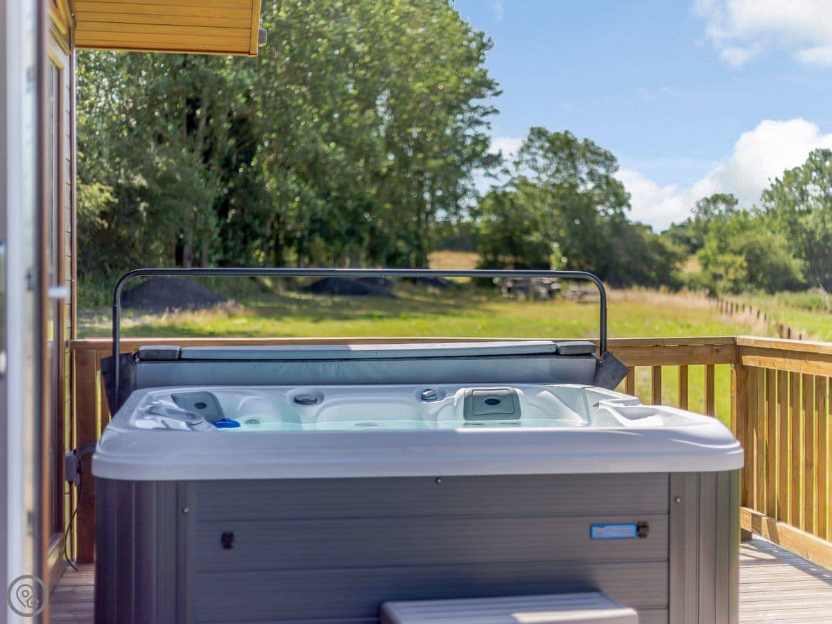 Outside, there's a decked area with a BBQ and a hot tub. You're looking out over the fields.