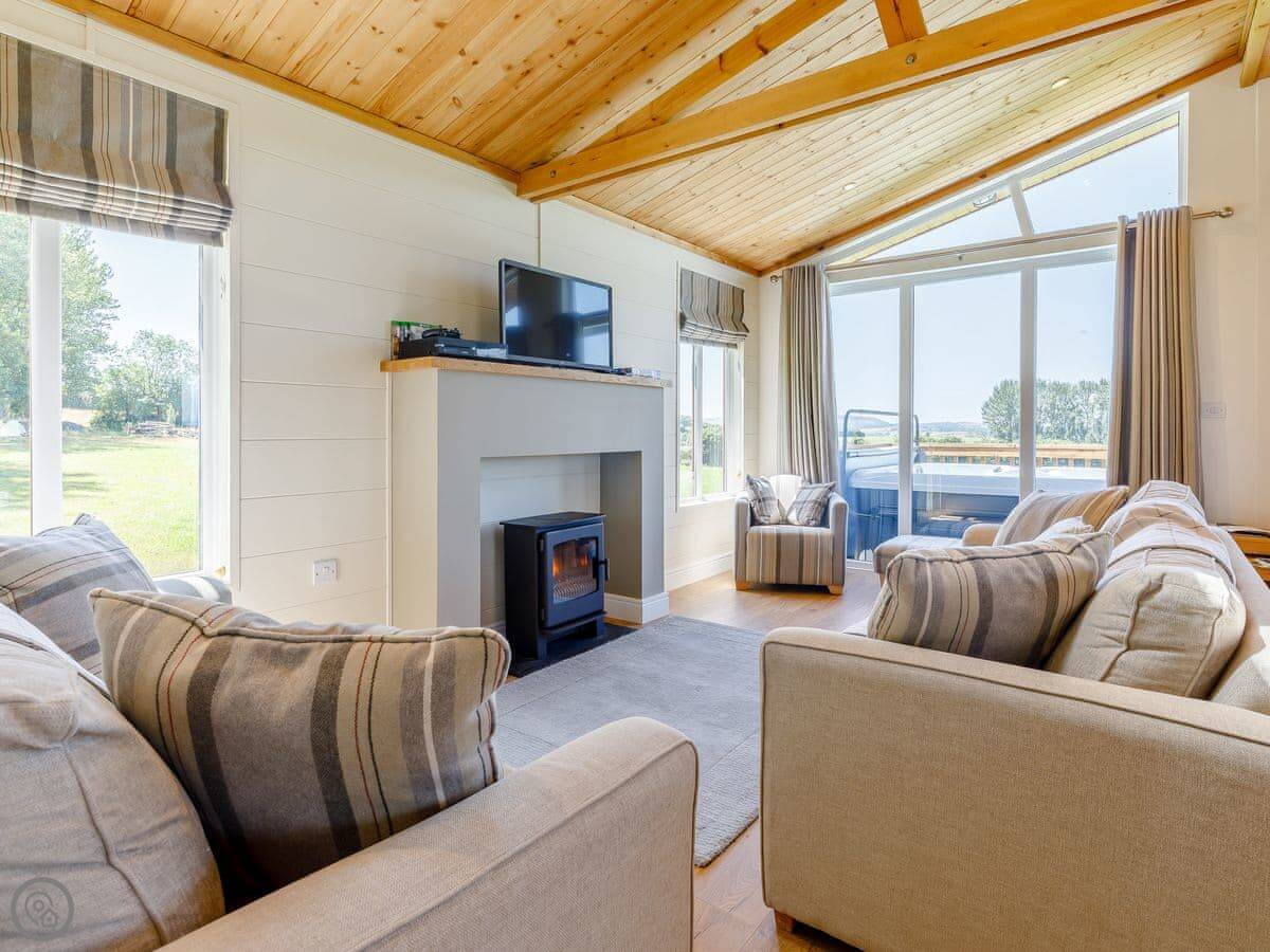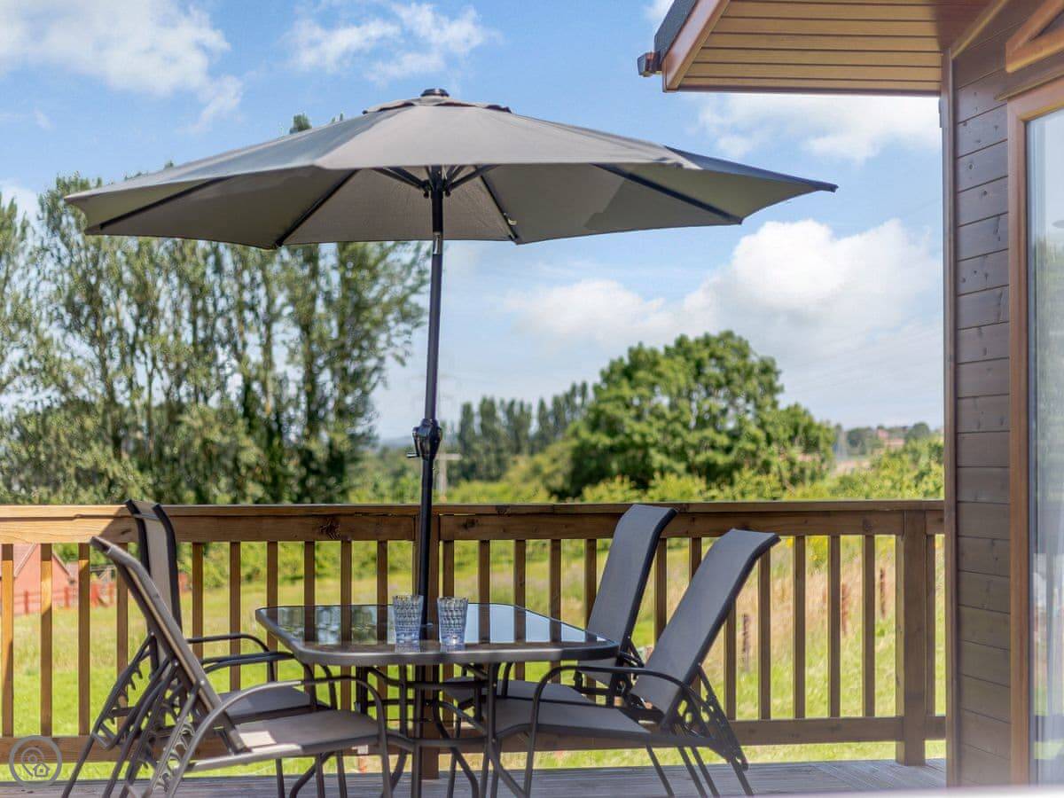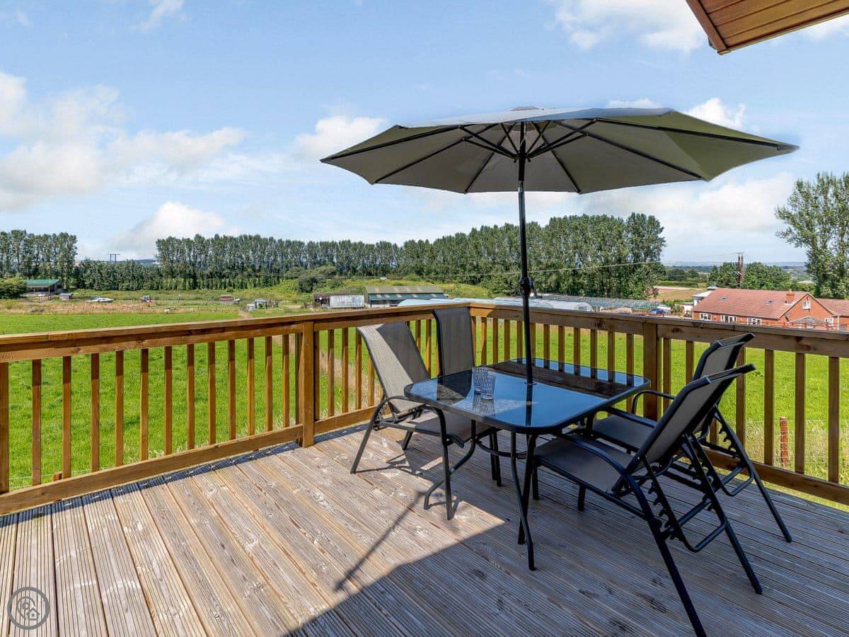 Outside, there's a decked area with a BBQ and a hot tub. You're looking out over the fields.