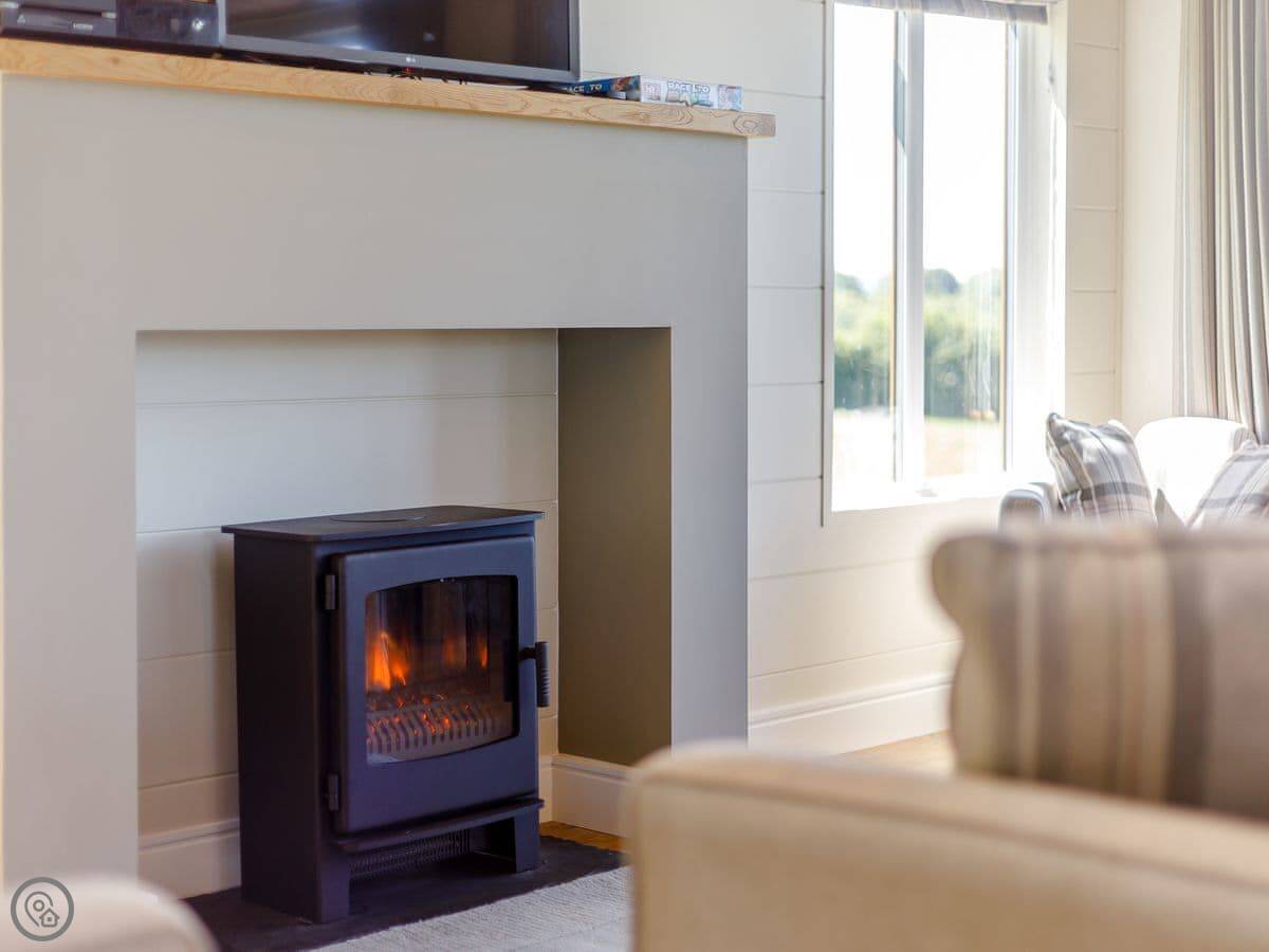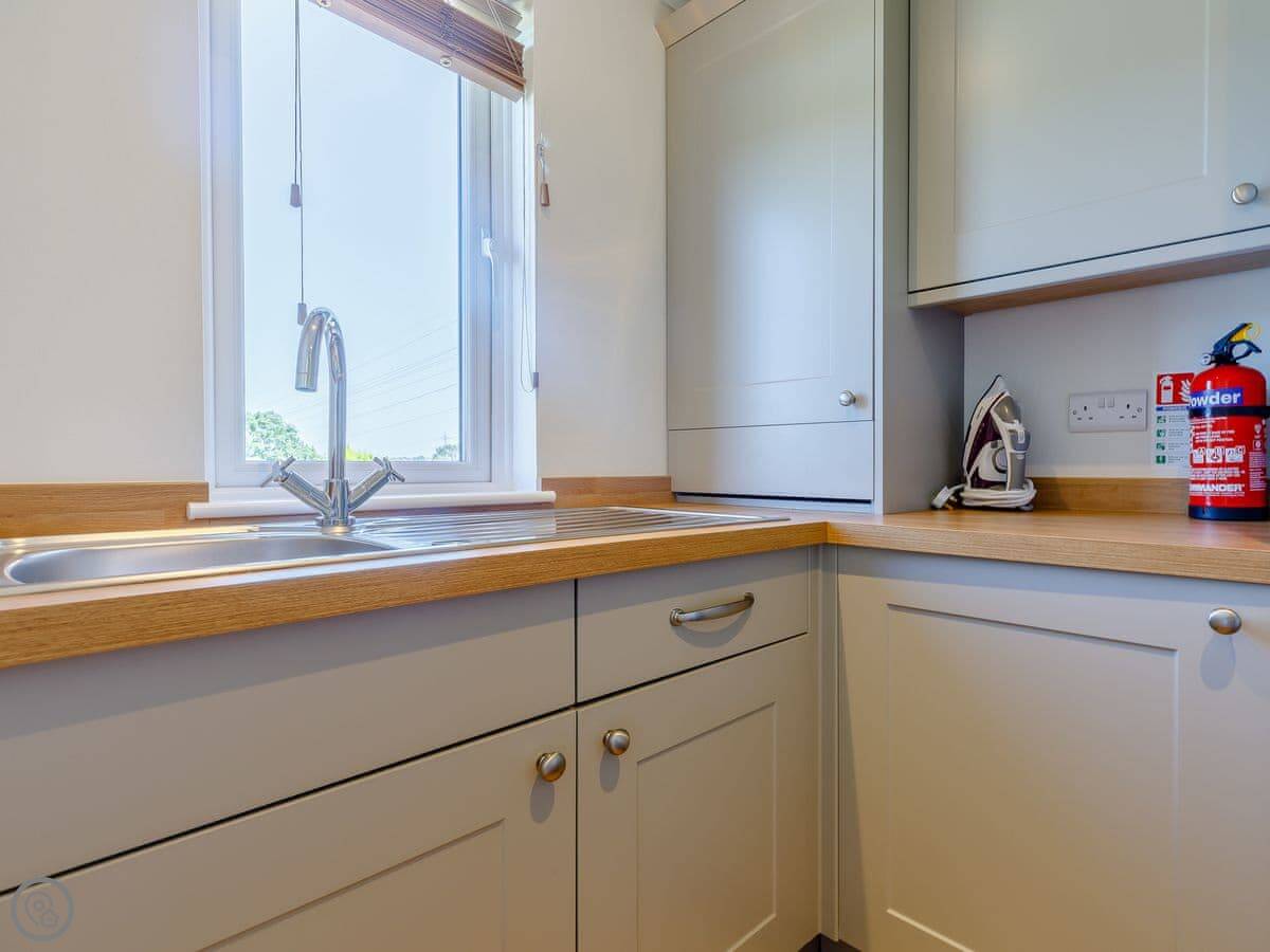 The main room is big and light with those floor to ceiling windows. There's a big fireplace, though it's electric. The kitchen has what you'd need, including a dishwasher. There's a utility room with a washer-dryer, which is handy for boots and coats.