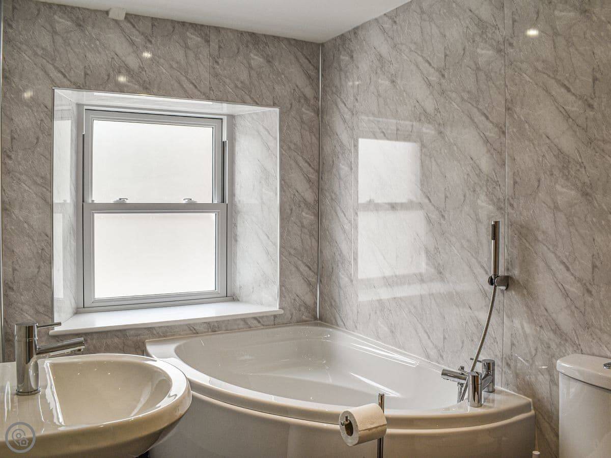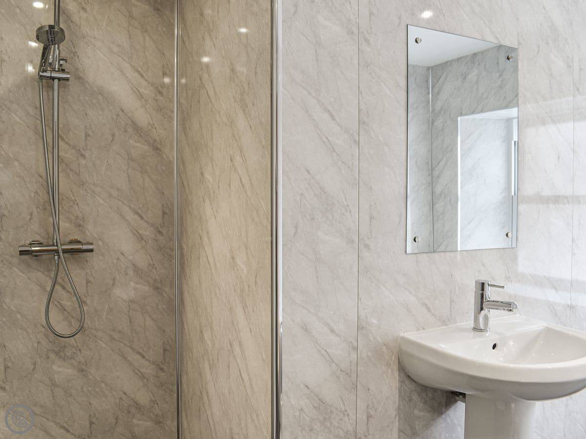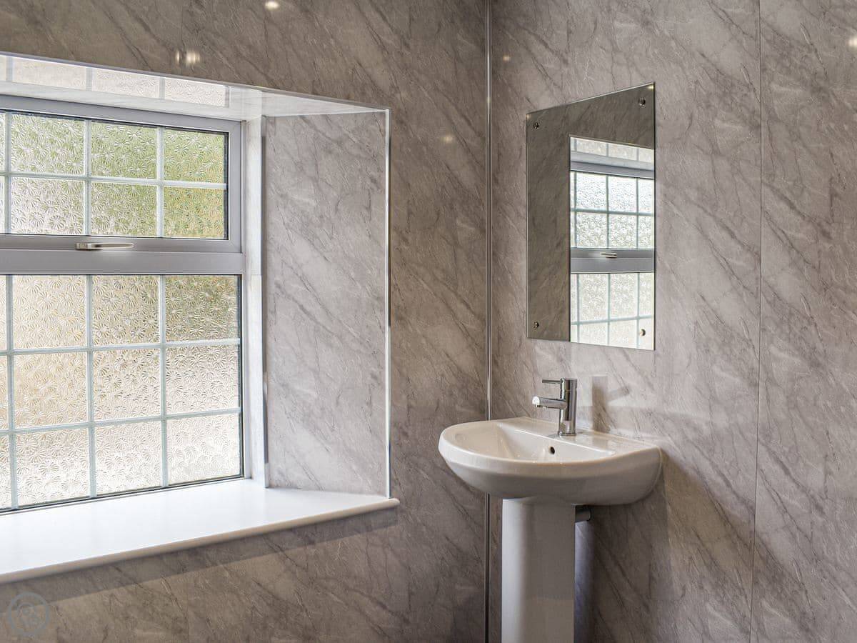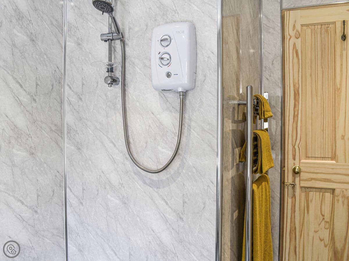It sleeps seven. Four bedrooms and two bathrooms. One double has an en-suite. It's a 4 Star place, so it's comfortable and well-kept. The kitchen is big and has everything you need. There's a wood burner in the living room.