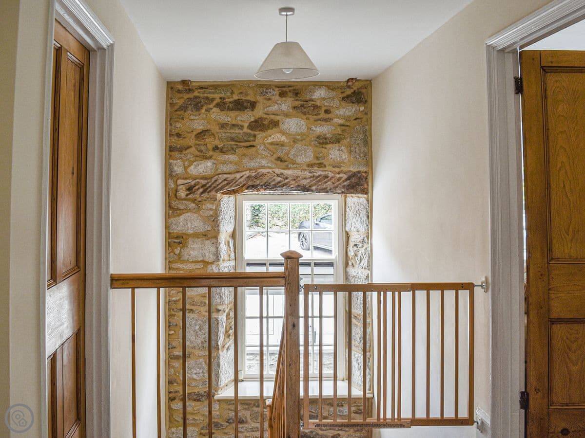 The stairs are normal house stairs. There's a sun room you come through first, which leads to a utility room with an old stone fireplace. The garden is a decent size.