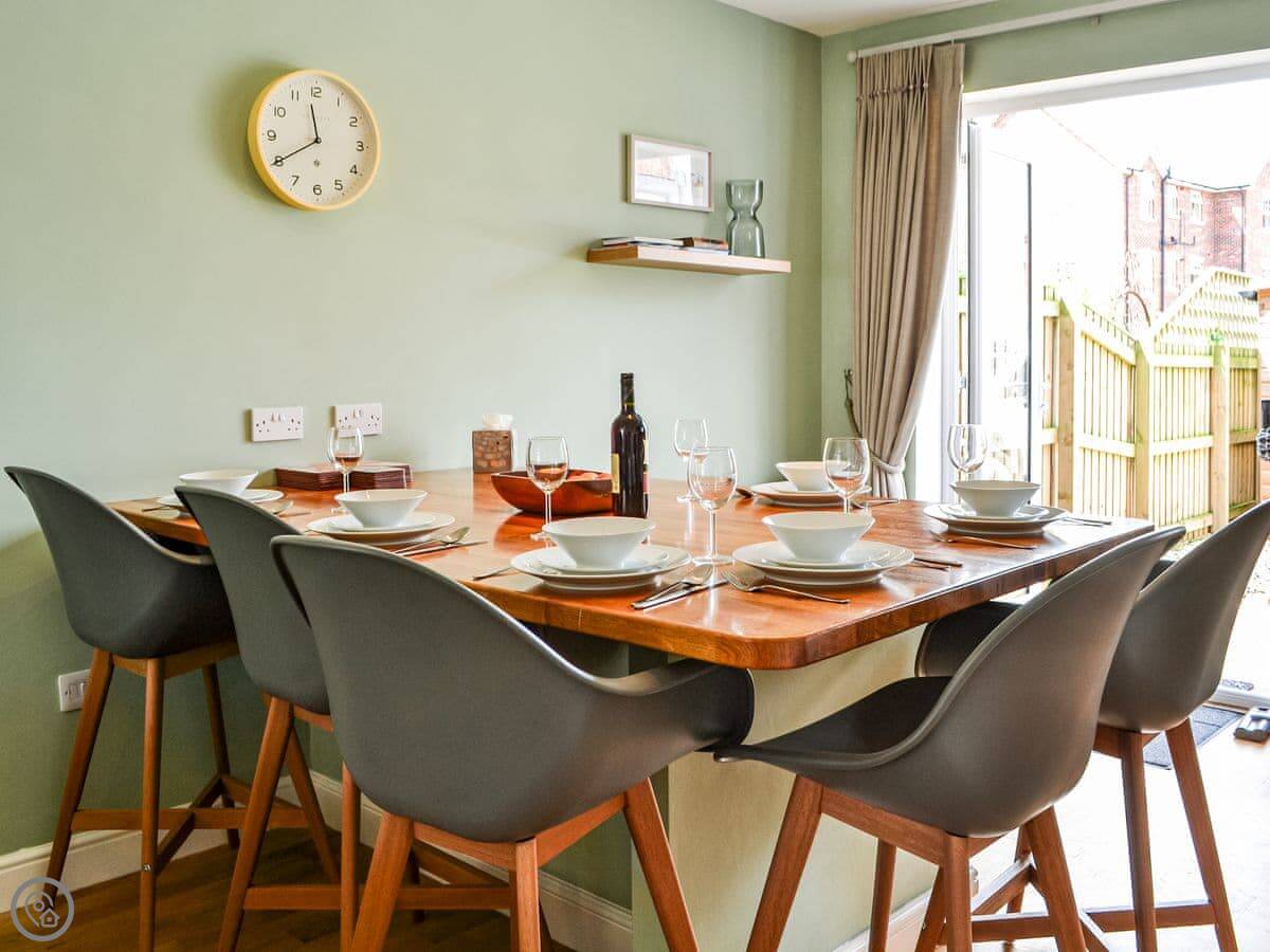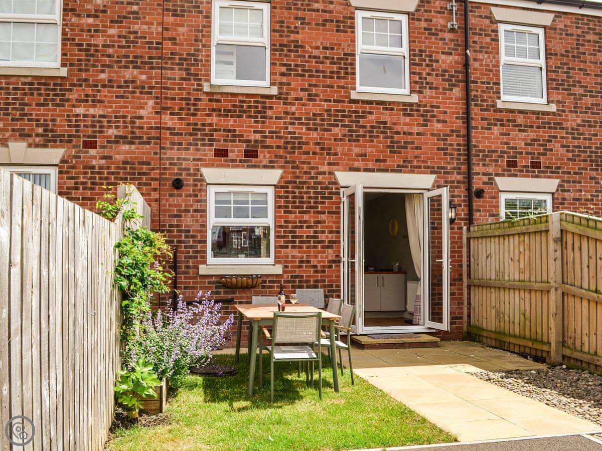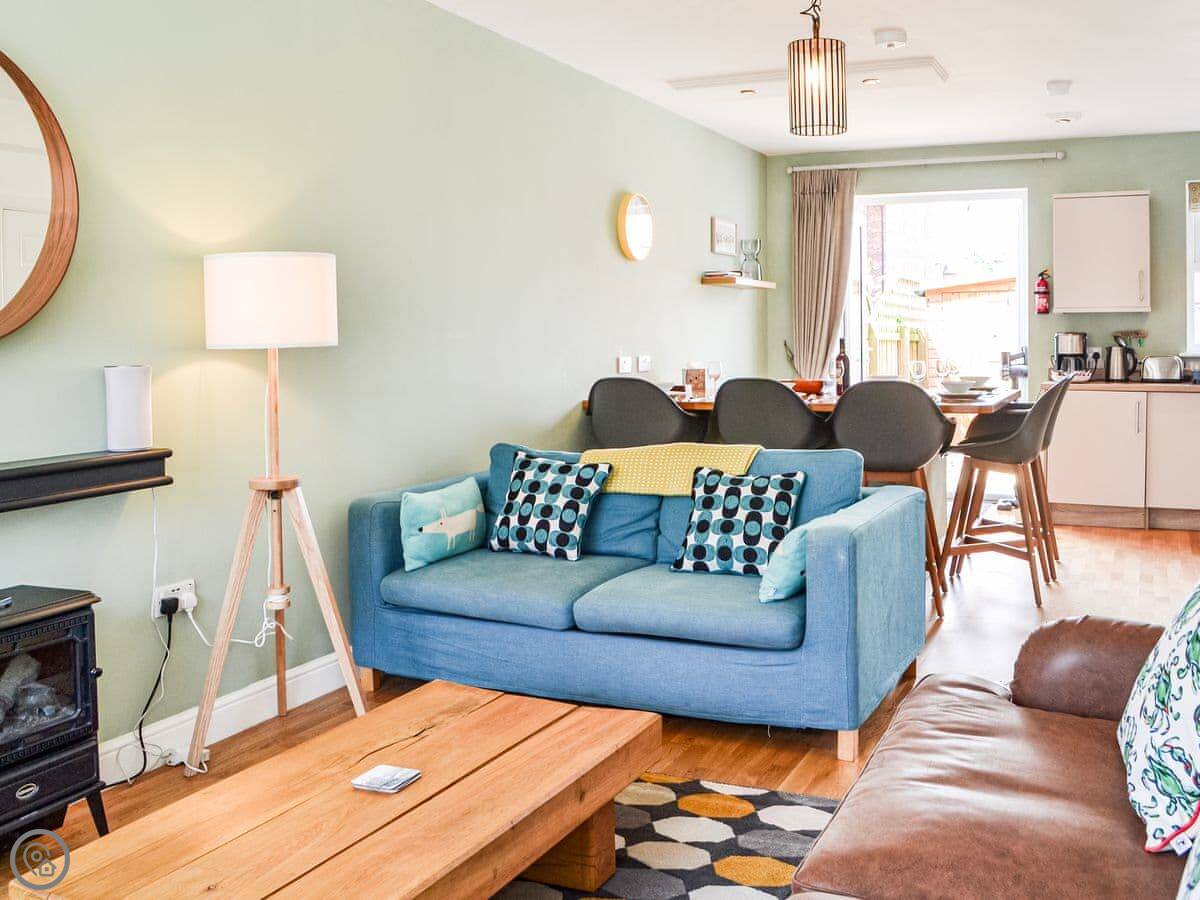 The living area is open plan. The kitchen has what you need, including a Nespresso machine, but you'll need to bring your own pods. There's a breakfast bar with stools. The back door opens to a small patio with seating.
