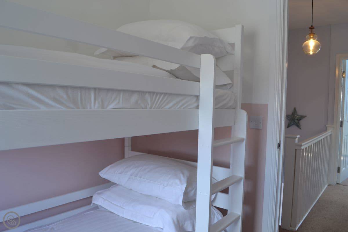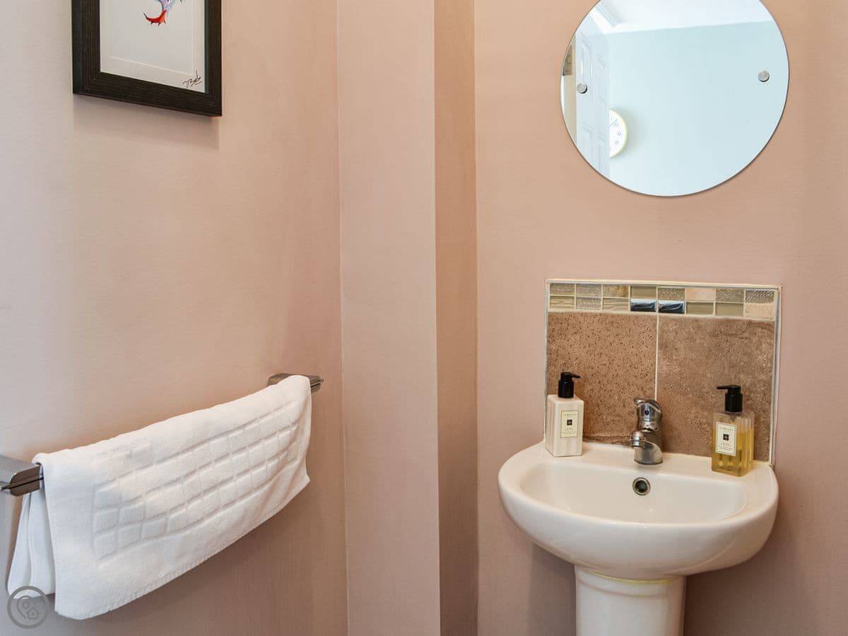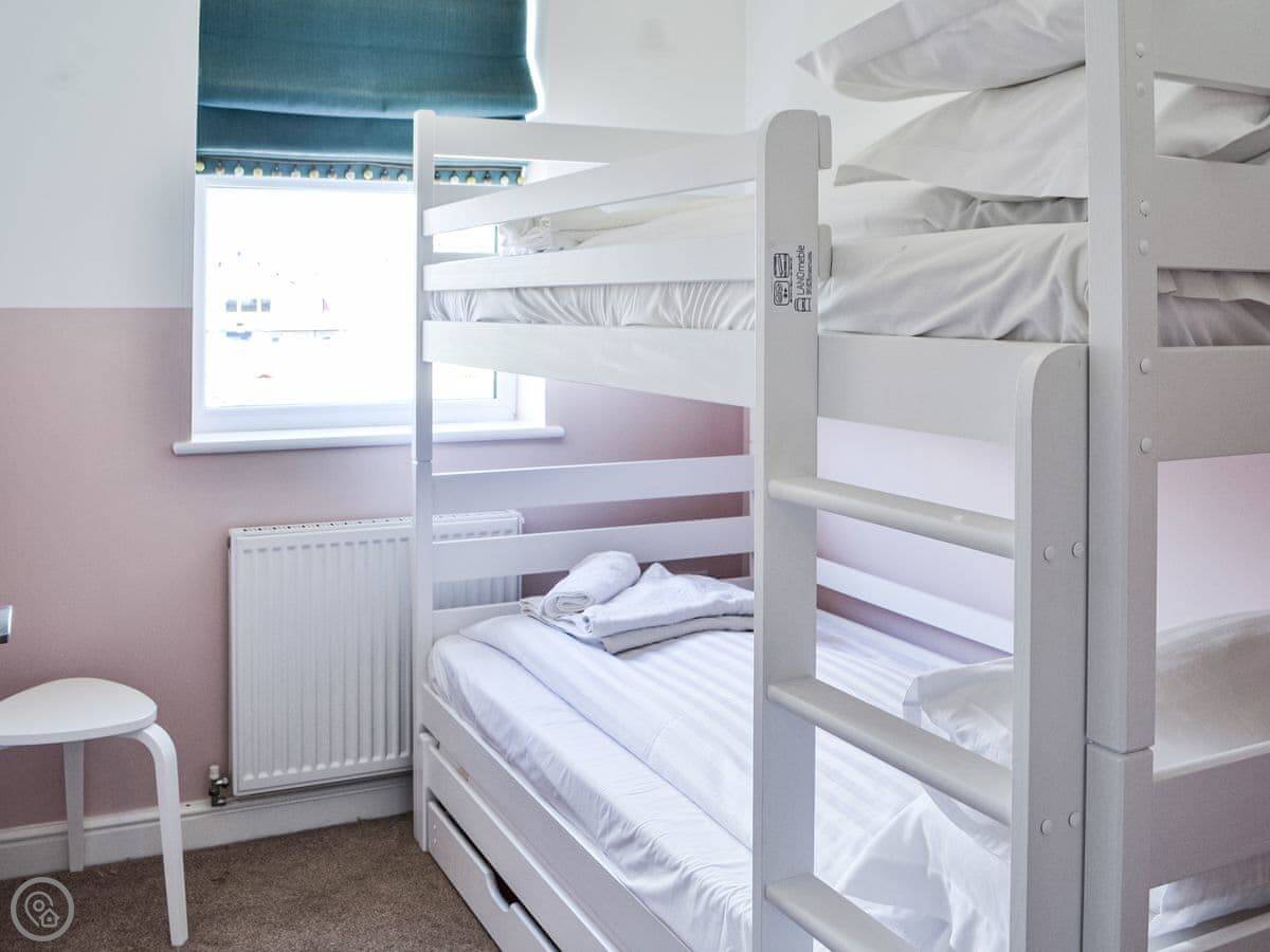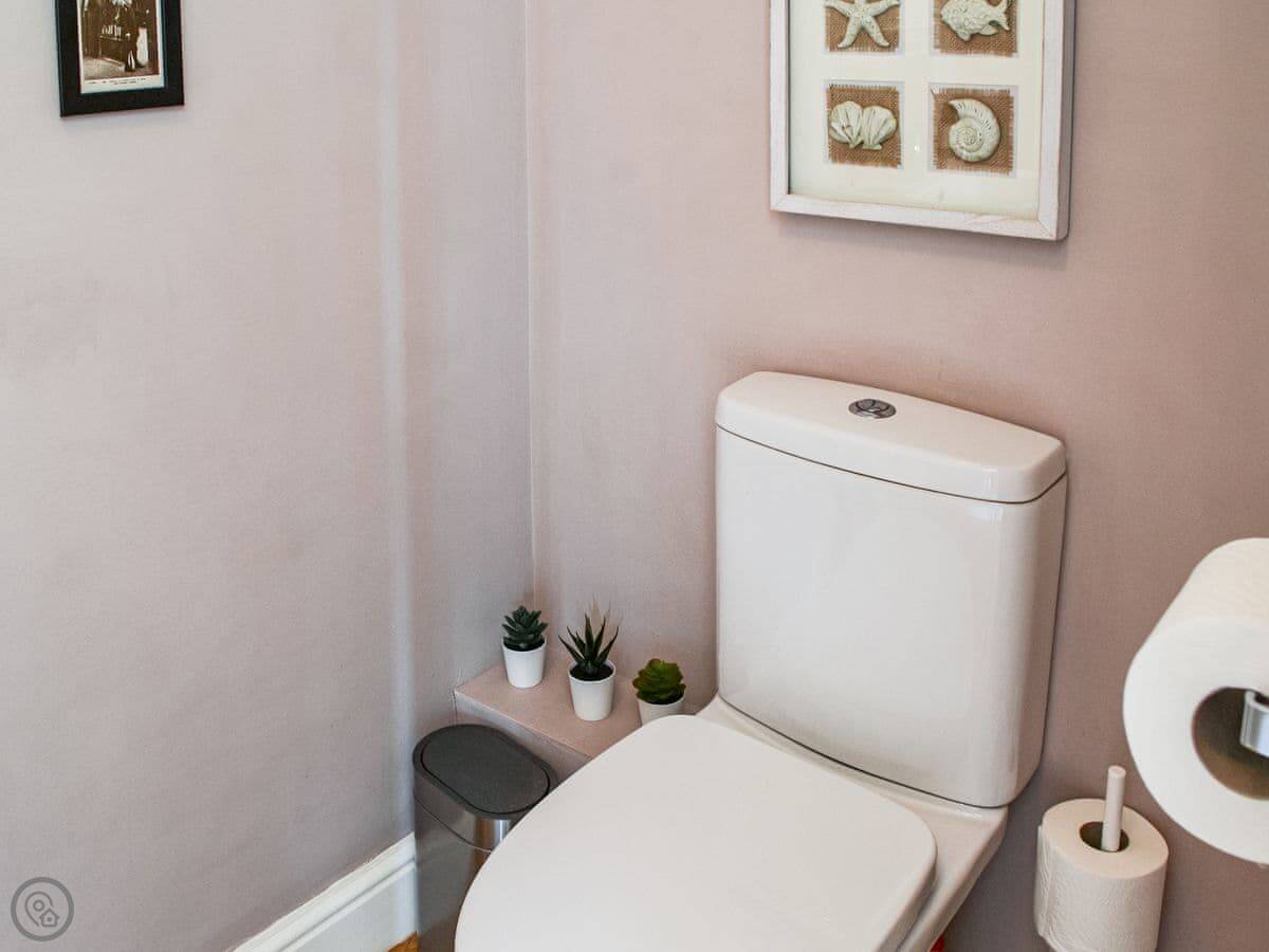 It sleeps six. Three bedrooms, one bathroom. It's got a 4 Star rating, so it's well-fitted and comfortable. The stairs are fine. There is a WC under the stairs, which is useful.