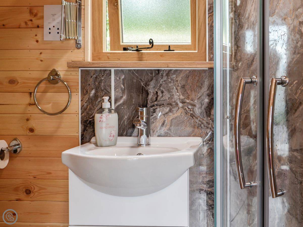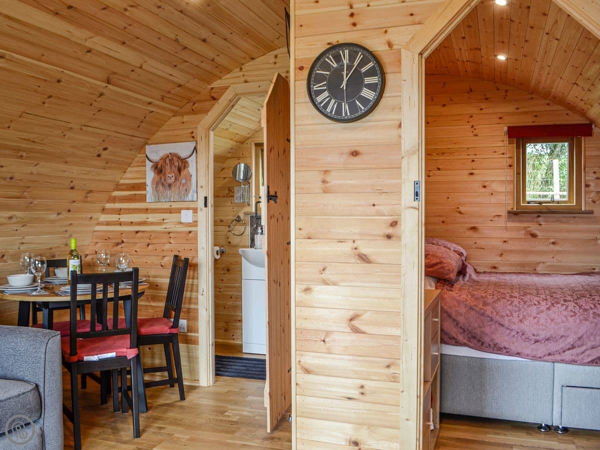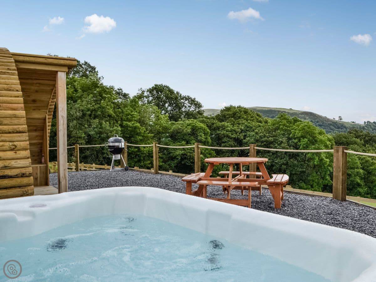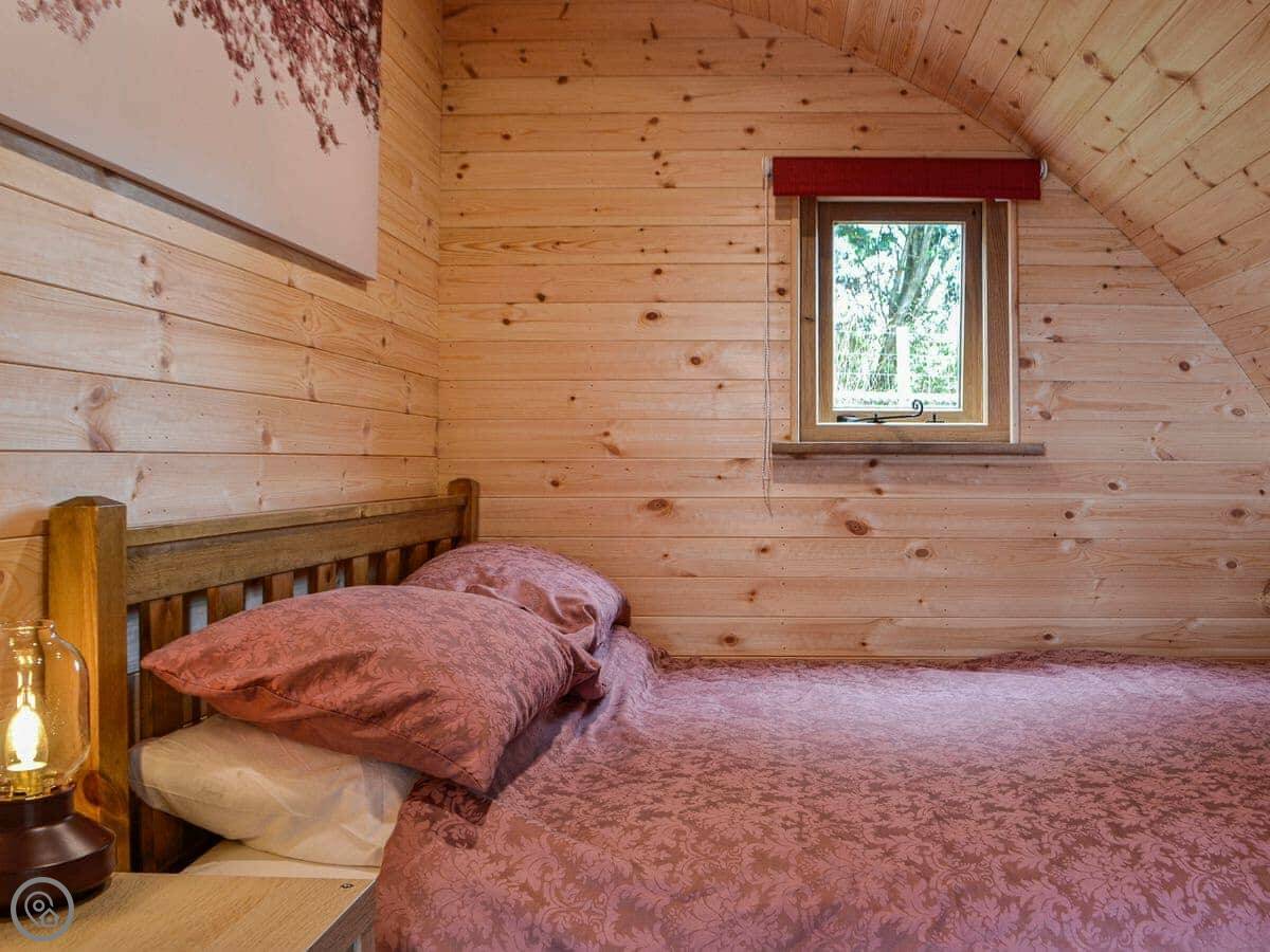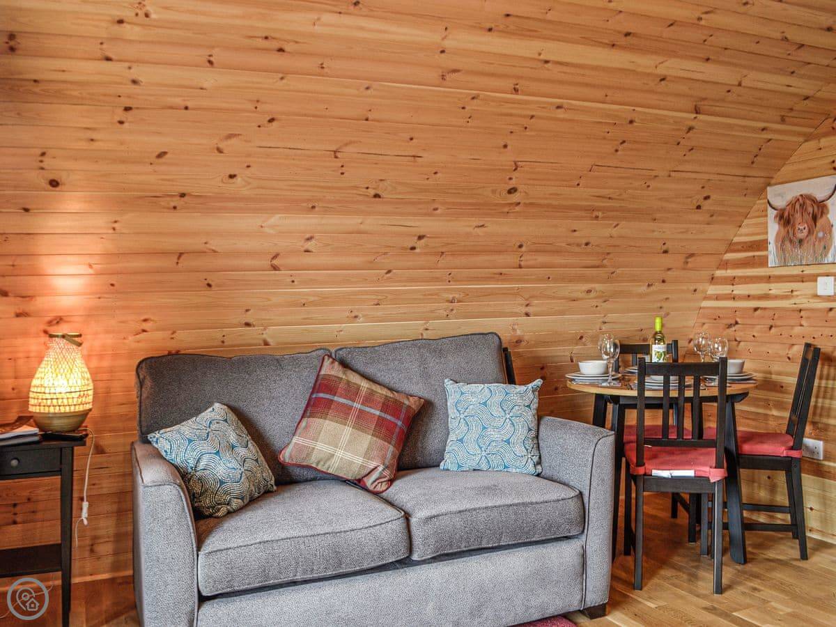 The pod sleeps four. There's one bedroom with a double bed, and a double sofa bed in the main living space. One shower room. It has a 5 Star rating, which means it's well equipped and comfortable. The main deck has a hot tub and a fire pit.