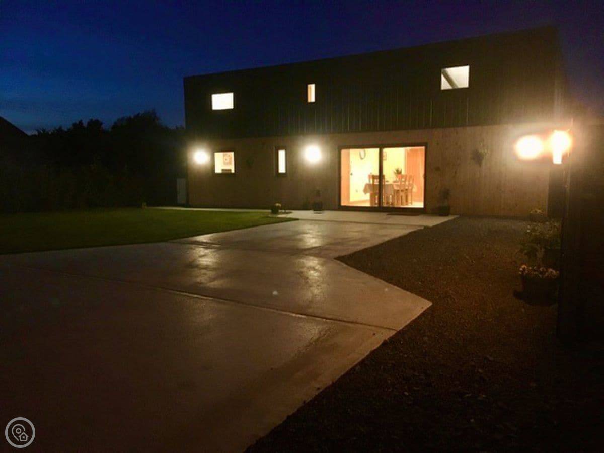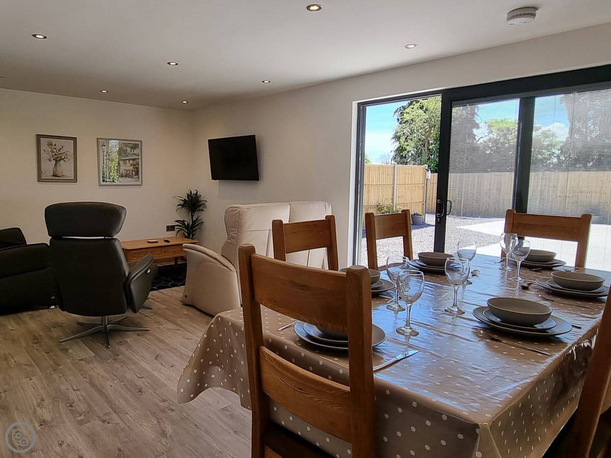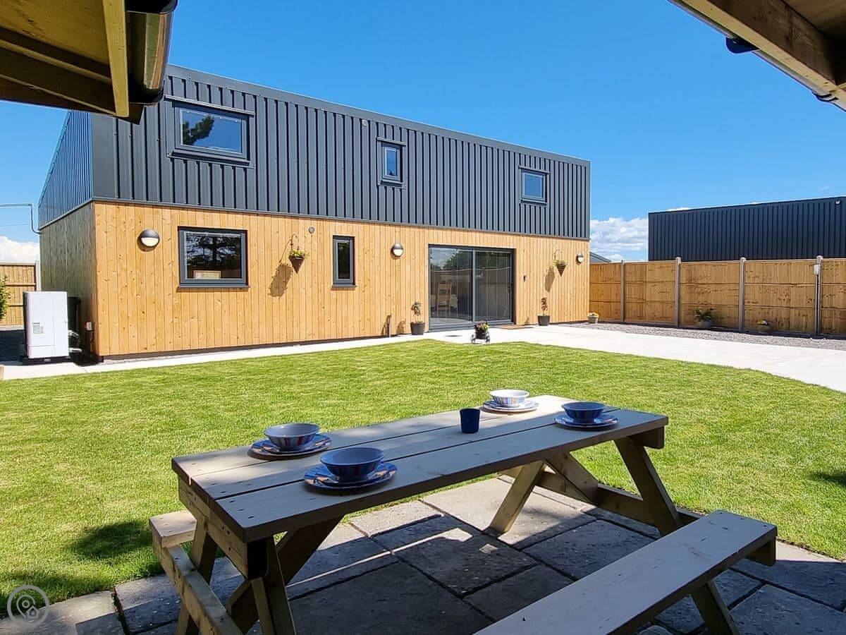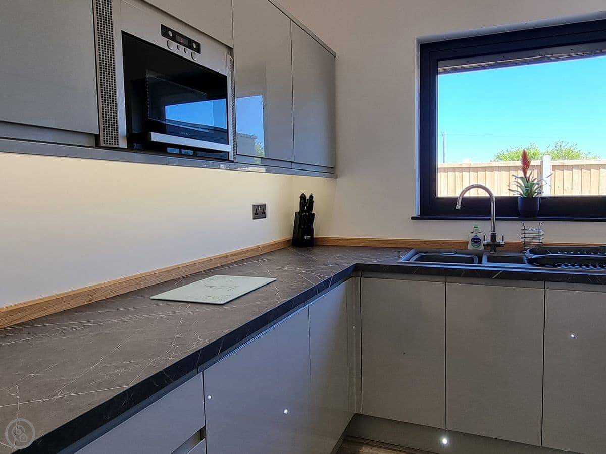 It's got a five star rating, which means it's kitted out to a high standard. Underfloor heating throughout. Smart TVs in every bedroom. The kitchen is large and open plan with a big table.