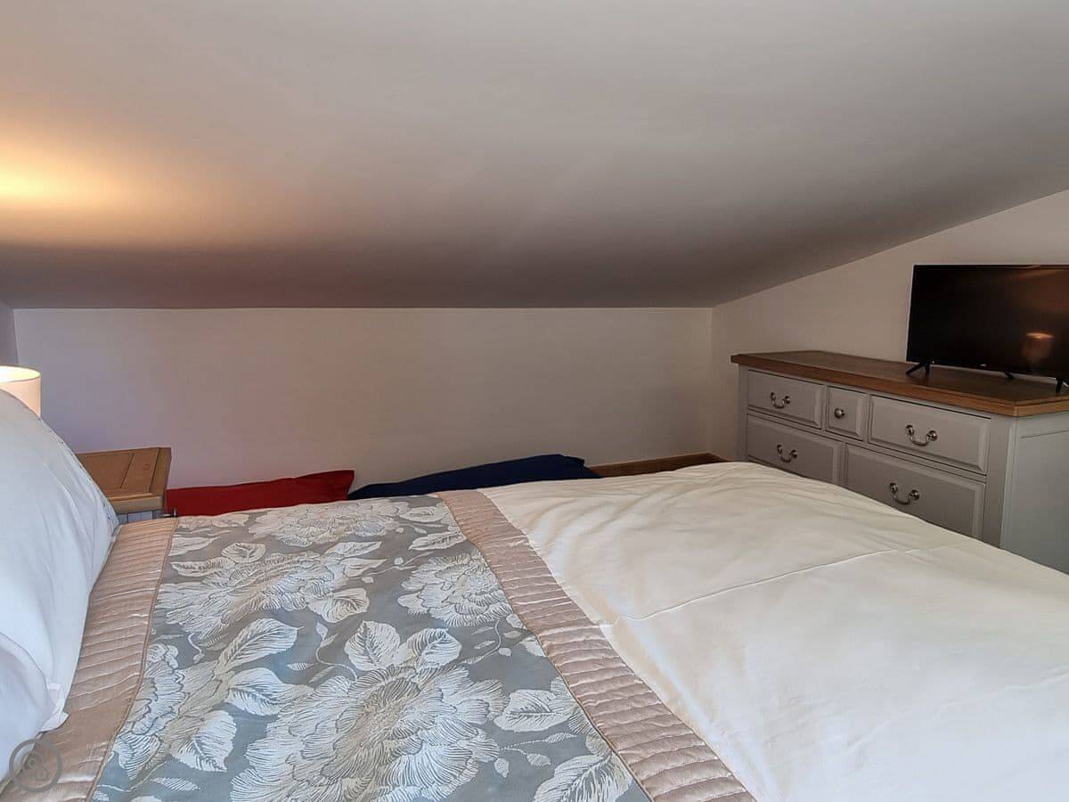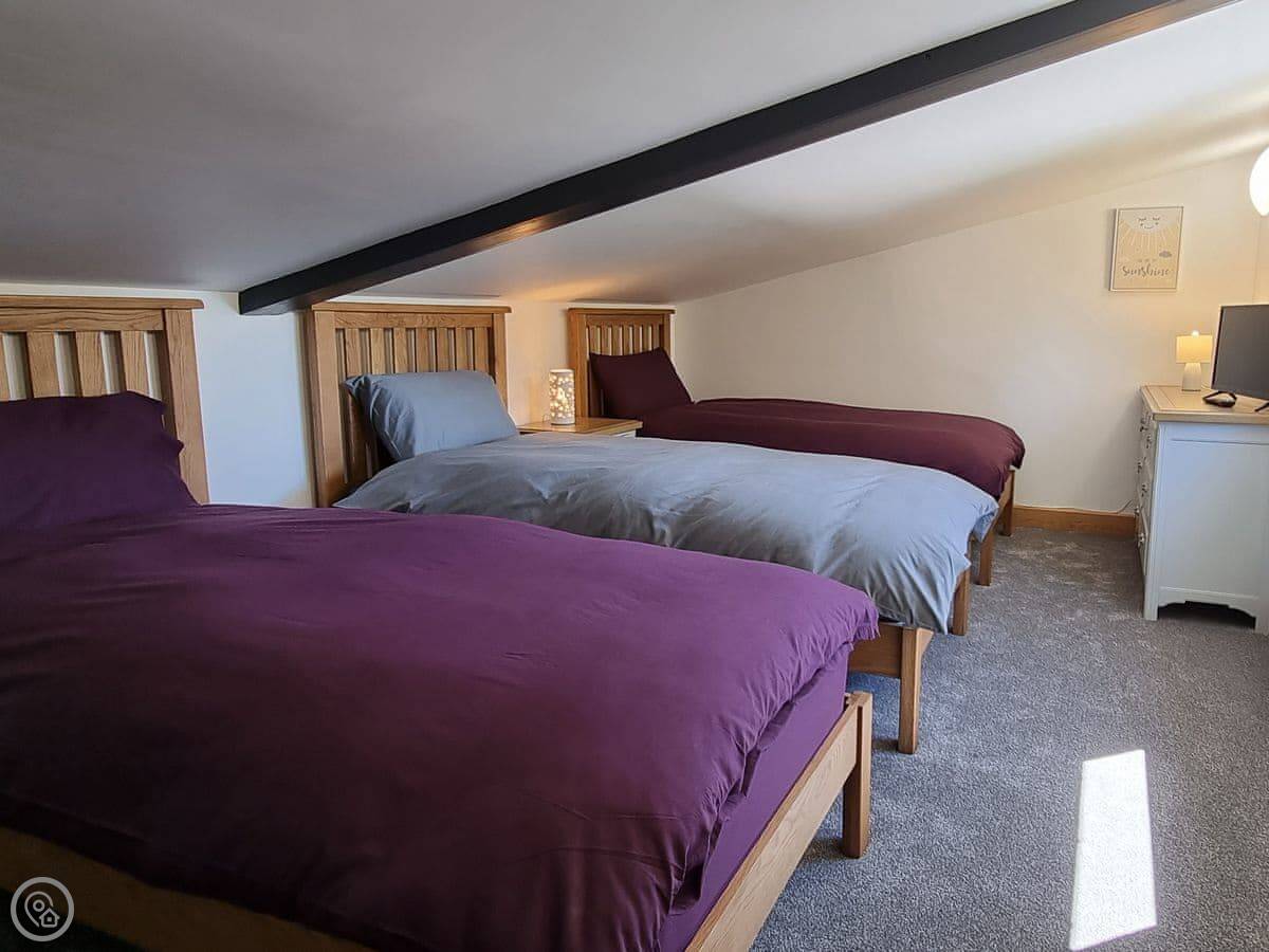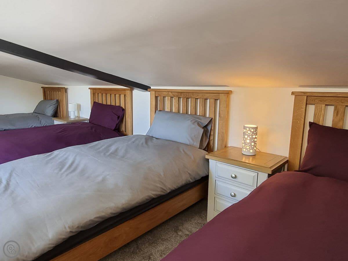 Three bedrooms are on the ground floor, which includes a king-size with an en-suite. Upstairs there are two more bedrooms, one with four singles. The ceiling is low up there, so mind your head.