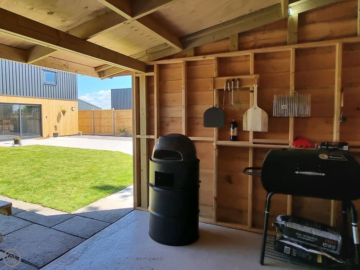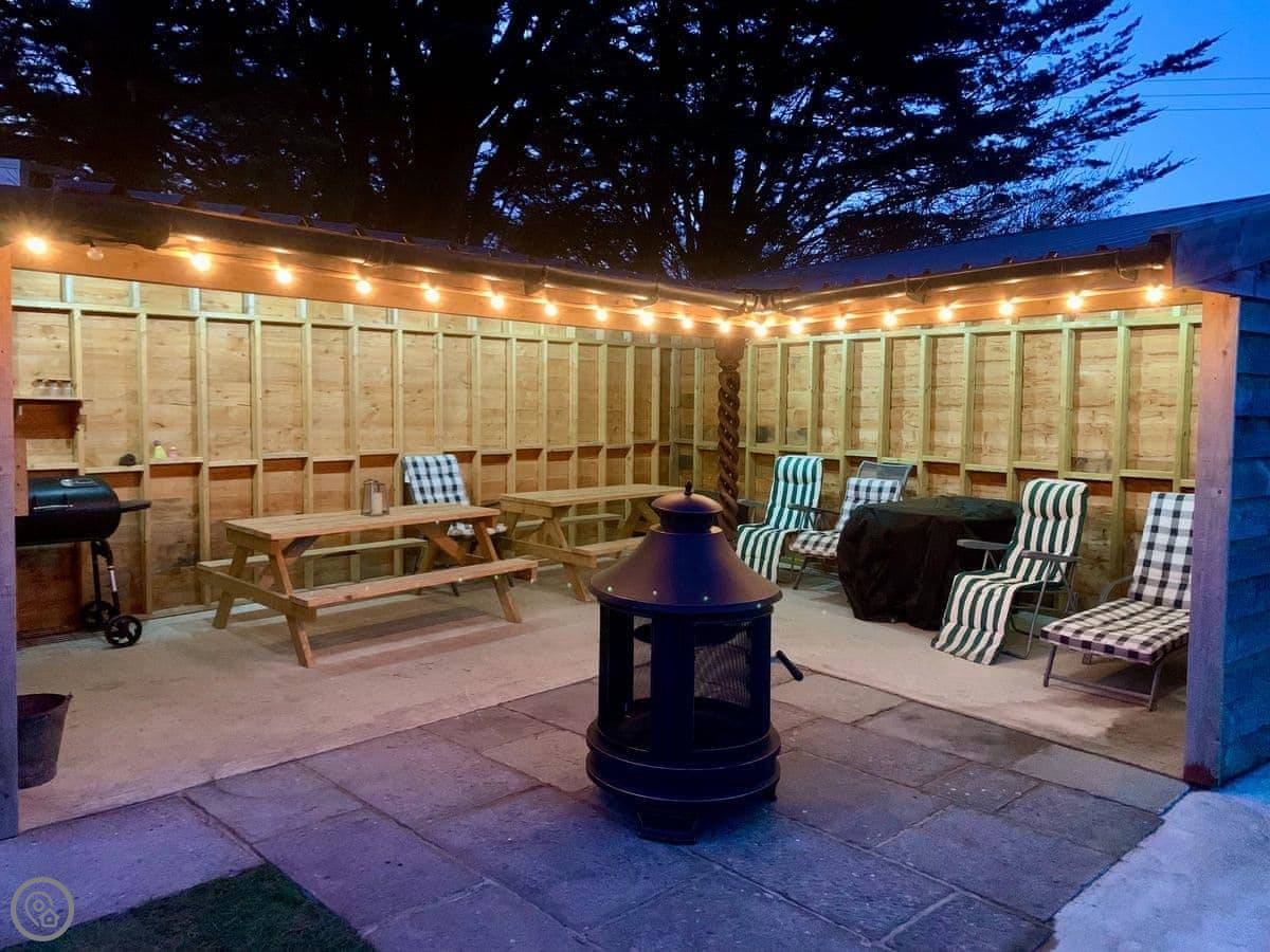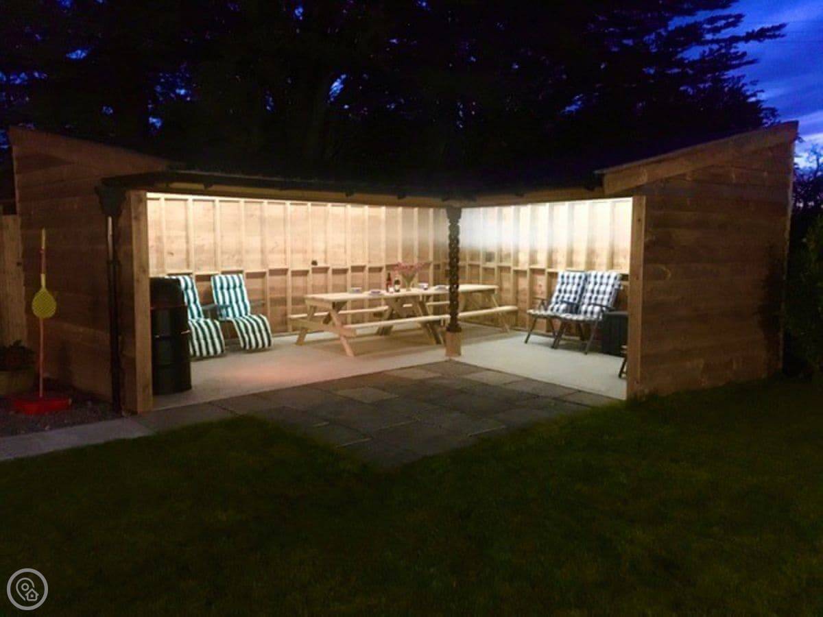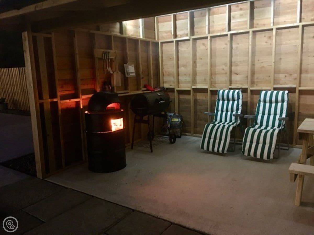 The garden is large and enclosed. There's a covered terrace outside with a pizza oven, a BBQ, and some outdoor games. It's lit for the evening.