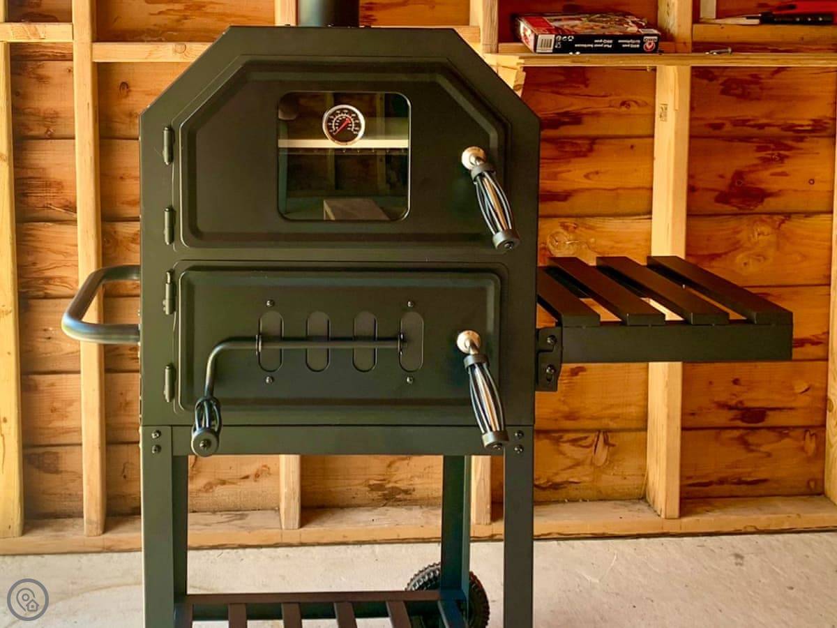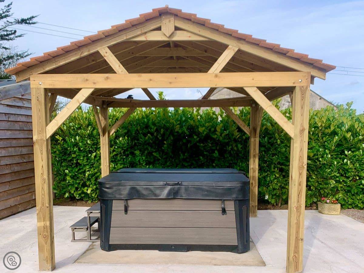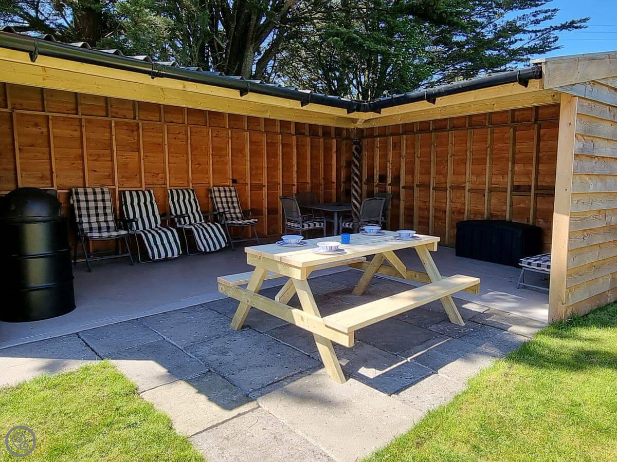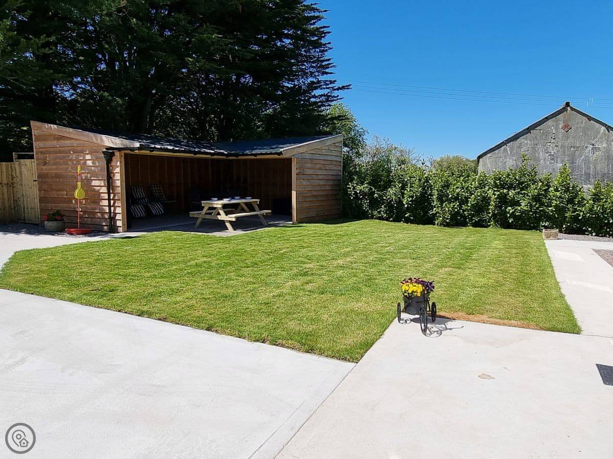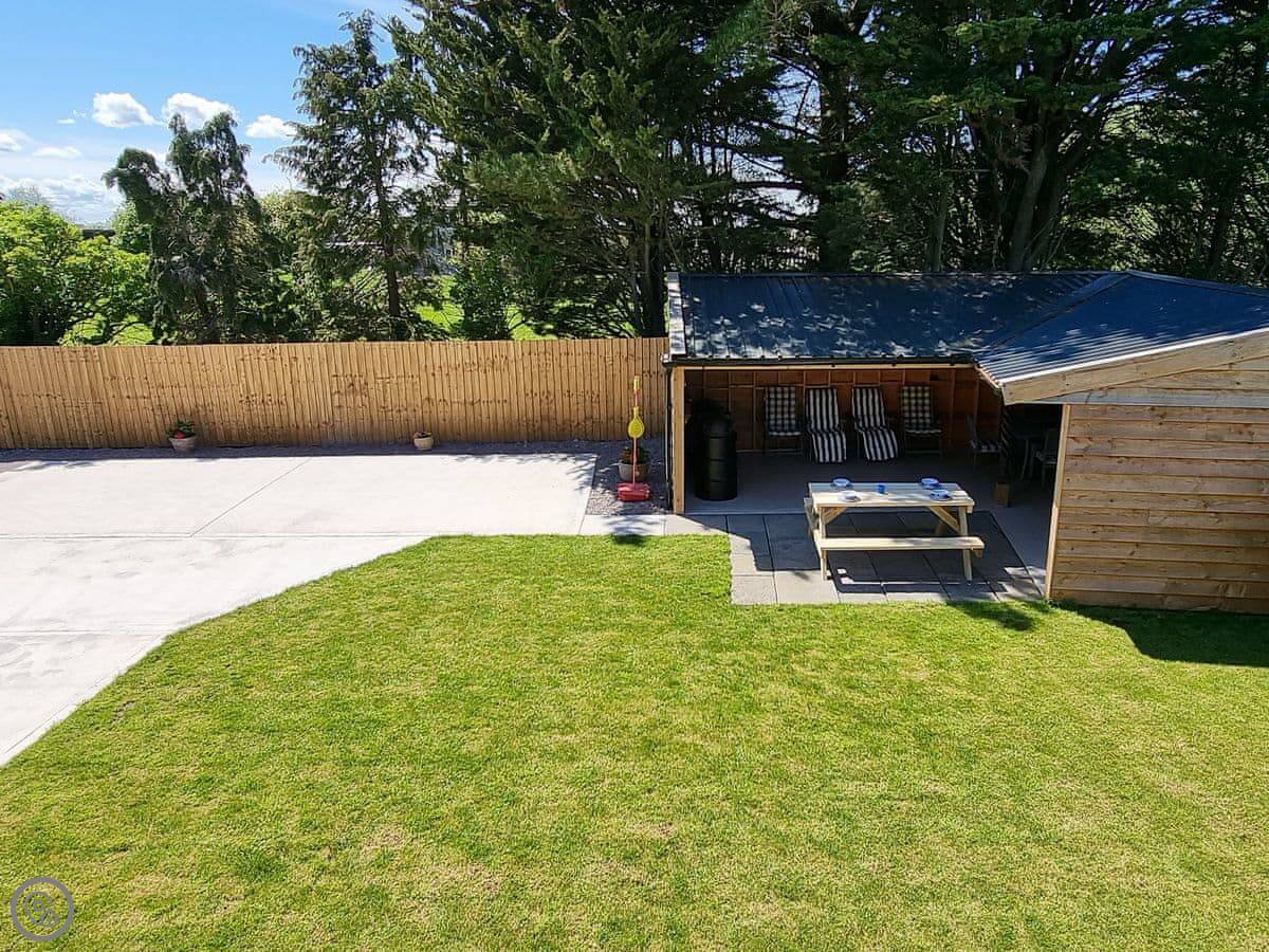 The garden is large and enclosed. There's a covered terrace outside with a pizza oven, a BBQ, and some outdoor games. It's lit for the evening.