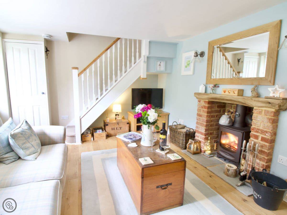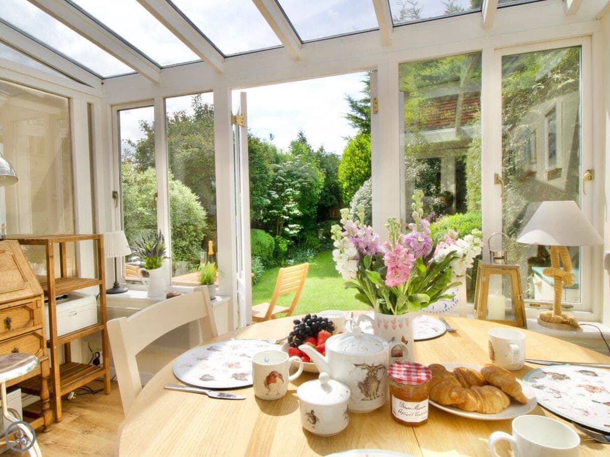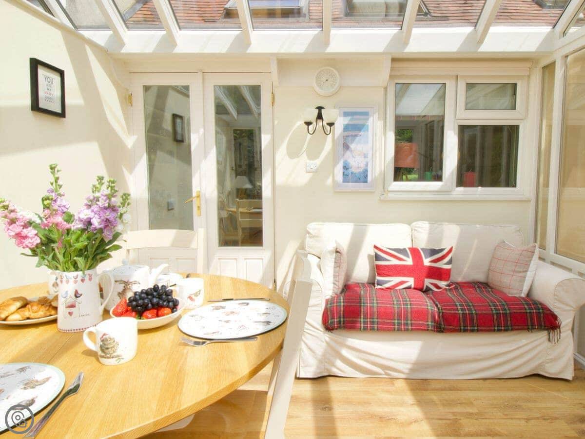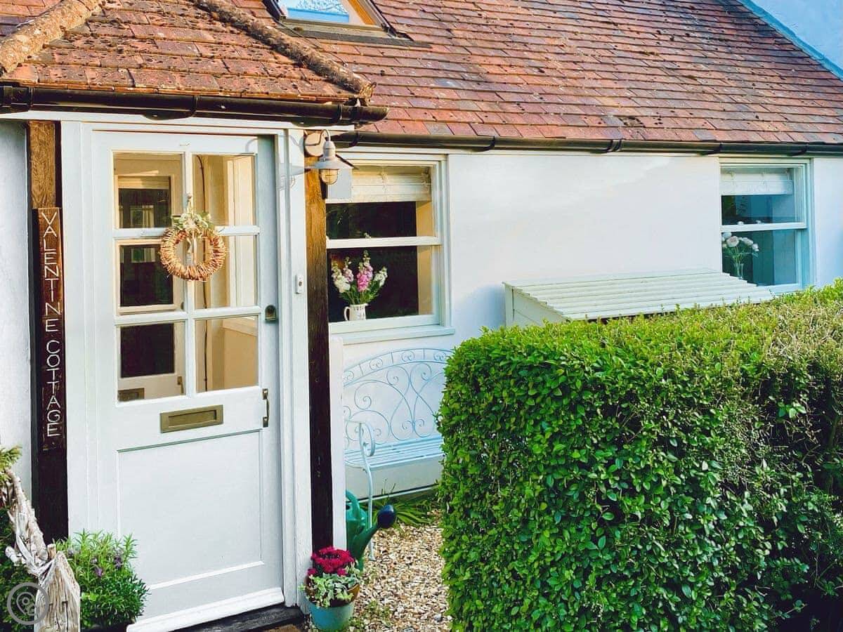 Valentine Cottage is a super cute 2-bedroom character cottage tastefully decorated in heritage colours with light oak floors throughout. Situated in the charming Hampshire village of Twyford nestled on the edge of the South Downs National Park the private enclosed rear garden and rural location create an idyllic setting for a romantic getaway. The welcoming sitting room has comfortable seating for four with a wood burner set in a feature fireplace making an ideal setting for relaxing evenings after exploring the many surrounding attractions. Leading off the sitting room is a cosy snug with a collection of books and a selection of spirits which can be enjoyed in return for a small donation, so why not treat yourself to a read over a nightcap. There are even books with cocktail recipes if you are feeling adventurous. The kitchen is well-equipped with everything you need to make your stay comfortable including a retro fridge freezer, Lavazza coffee machine machine, and a dishwasher, as who wants to do the dishes when you are on holiday? The dining area is in the heated conservatory with French doors opening out onto the pretty garden - great for year-round dining options. There is also a writing bureau and a comfortable sofa which is ideal for a relaxing drink. There is an easily accessible double bedroom downstairs with plenty of wardrobe space, as well as a spacious wet room and utility room with a washing machine and tumble dryer. On the first floor, there is a spectacular double bedroom with vaulted ceilings and lovely views to the local park and cricket pitch. All beds have Egyptian cotton bed linen. Outside at the front is a comfortable bench and a bike store with chain, padlock and ground anchor, suitable for up to four bikes. Please request keys for the bike shed when you make your initial booking. At the rear there is a pretty enclosed garden with a barbecue and more outside seating.