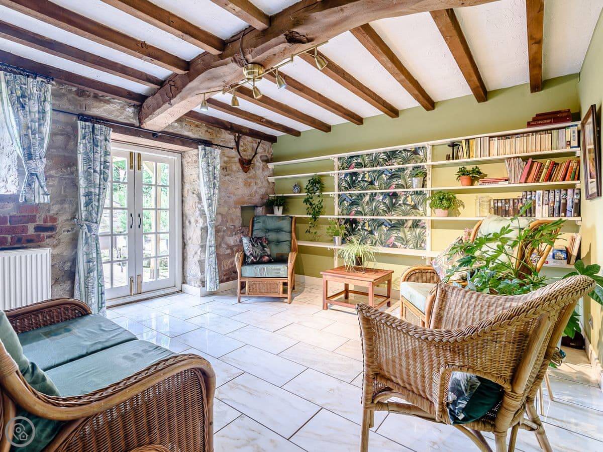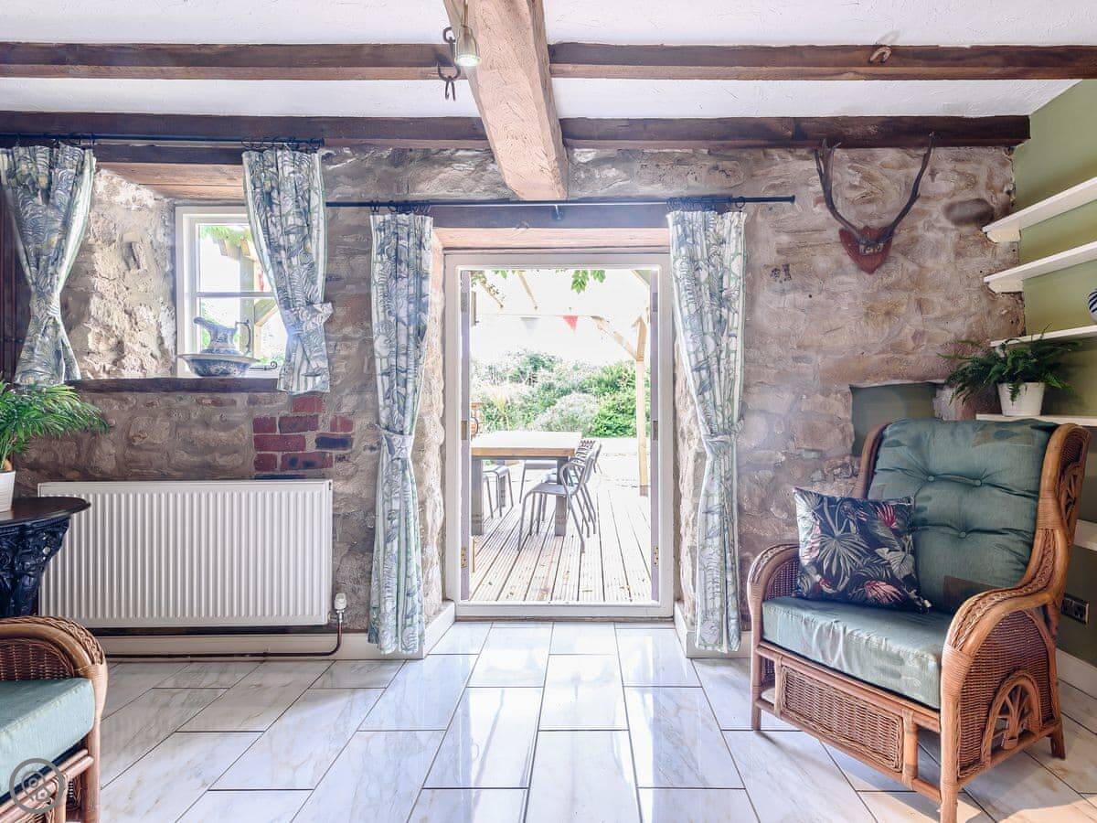 The kitchen is big and has a proper dining table. The living room has a woodburning stove. There's also a small snug room off to the side, which is quieter. Through there is a sunroom with doors out to the garden. The garden has a patio with a table and a barbecue. It's enclosed, so it's fine for dogs.