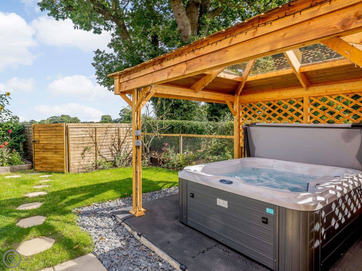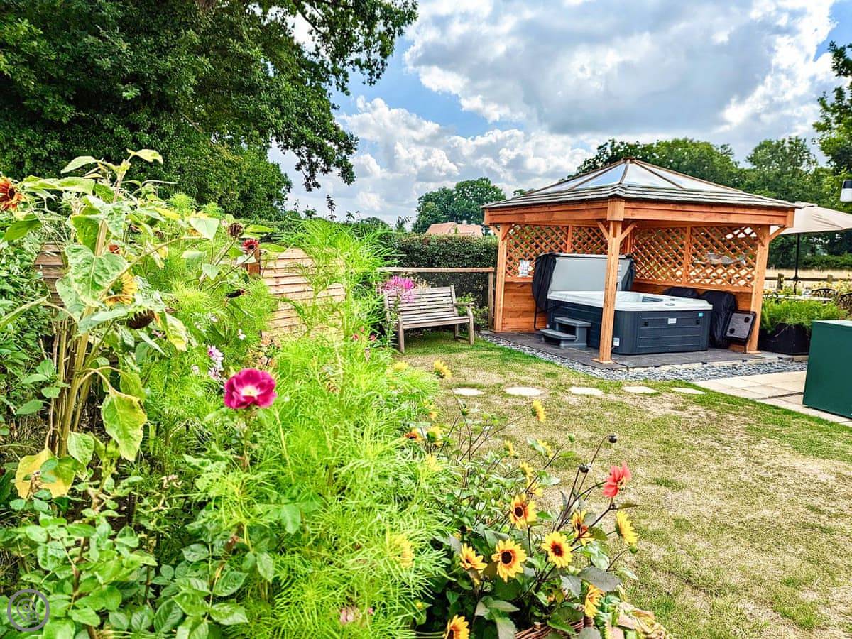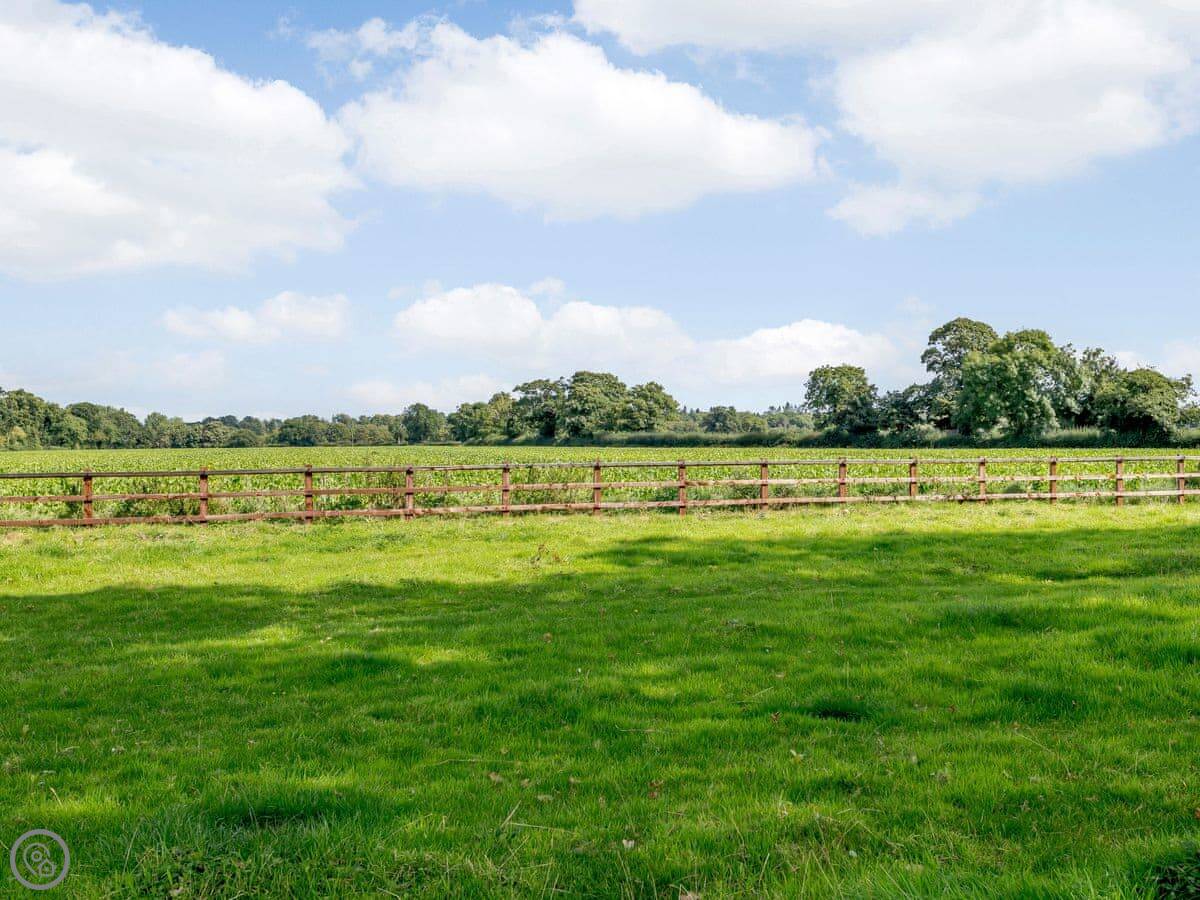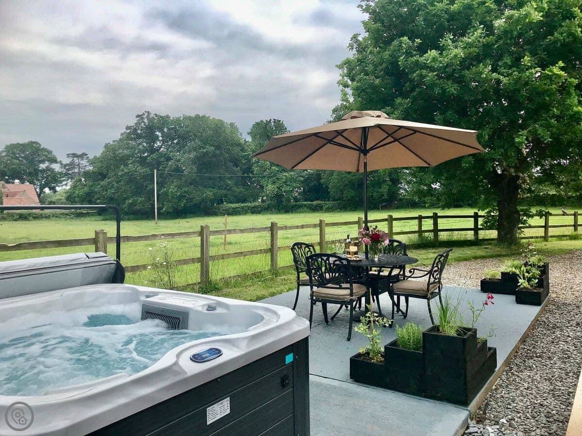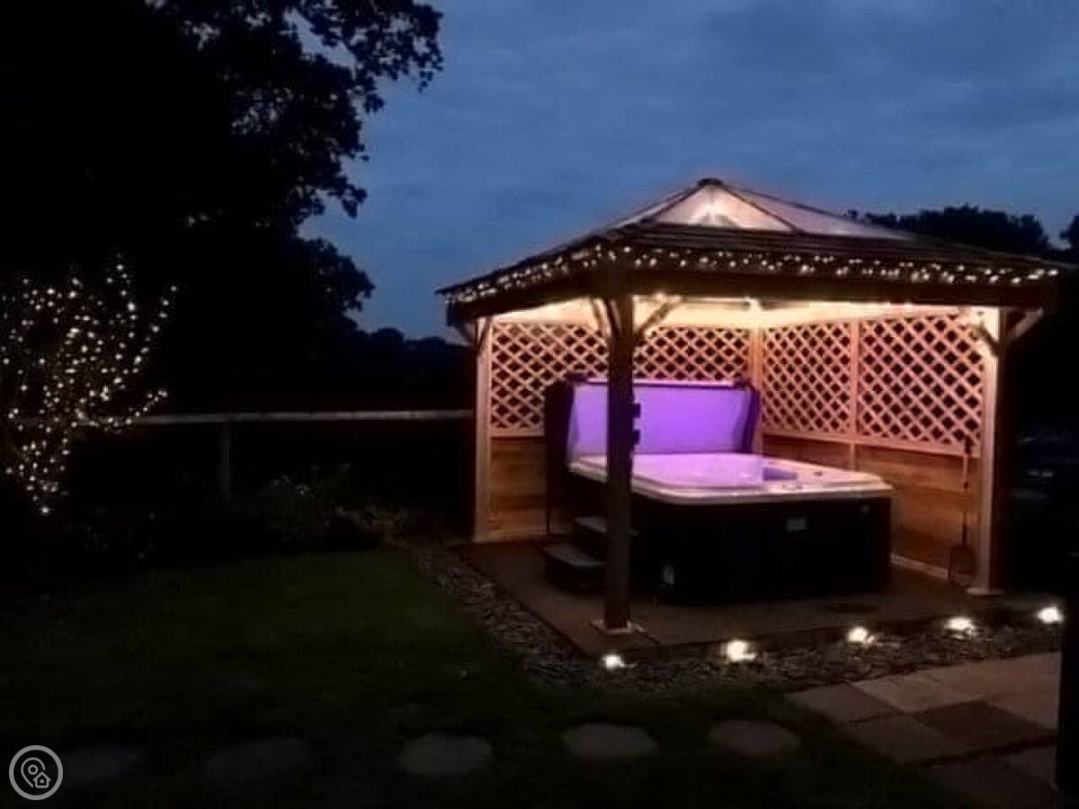 Inside, there's a separate living room and a kitchen with a wine fridge. There's a utility room with a washing machine. Outside, there's a hot tub in the garden. The garden looks out over fields and a horse paddock.