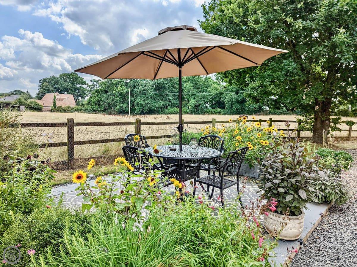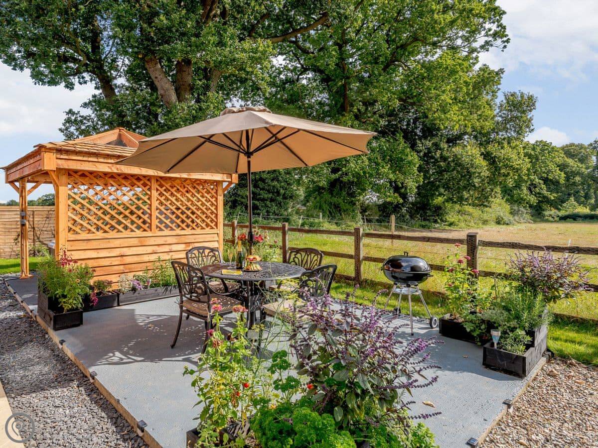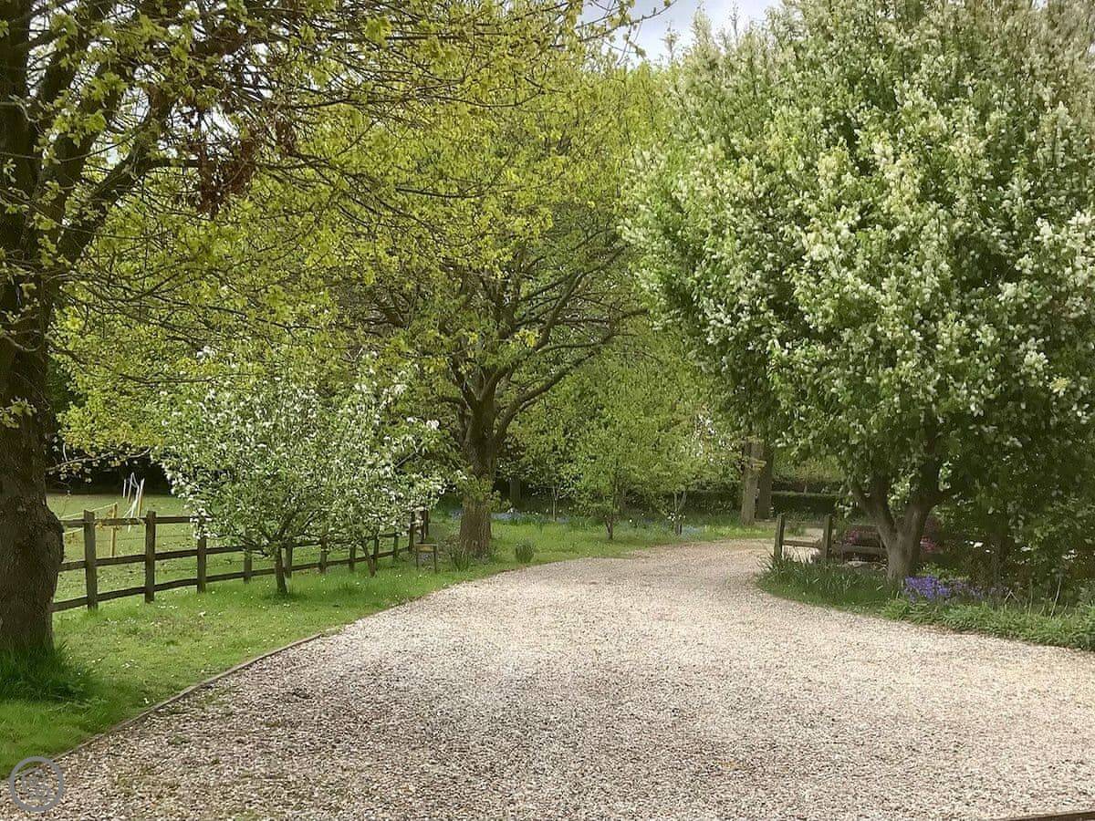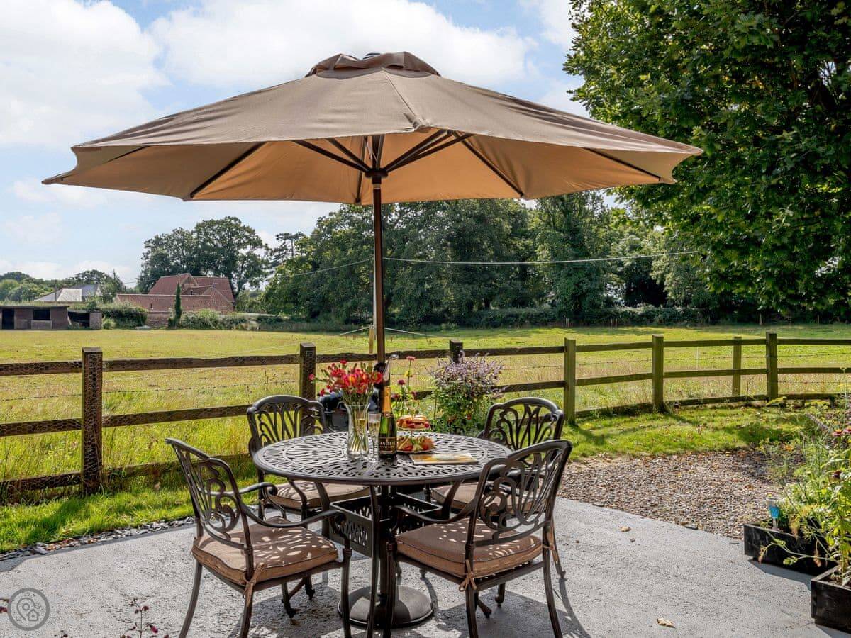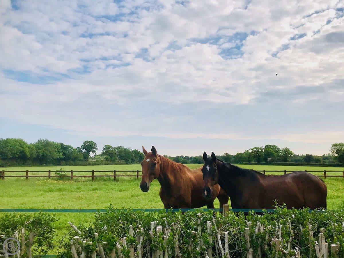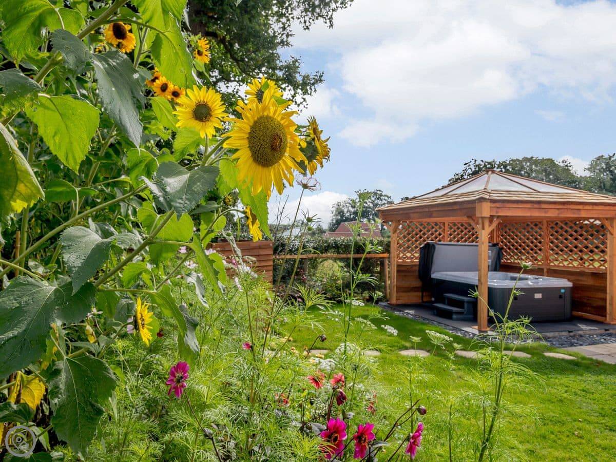 Inside, there's a separate living room and a kitchen with a wine fridge. There's a utility room with a washing machine. Outside, there's a hot tub in the garden. The garden looks out over fields and a horse paddock.