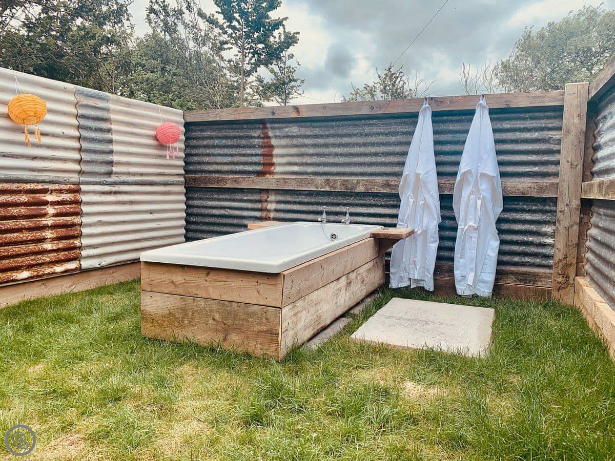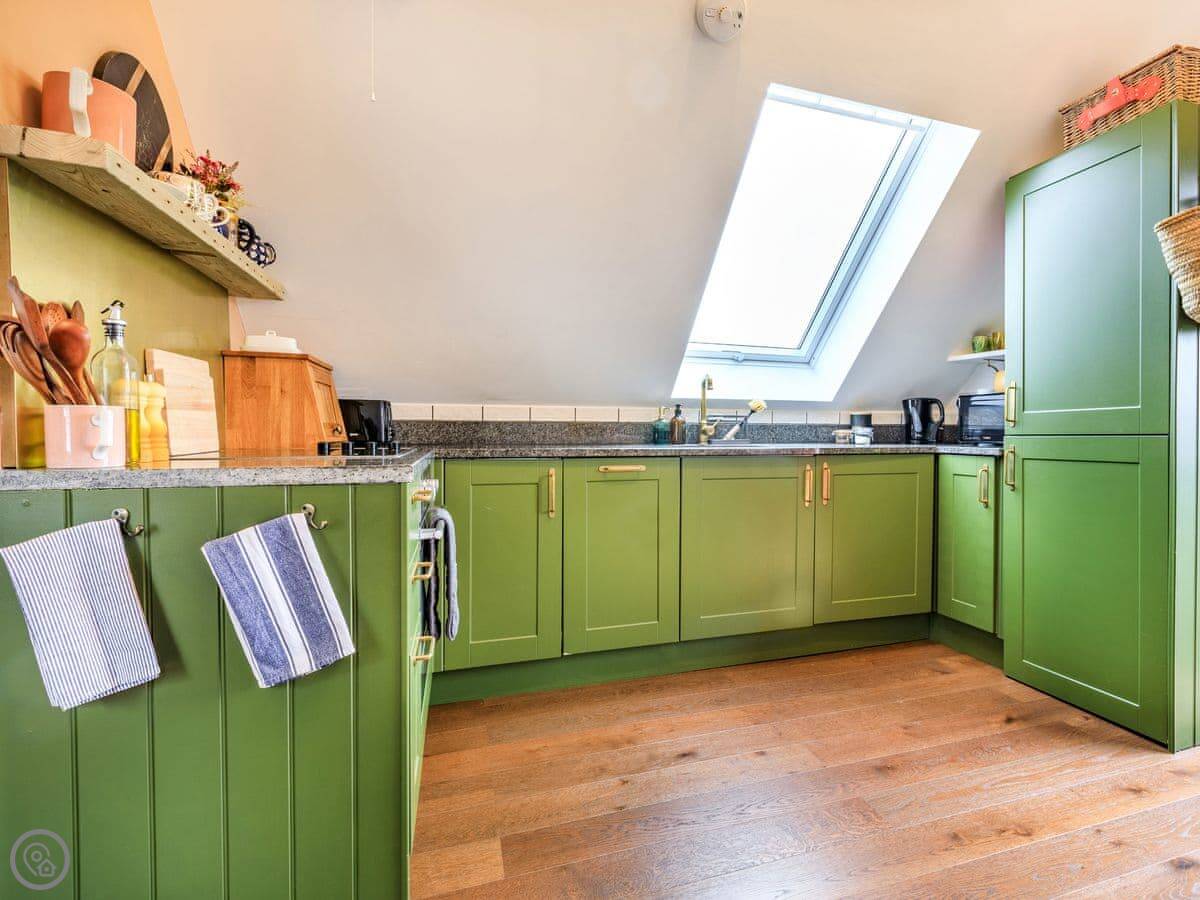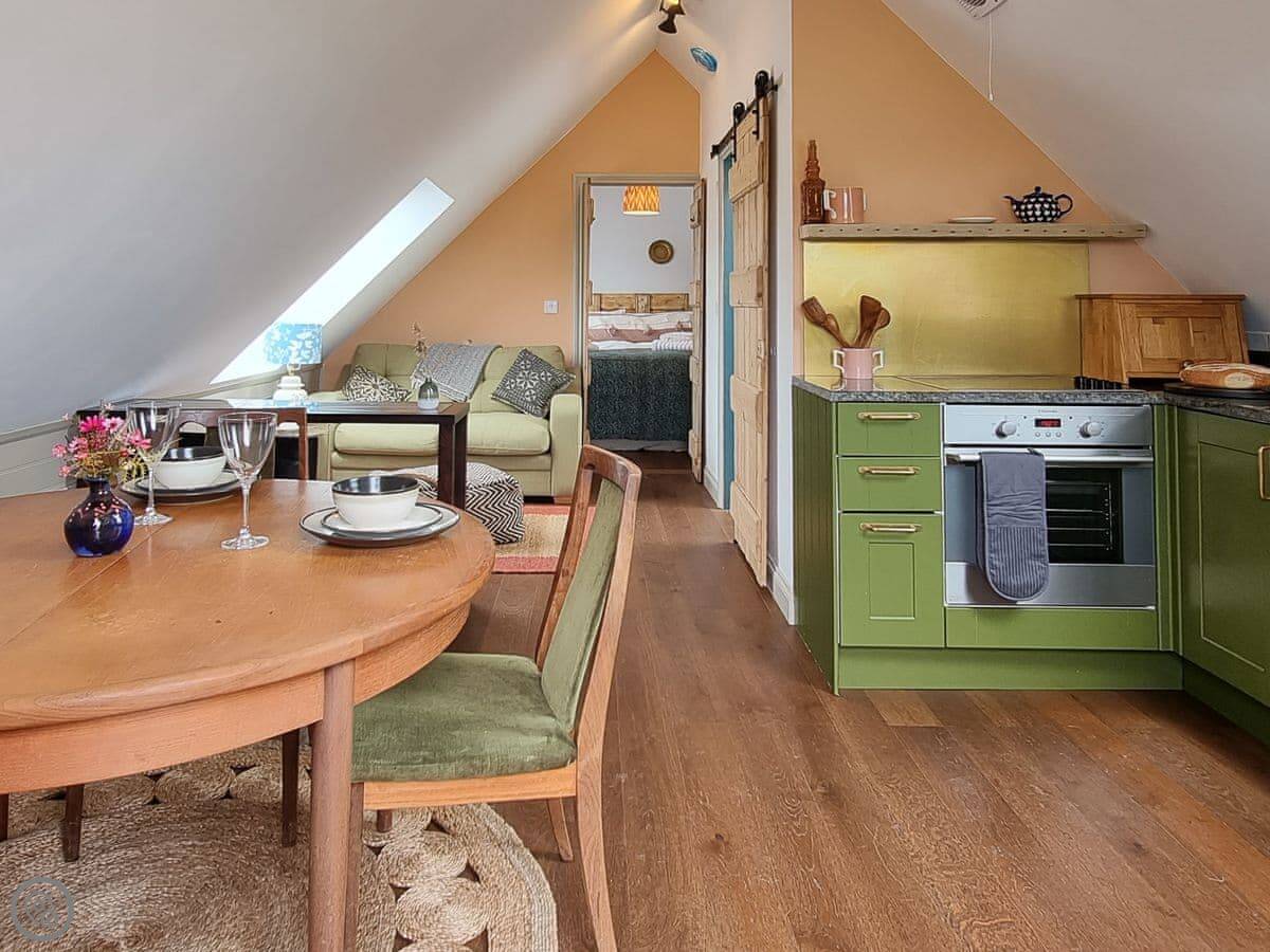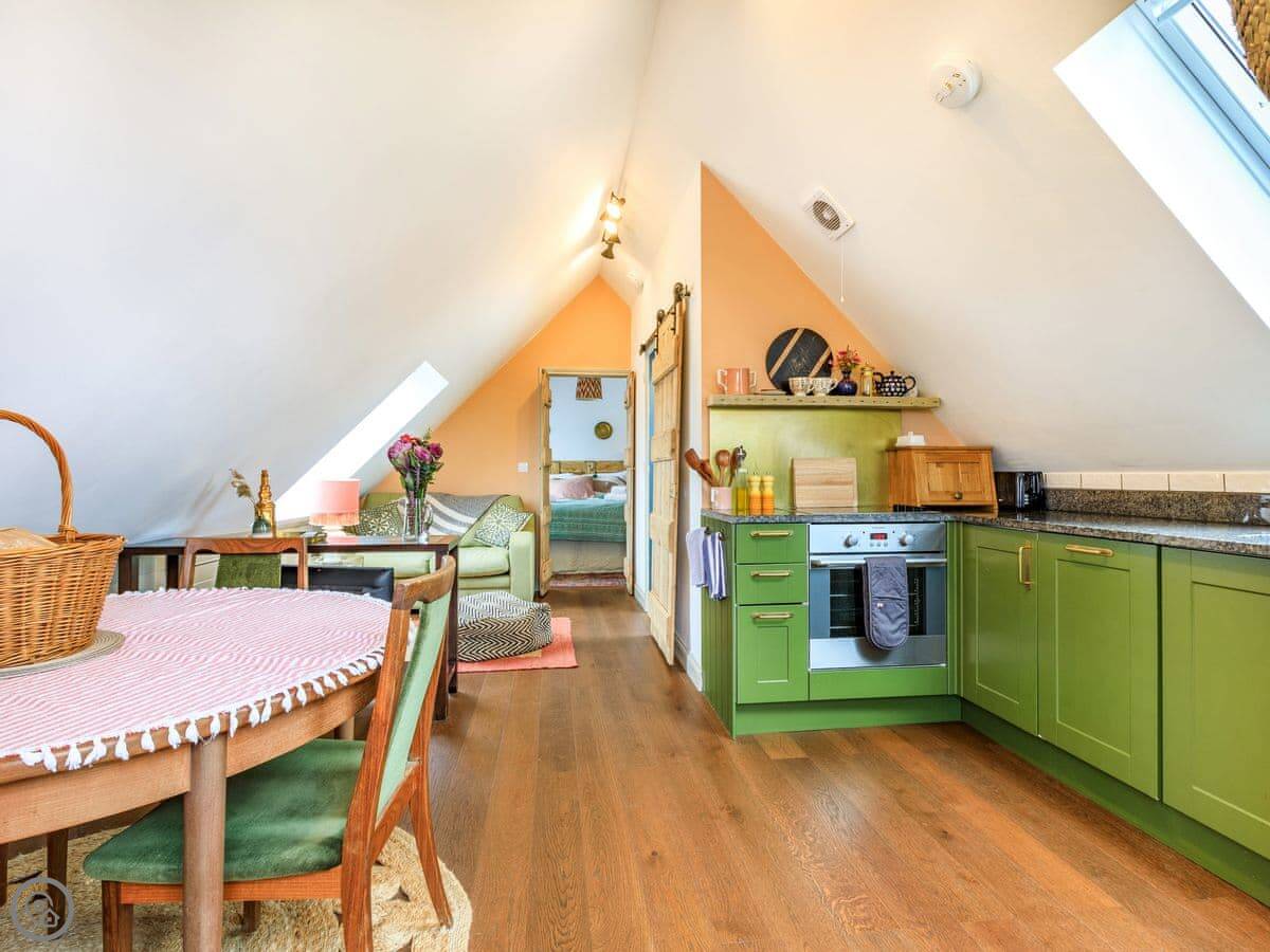 Head up the stairs and through the front door, where the open plan lounge, kitchen and dining areas welcome you in. The kitchen has been fully equipped with all you need to make anything from the simplest breakfast to a large meal, and it also has a dishwasher for easy clean up afterwards! The comfortable lounge/dining area is the perfect spot to sit back and relax after a day exploring Somerset’s attractions. The spacious bedroom has a super kingsize zip and link bed, making it perfect for a couple or friends, and it also has plenty of built-in storage for your belongings. The wonderful shower room has a walk-in shower with quirky brass shower head. Underfloor heating features throughout the apartment meaning you really can kick off your shoes and relax! Outside you have your private and secluded garden, with a lovely lawned area with garden furniture and outdoor tub, why not grab a glass of bubbly, sit back and relax under the stars.