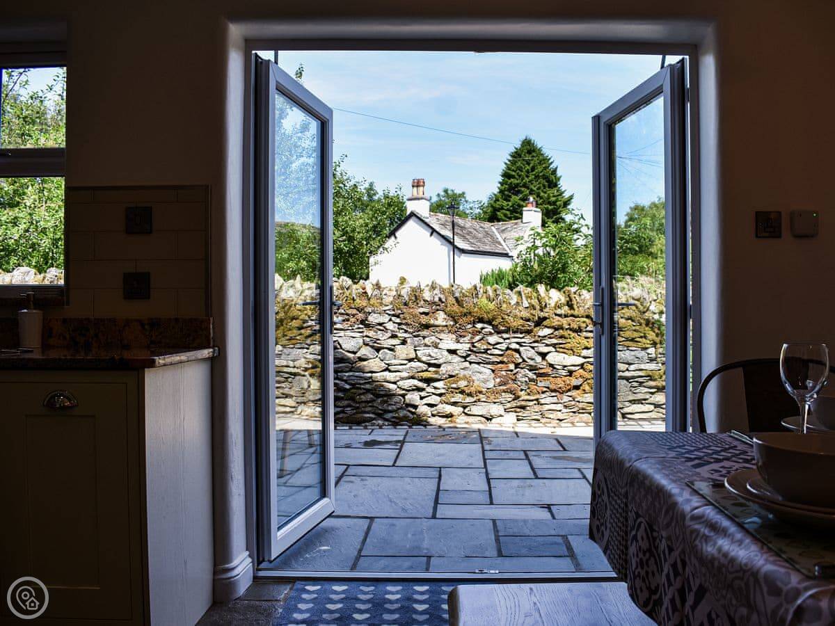 Conn Cottage is in Bampton, Cumbria. It's a detached stone cottage, just off the road. There's a stream right next to it that used to power the old corn mill. The view from the back is over that.
