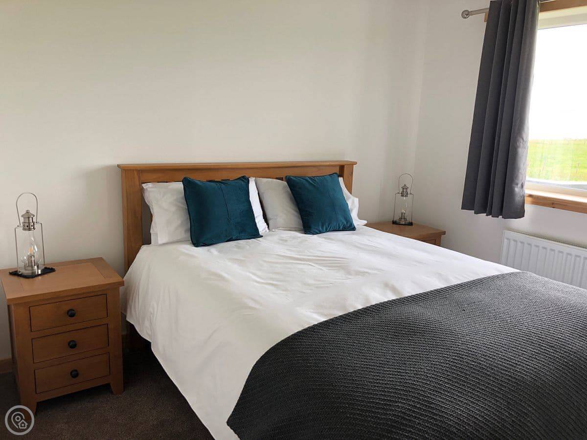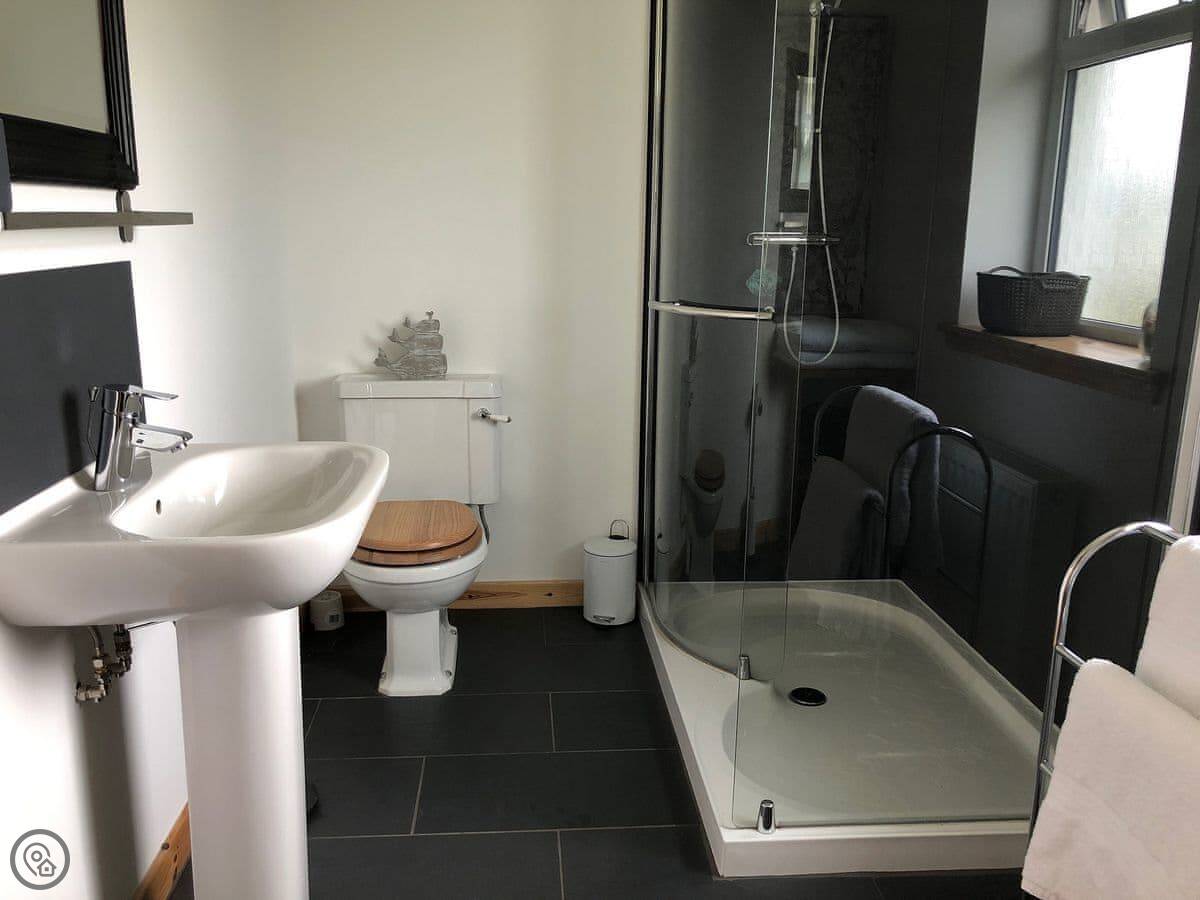 There’s a fantastic open plan kitchen/dining/living space with doors out onto the garden. There are two spacious bedrooms, a double and a twin. A great family bathroom with double walk-in shower and outside, the enclosed garden is lovely with a decking area to sit out late in the summer amazed at the midnight blue skies. From the garden you can see across the fields of sheep to the wild north Atlantic; It’s a very special spot indeed. Also, there’s a utility/games room in the outbuilding with washing machine and table tennis table. The outbuilding is also a great place to store bikes, canoes, surfboards, etc.